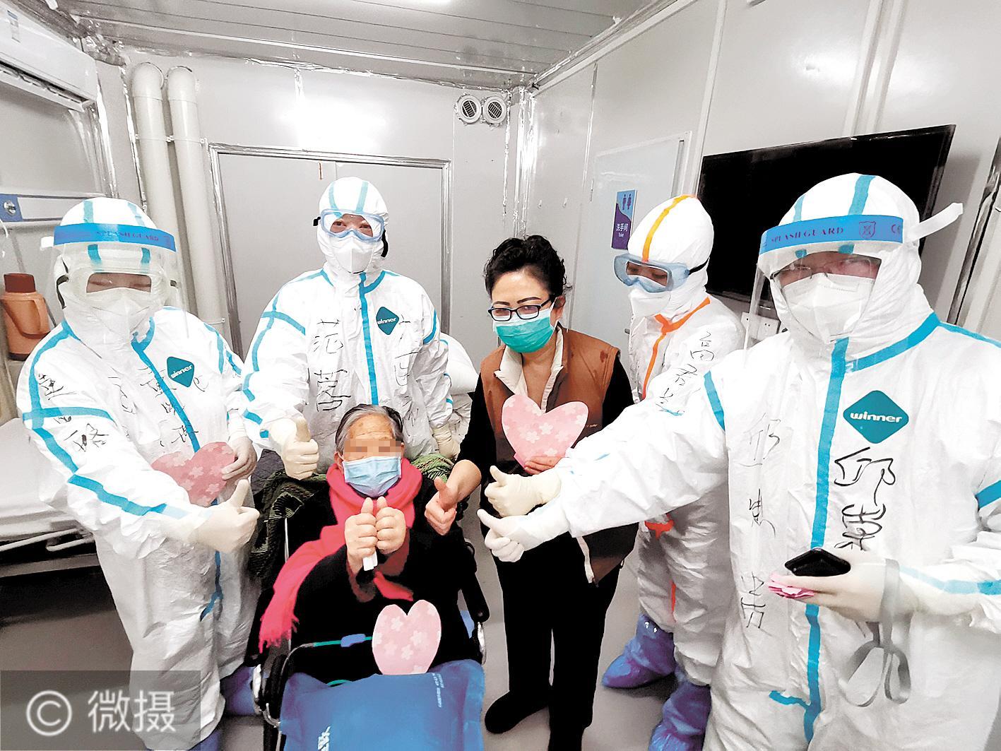 3月1日上午11时,98岁的胡婆婆和她55岁的女儿丁女士,一起从武汉雷神山医院康复出院。胡婆婆是目前全国最高龄的新冠肺炎危重症康复患者。出院前,胡婆婆与医务人员合影,双手点赞。湖北日报(视界网 高翔 摄)