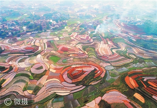2月22日,在南宁市邕宁区蒲庙镇郊外农田,大地春妆宛如壮锦,展现出诗人笔下“暧暧远人村,依依墟里烟”的动人景致。广西日报 滕忠/摄