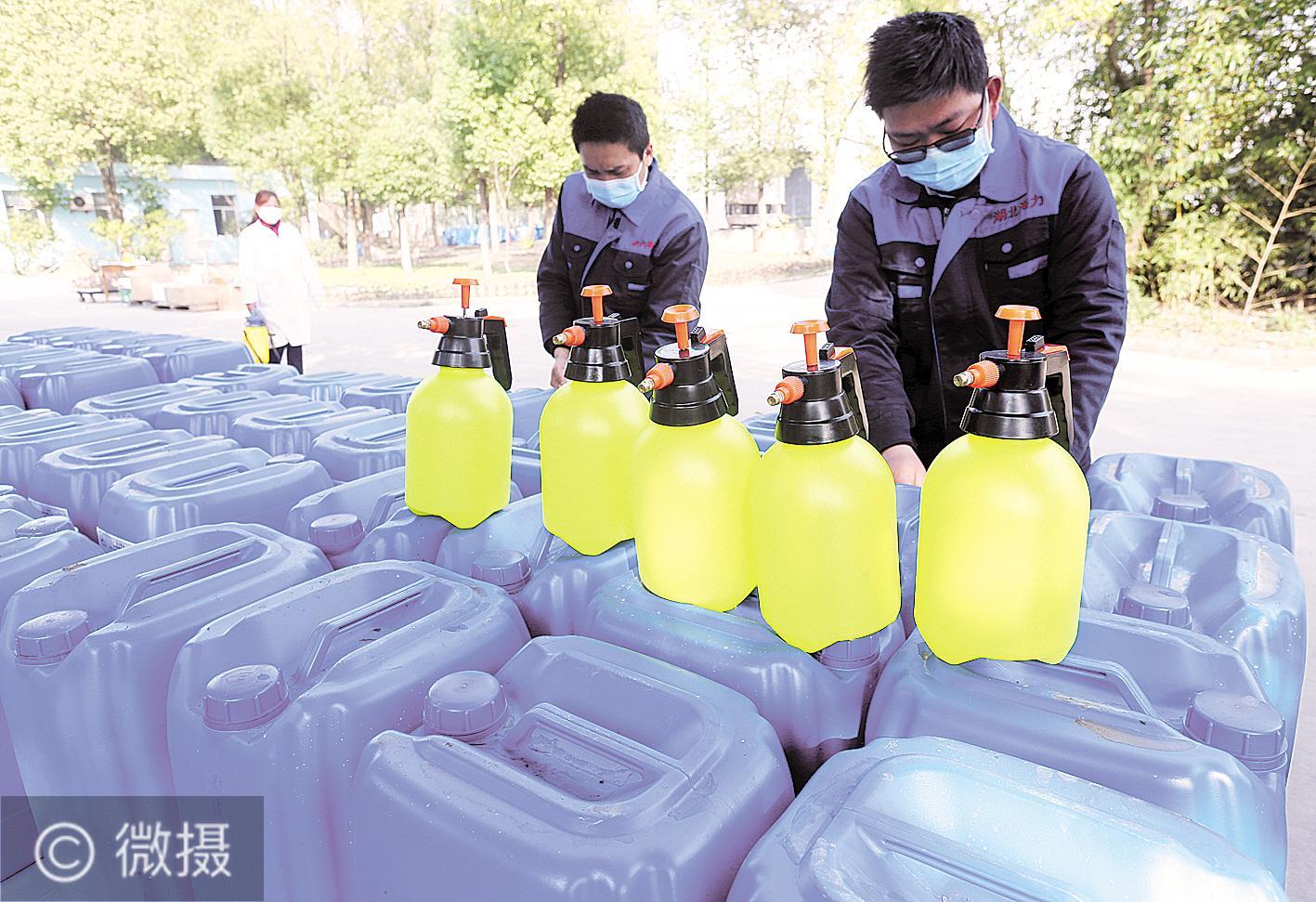 2月22日,葛店开发区,湖北海力环保科技公司员工准备启运一批84消毒液。新冠肺炎疫情防控战打响后,该公司昼夜加紧生产84消毒液、75医用消毒液和消毒器械,每天可生产消毒液70多吨。(湖北日报全媒记者 张鸿 通讯员 夏明光 张樱宁 摄)