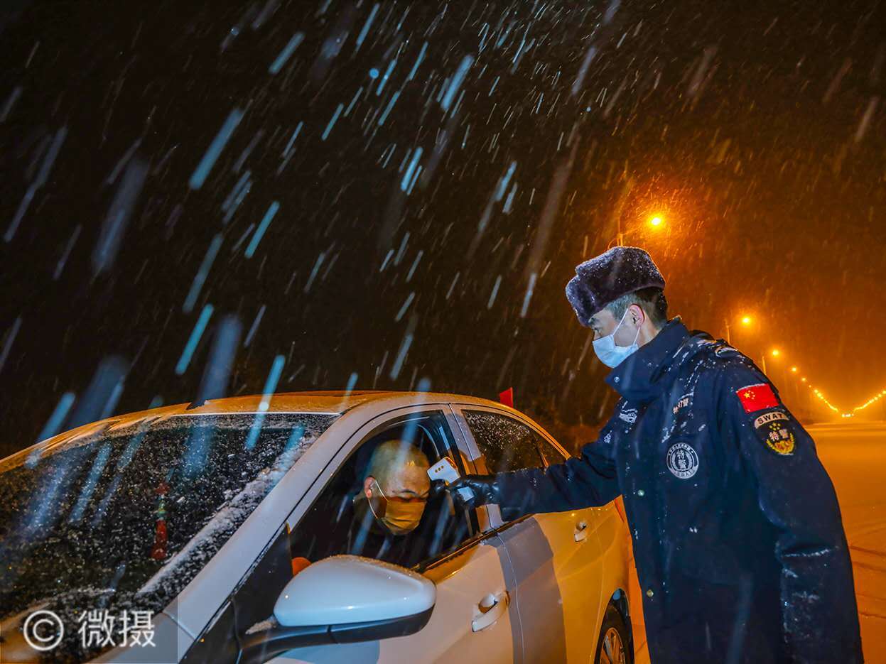 2月23日晚上,黑龙江省五大连池风景区下起大雪,战斗在疫情第一线的公安民警仍然在坚守着。郭柏林 摄影