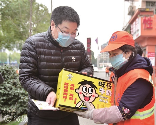 2月21日,旺旺集团长沙分公司工作人员为环卫工人送上爱心牛奶。当天,湖南省众善公益基金会联合该公司在长沙市芙蓉区芙蓉社区开展“以爱之名共战疫情——我们在行动”公益慰问活动,为战斗在防疫一线的工作人员捐赠牛奶、饼干、咖啡等价值36万元的爱心物资。湖南日报 廖如斯 摄