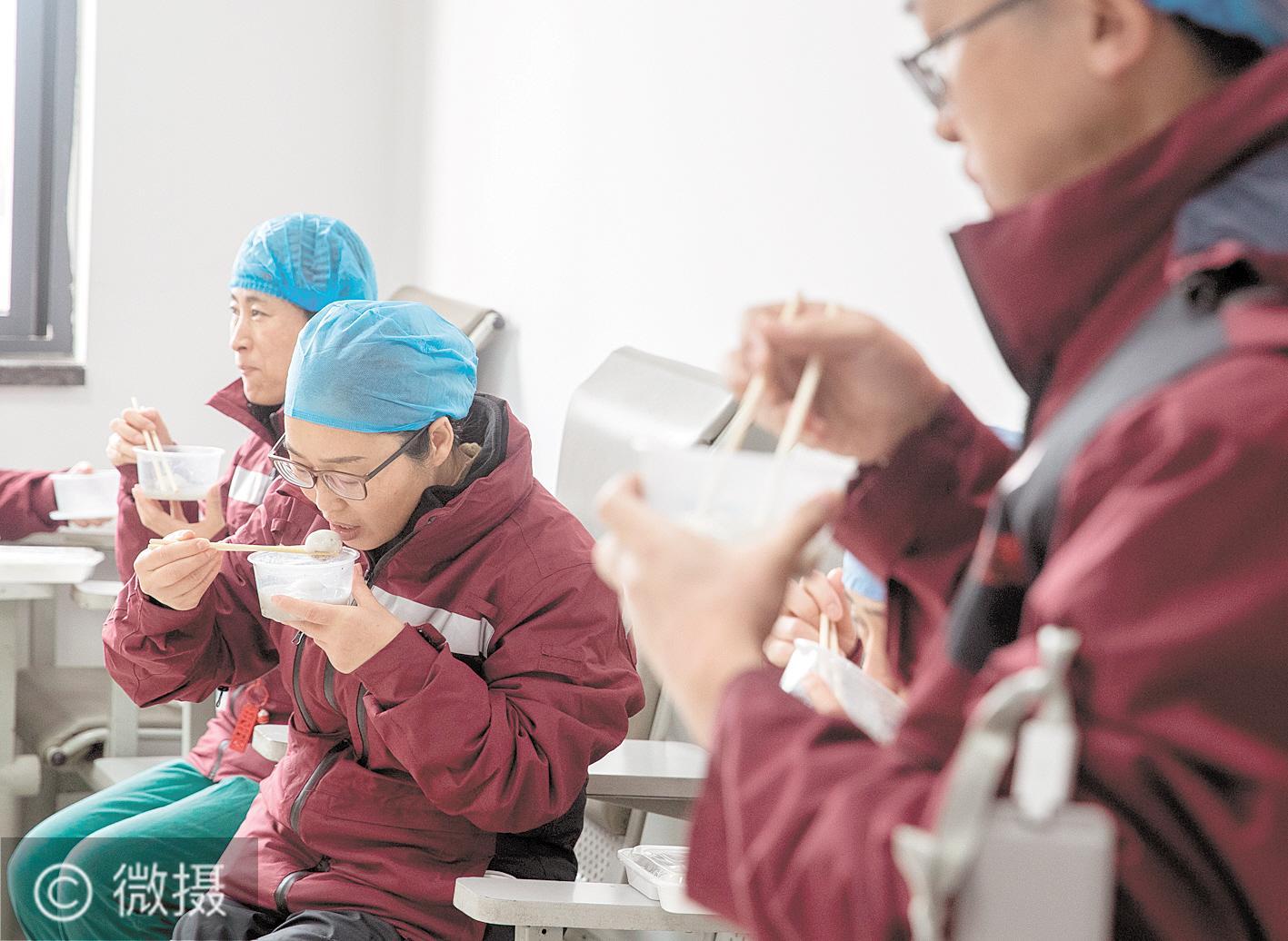 2月8日,福建医疗队队员在休息室吃上了热腾腾的汤圆。当天是元宵节,武汉市金银潭医院为来援助该院的各个医疗队送来汤圆,表达慰问和感谢。