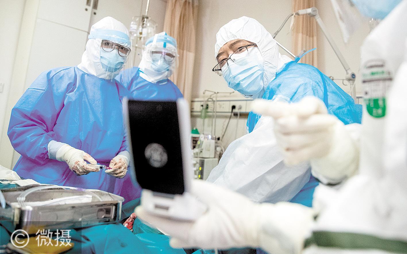 2月9日,武汉市红十字会医院ICU病房,四川医疗队和红十字会医院的医生正在共同协作运用ECMO技术抢救重症患者。湖北日报全媒记者 柯皓 摄