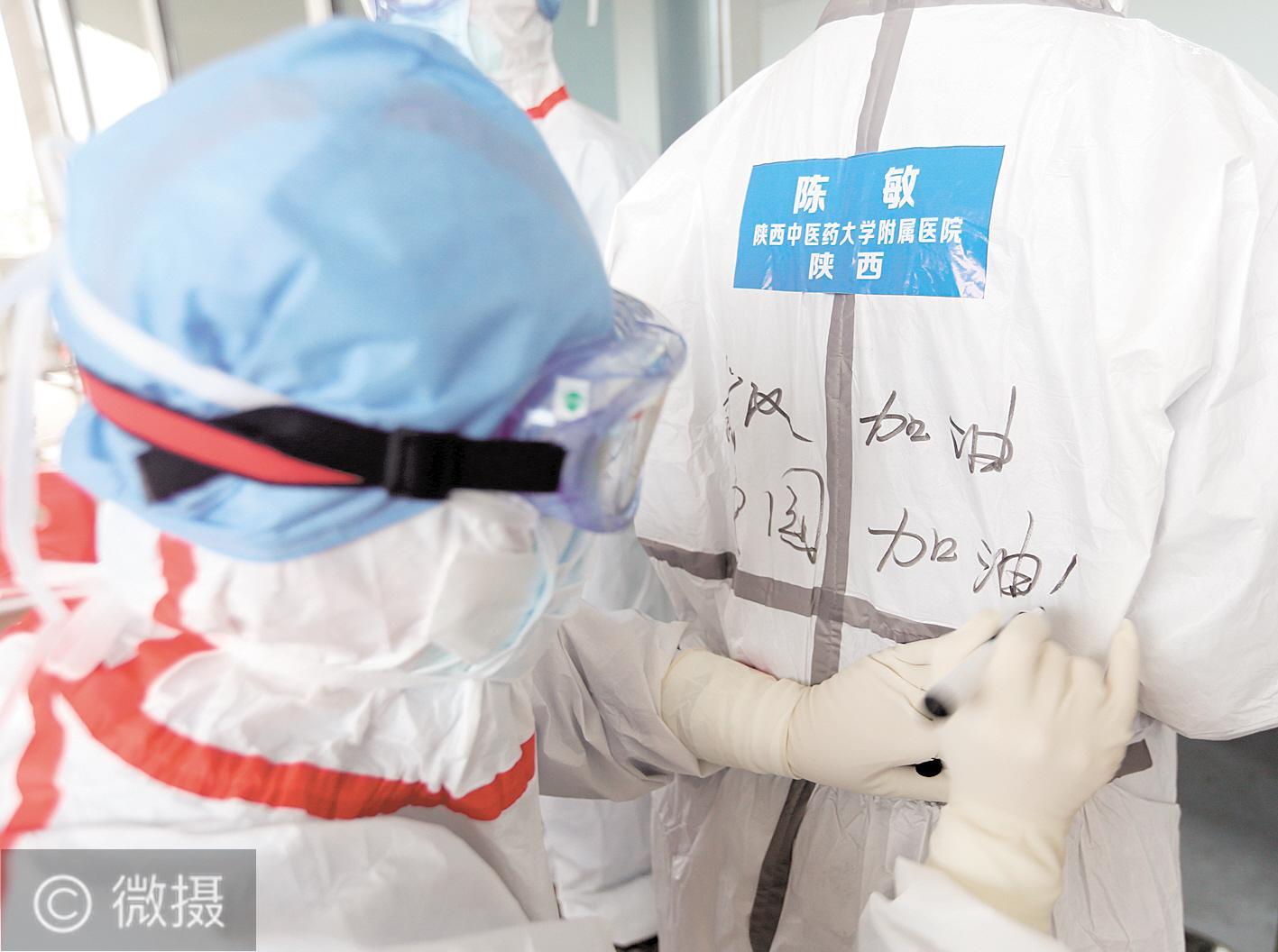 2月14日,在武汉市江夏方舱医院,陕西中医药大学附属医院援鄂医疗队护士陈敏与队友互相鼓励,为武汉加油。 (湖北日报全媒记者 张鸿 通讯员 王夫之 刘龙腾 摄)