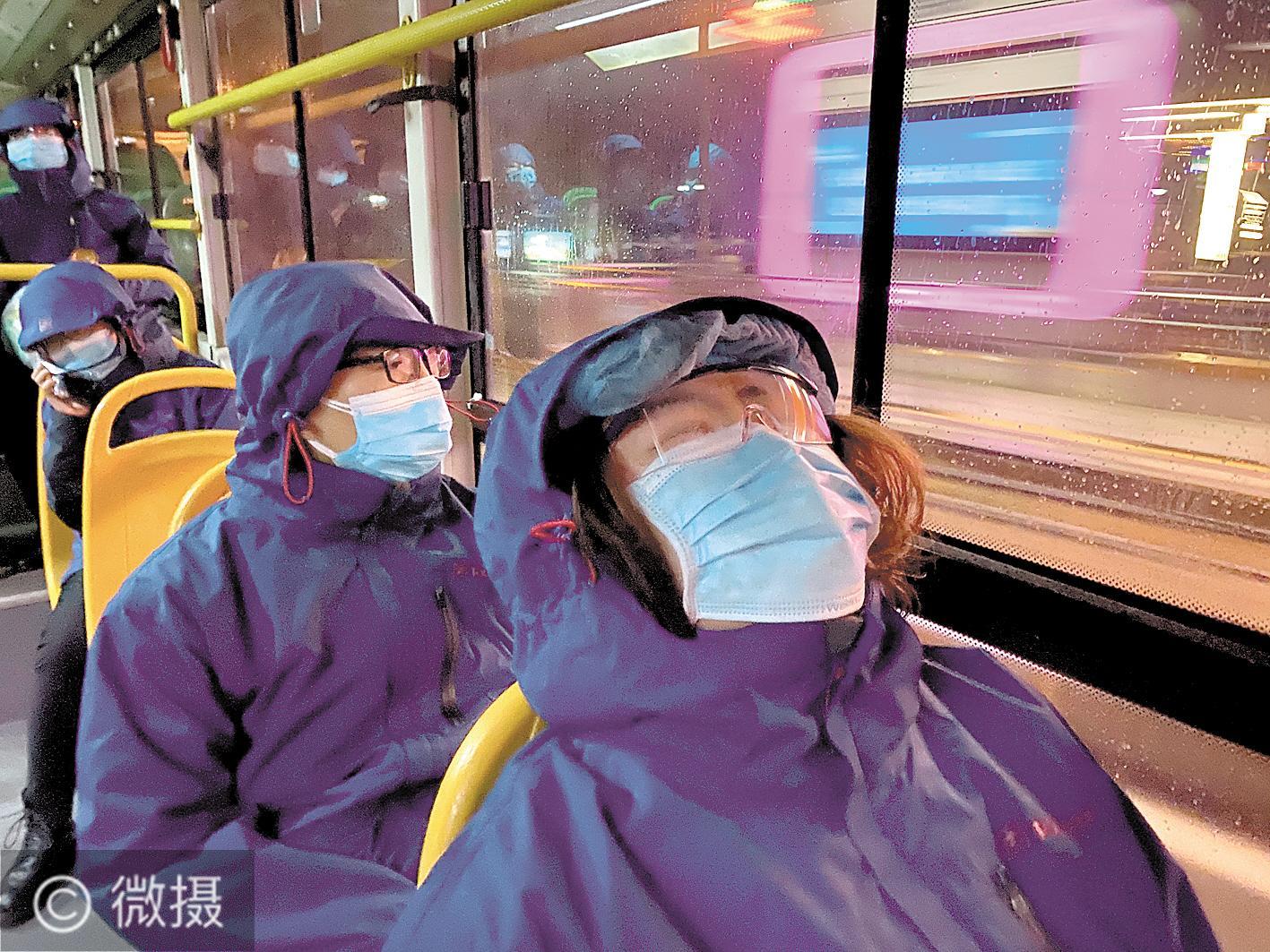 2月11日深夜,离开武汉大学人民医院隔离病房返回住地的公交车上,来自西安交大一附院的护士累得睡着了。湖北日报全媒记者 柯皓 摄
