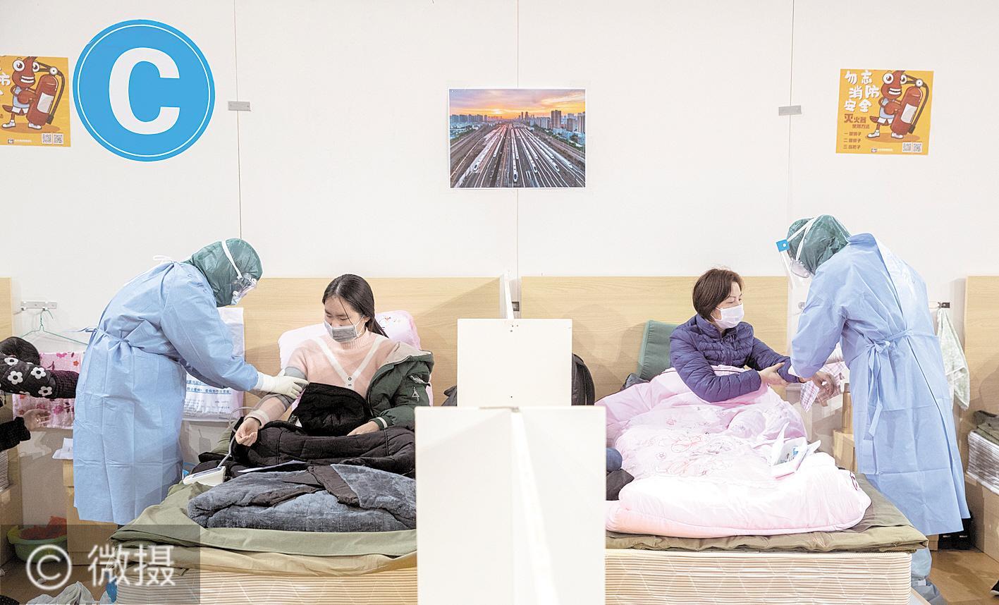 2月14日,武汉体育中心方舱医院,江苏医疗队护士为患者监测血压。湖北日报全媒记者 柯皓 摄