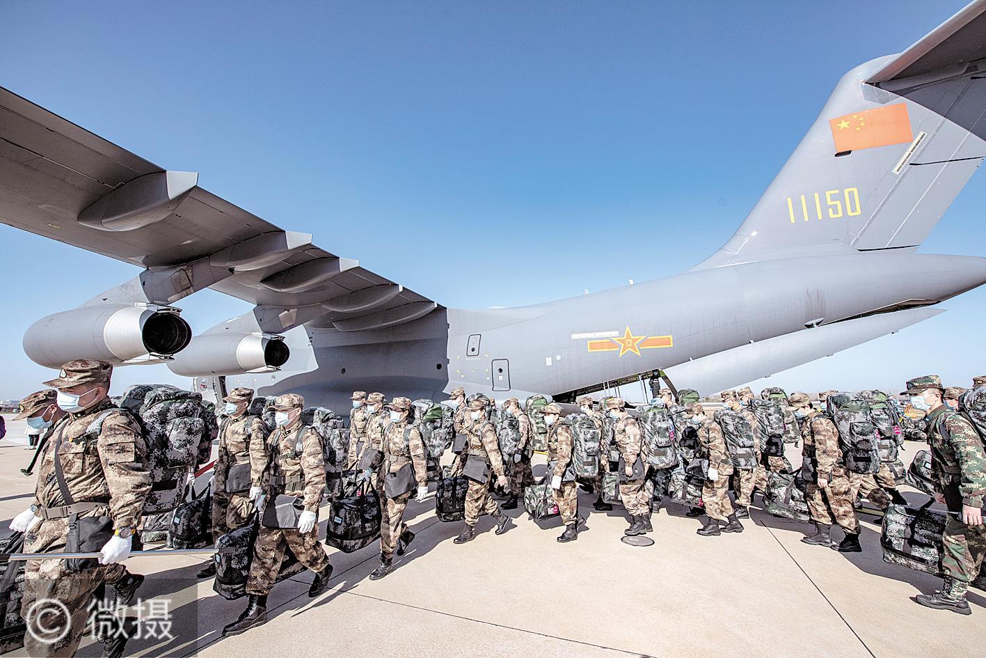 2月17日,人民空军再次出动运—20等三型多架运输机,向武汉紧急空运军队支援湖北医疗队队员和物资,8架运输机共运载676名医护人员和50吨医疗物资。这是空军第四次向武汉大规模空运医疗队队员和物资。 (湖北日报全媒记者 魏铼 摄)