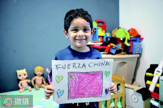 2月10日,在巴拿马首都巴拿马城,男孩马特奥·巴伦苏埃拉作画表达对中国的支持。画中写着:加油中国!新华社发(毛里西奥·巴伦苏埃拉摄)