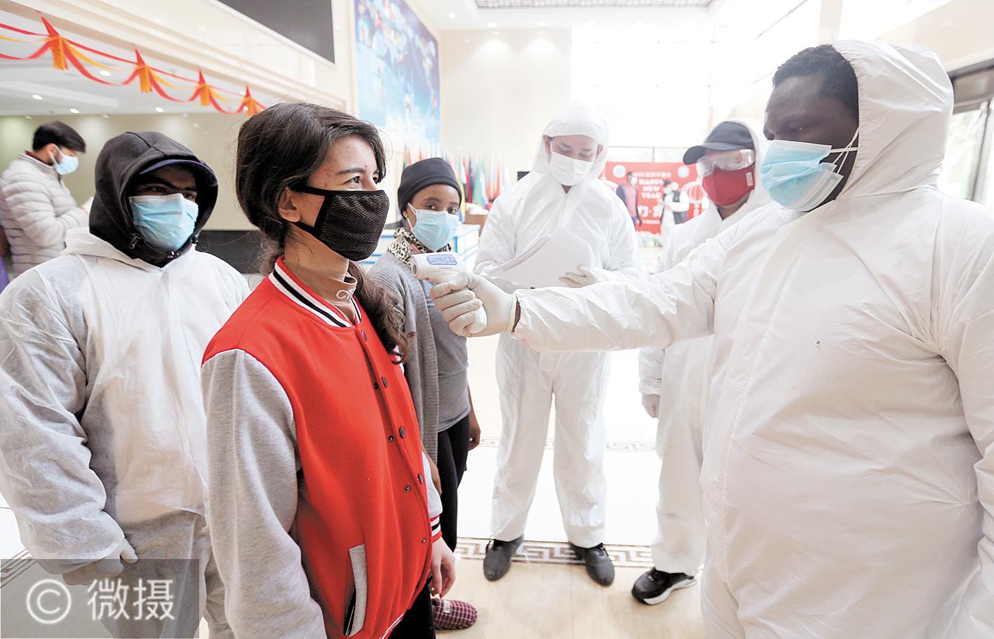 2月19日,中国地质大学丝绸之路学院留学生志愿者服务队队员为在校留学生测量体温。武汉抗疫阻击战打响以来,该院来自巴基斯坦、阿富汗、尼日利亚、坦桑尼亚等国家的13名留学生组成留学生志愿者服务队,每天开展疫情预防宣传、院内消毒杀菌等工作。湖北日报全媒记者 张鸿 通讯员 罗文旭 摄