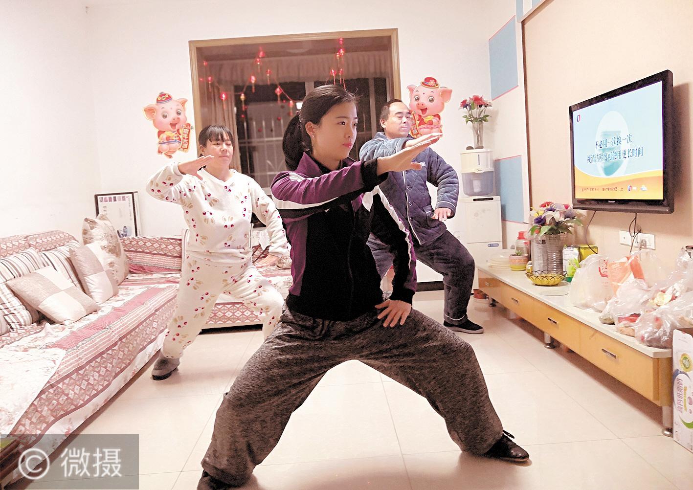 2月17日晚,武汉工商学院辅导员邱桃在家带领父母习练太极拳。武汉实行社区封闭管理以来,不少居民在家学习太极、八段锦等中华传统健身运动,培养健康、良好的生活方式。 湖北日报全媒记者 田悦 摄