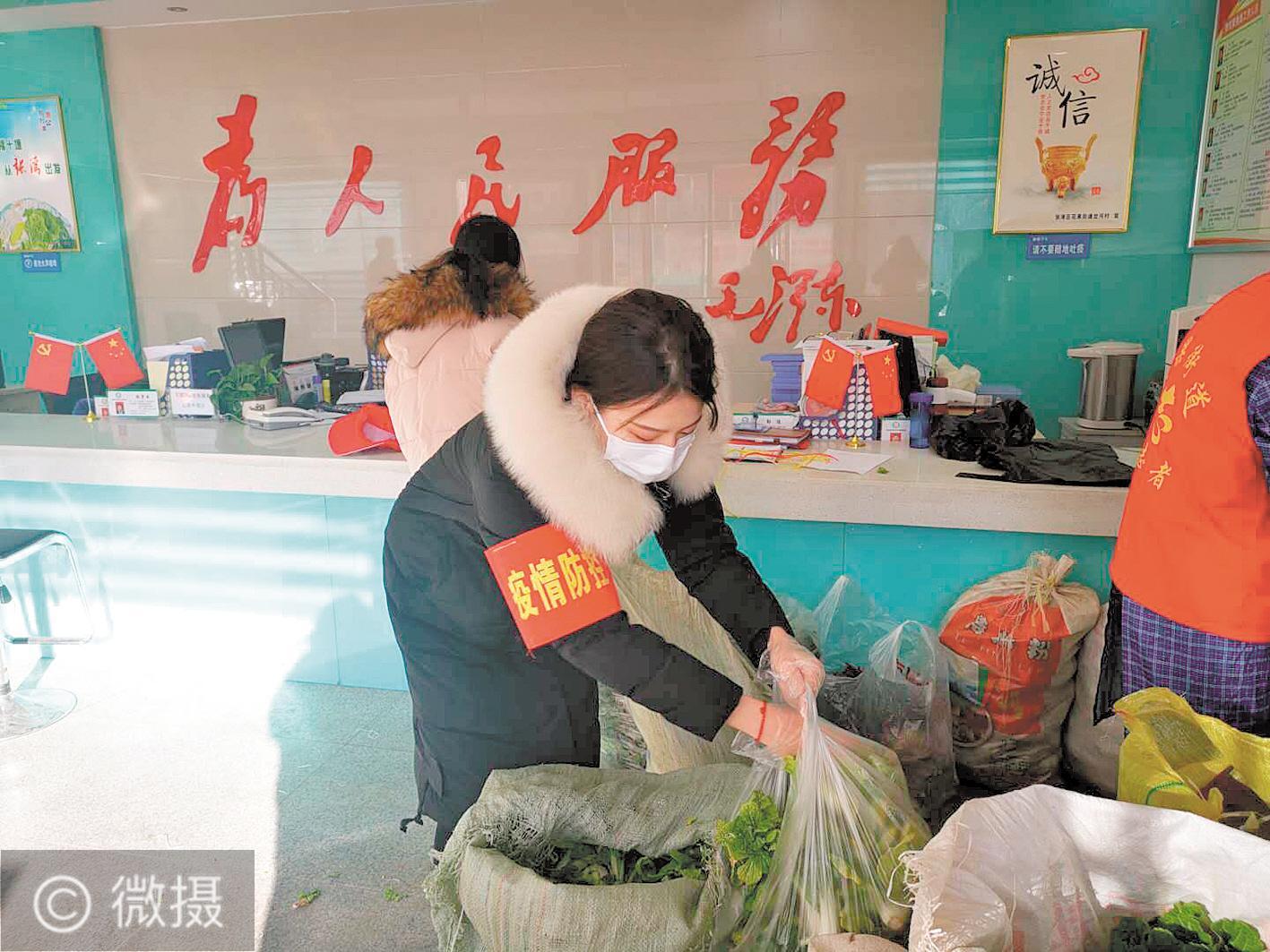 十堰市张湾区以社区为作战单元,千余名机关党员干部下沉中心城区68个社区,担当“守门员”“代办员”“协调员”,撑起社区防疫网。张湾区直干部在党群服务中心为居民分发采购物资。 (视界网 刘涛 摄)