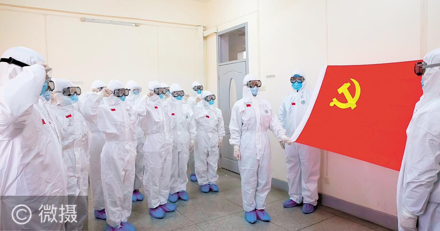 2月17日,在中国人民解放军中部战区总医院武昌、汉口院区以及派出支援武汉市肺科医院、第七医院两支医疗队的病房里,四地同步视频连线,进行新党员火线入党宣誓和老党员重温誓词仪式。7名火线入党的同志,庄严地举起右拳共同宣誓,光荣地加入中国共产党。 视界网 覃丽萍 王皓宇 摄