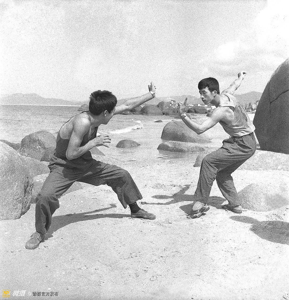 1982年,电影《少林寺》热到军营。两名在海边练武的军人。