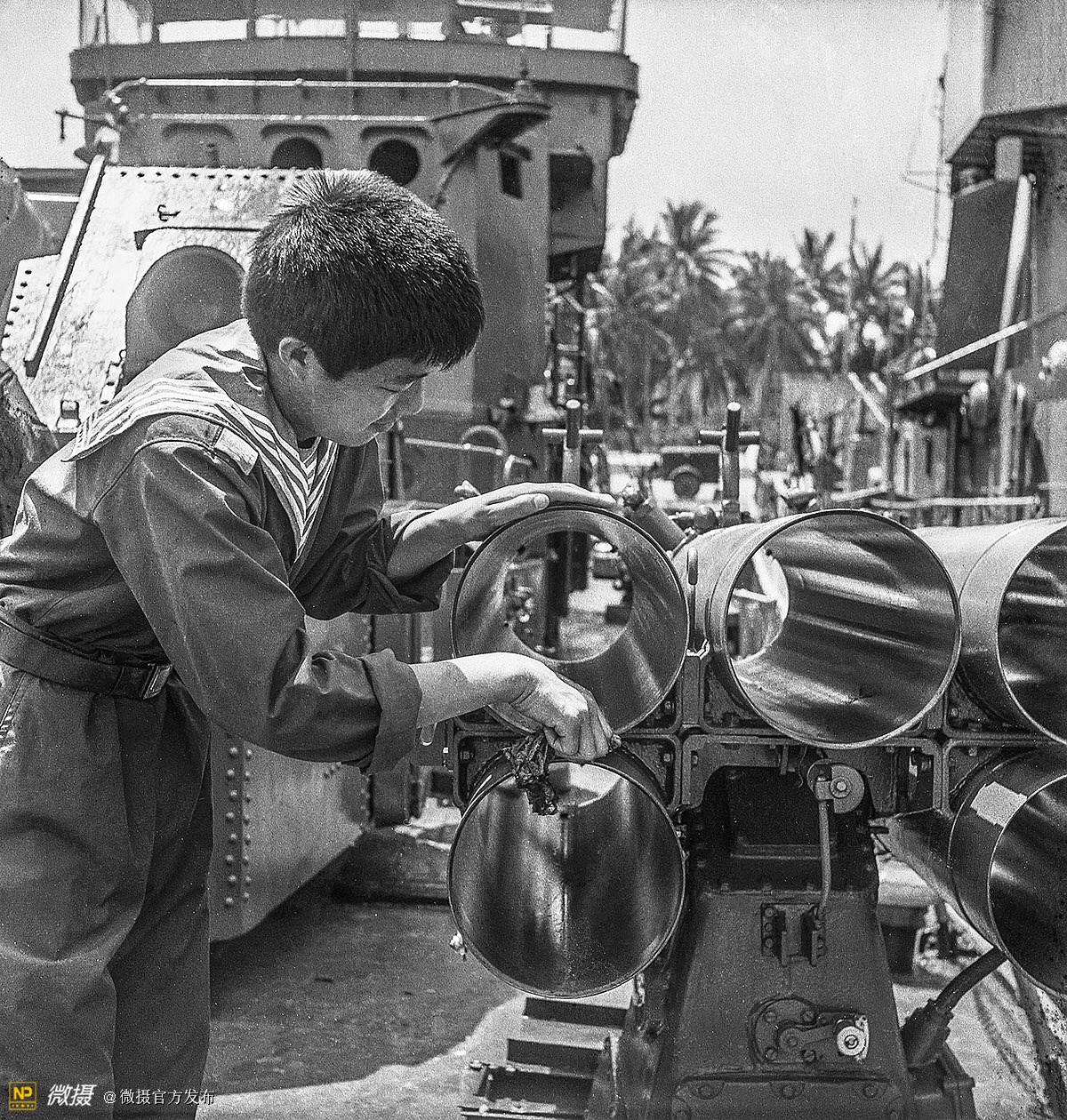 1983年冬,保养火箭发射器的猎潜艇部队战士