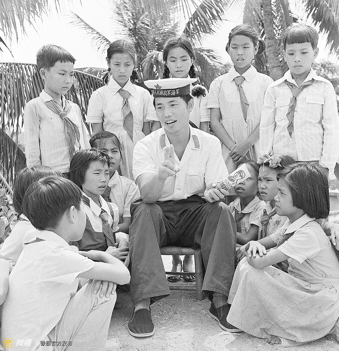 1984年,守卫西沙某部队水兵在后方基地军民共建点,给孩子们讲雷锋的故事