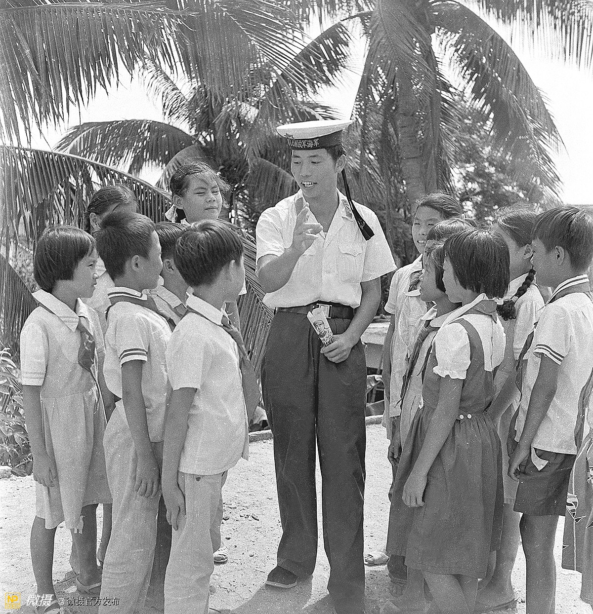 1984年,守卫西沙某部队水兵在后方基地军民共建点,给孩子讲雷锋的故事