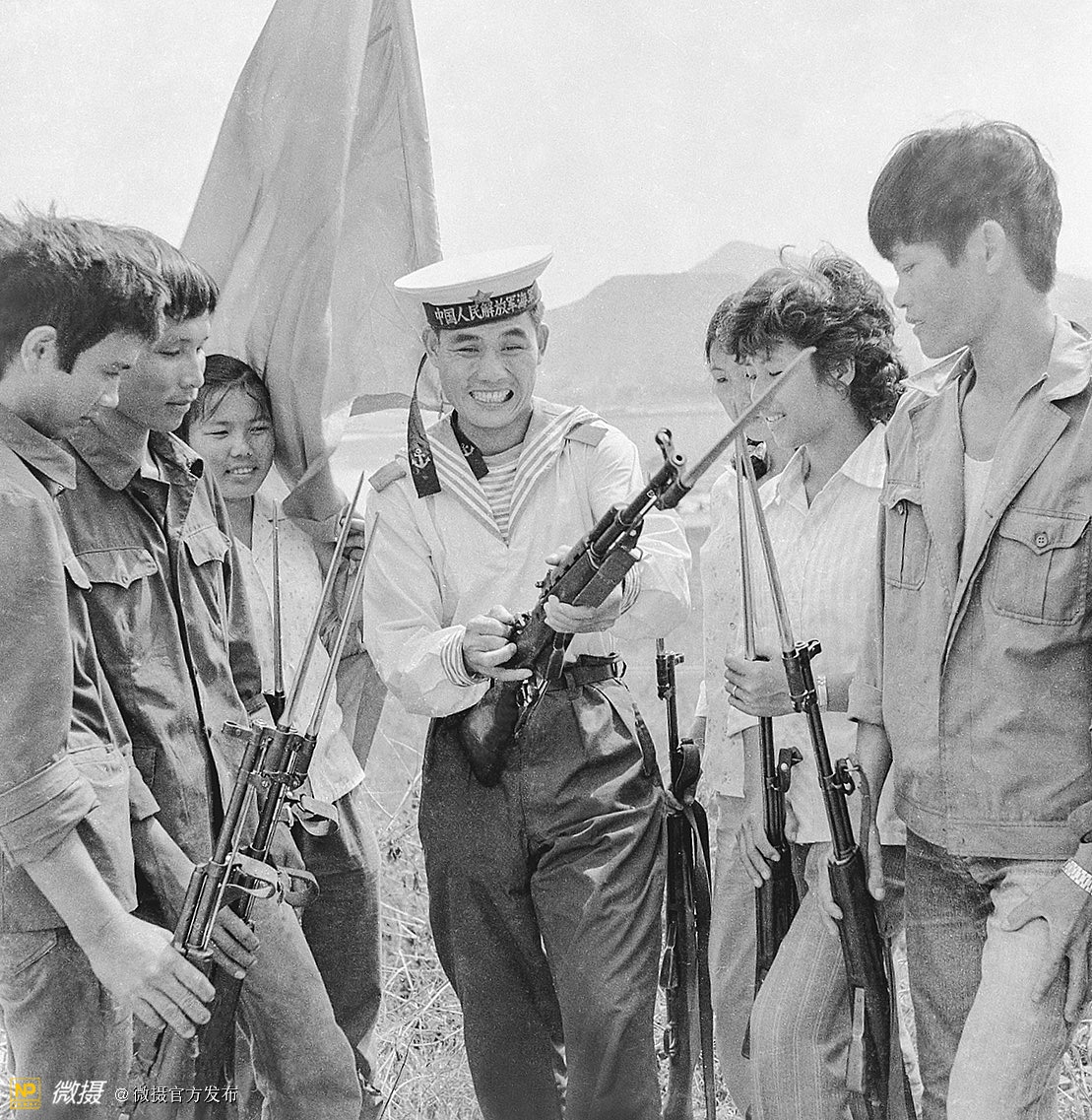 1984年,守卫西沙某部队水兵在后方基地军民共建点,向民兵示范刺杀动作
