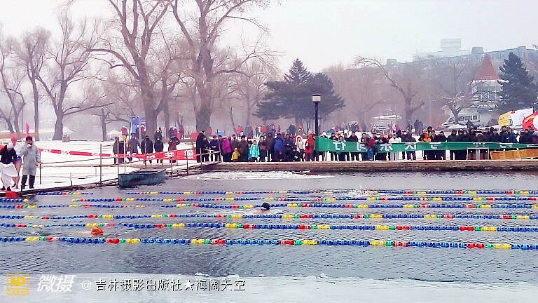 摇旗呐喊冬泳赛,你追我赶向前冲。