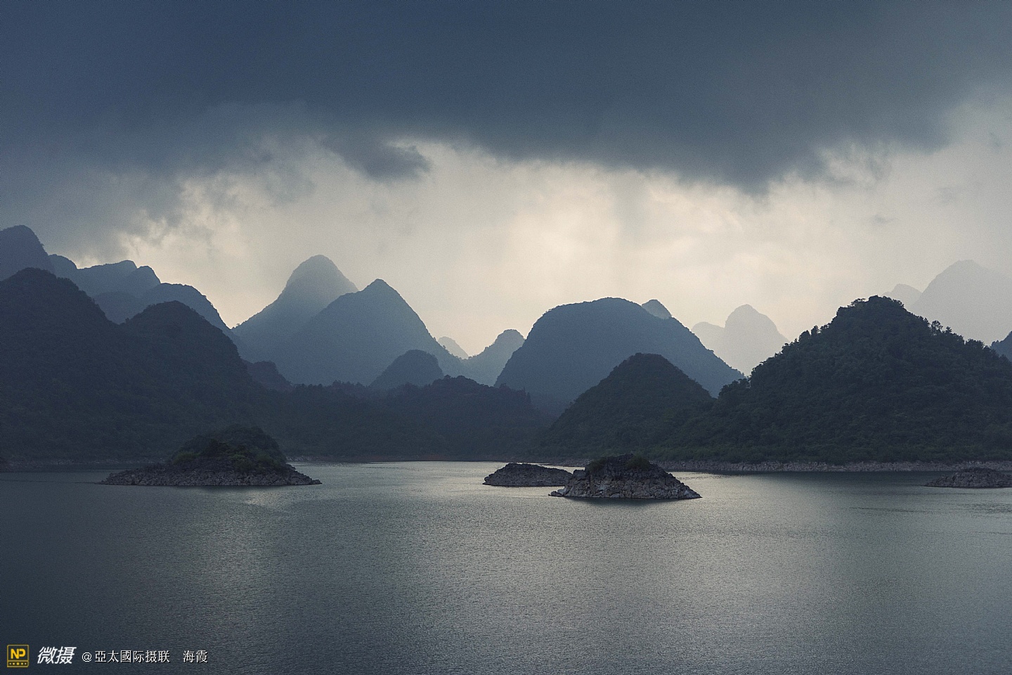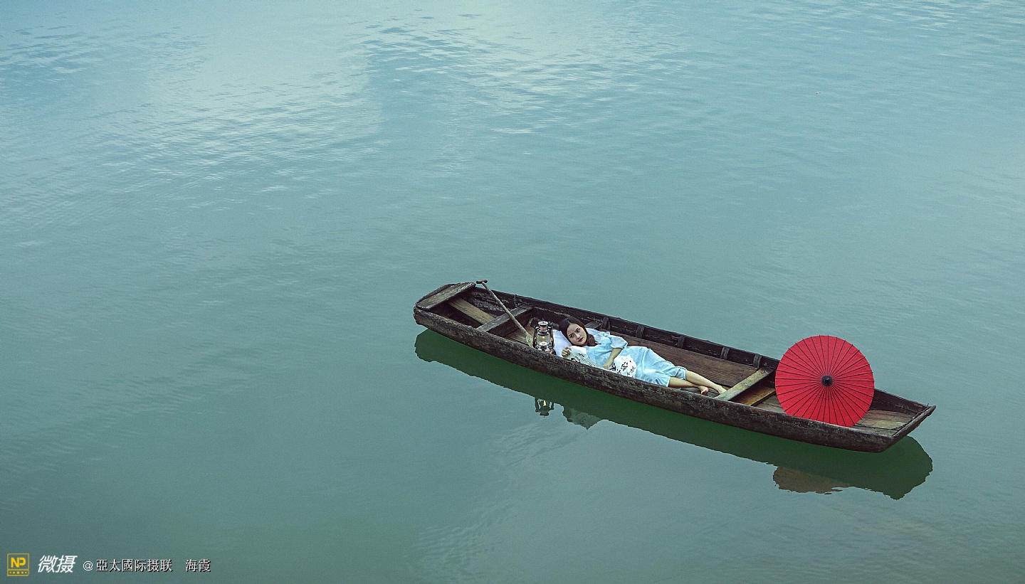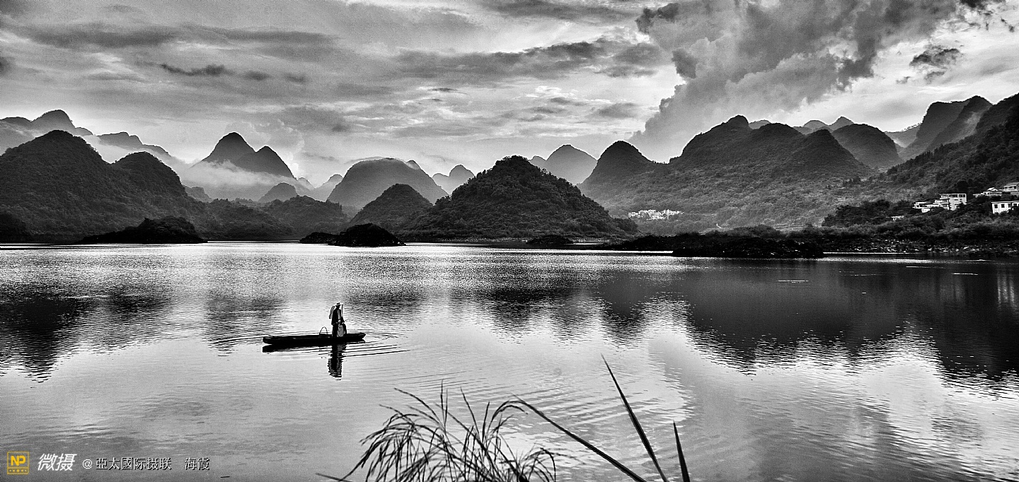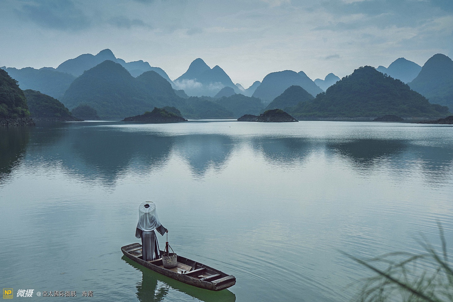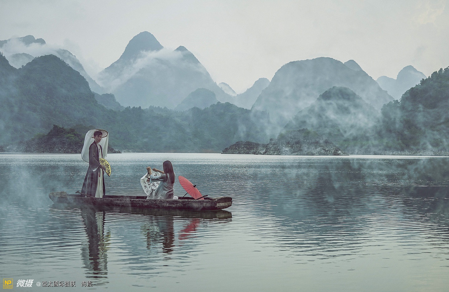 雨後的风景真的是太美了,它真的像幅中国山水画,像首诗,又像一个又美丽、又朦胧的梦……正当我完全陶醉在这美景时,我們的兩個小伙伴已经摇着小木船荡漾在湖里去了,此時此刻仿佛置身于仙境,穿越到了古代,心里总是担心这景色一下子就会遠去,再也看不到了,我贪婪地端著像機不停的拍,一邊欣赏这好像一幅湿淋淋的水墨画的美景,一邊不停的拍......