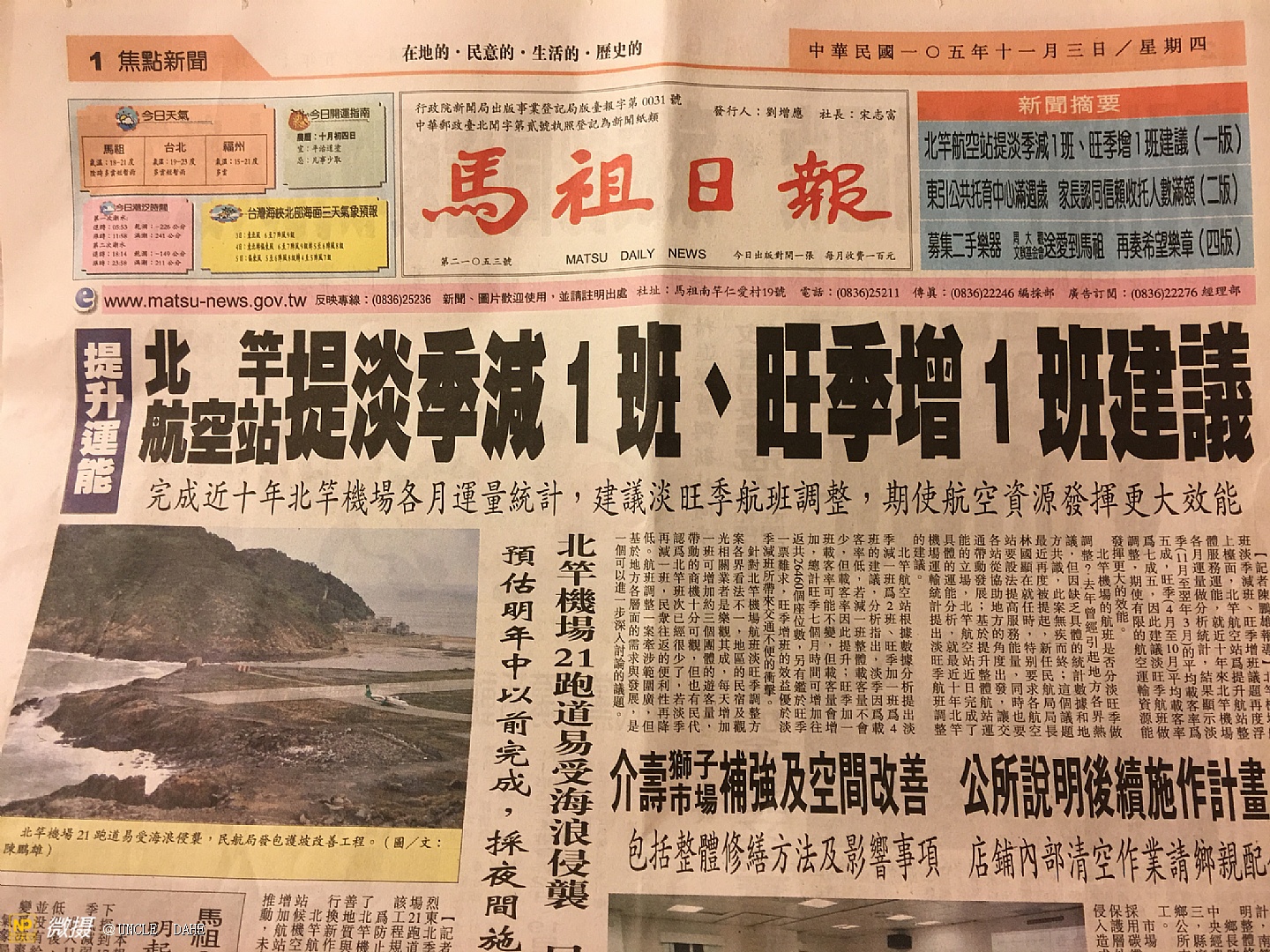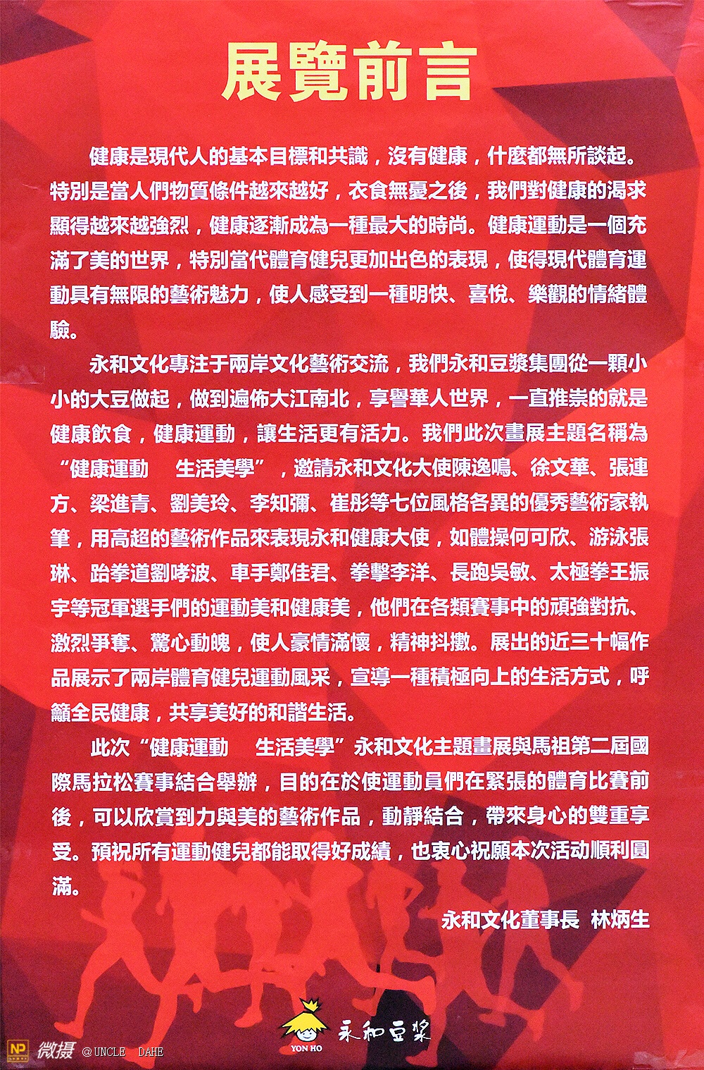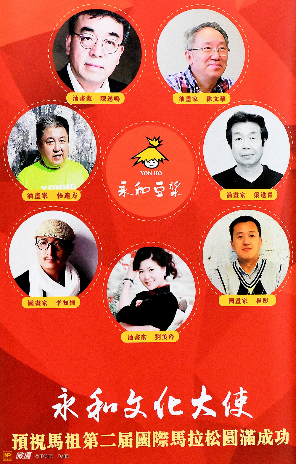 两岸情、永和行:永和豆浆文化主题画展11月4日在台湾马祖隆重举行。台湾连江县县长刘增应先生、县议会议长张永江先生、永和文化董事长林炳生先生、国家摄影主席何世红先生、著名画家徐文化先生和马祖南竿乡乡长陈振国先生为活动剪彩。大陆女子国际马拉松冠军和太极武术国手、自行车国手以及台湾连江县政府文化局和相关部门负责人、马祖列岛的社会名流出席了活动。微摄(APP,中国最大的图片社交手机移动互联网平台)进行了现场直播。