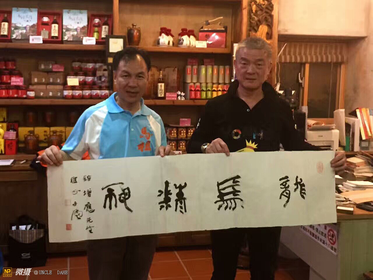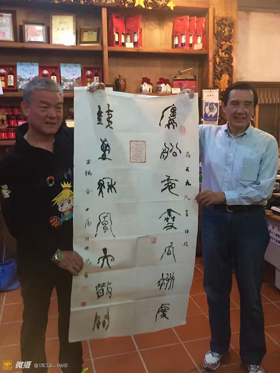 永和文化董事长林炳生先生11月4日晩上将大陆艺术家的墨宝赠送给刘增应先生。