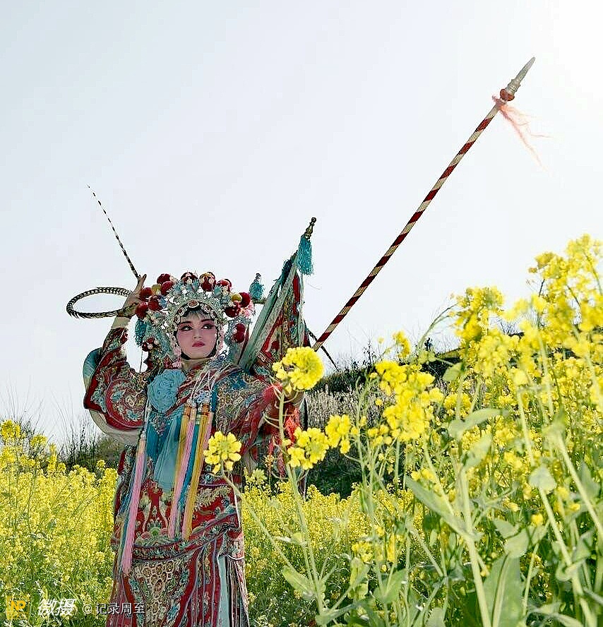 【周至油菜花海撞上传统戏剧,美】4月1日,身着旦角戏装的周至县剧团的演员们现身油菜花海,上演了水袖表演。油菜花撞上传统戏剧,自然之美和古典美相互映衬,给成片的油菜花海增添了别样风情,让人眼前一亮。