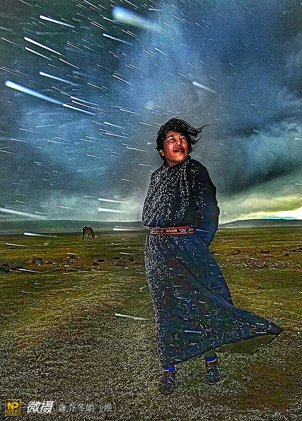 风雪佳人:摄于纳木错,图中的雪花拉长是因为用了八分之一秒,面部能清晰是因为用了闪光灯,这张照片用的是闪光灯前帘同步,切记,这个时候不能用后帘同步。