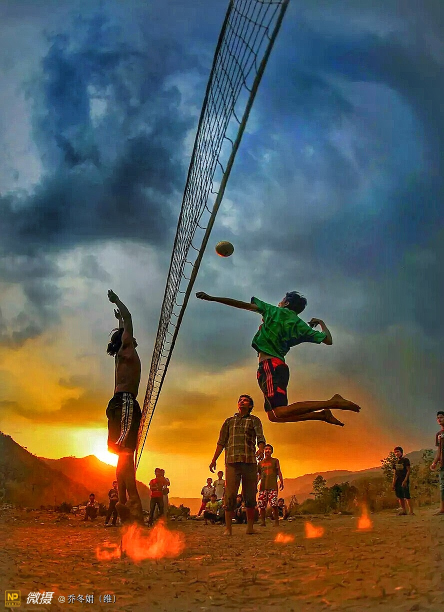 尼泊尔6:从尼泊尔的博卡拉搭乘车回到加德满都大约需要六个小时,图中会见到一些山地风光,这天见到的却是当地人在打排球,我挂着鱼眼镜头就下去拍摄。后期对变形部分着做了调整。