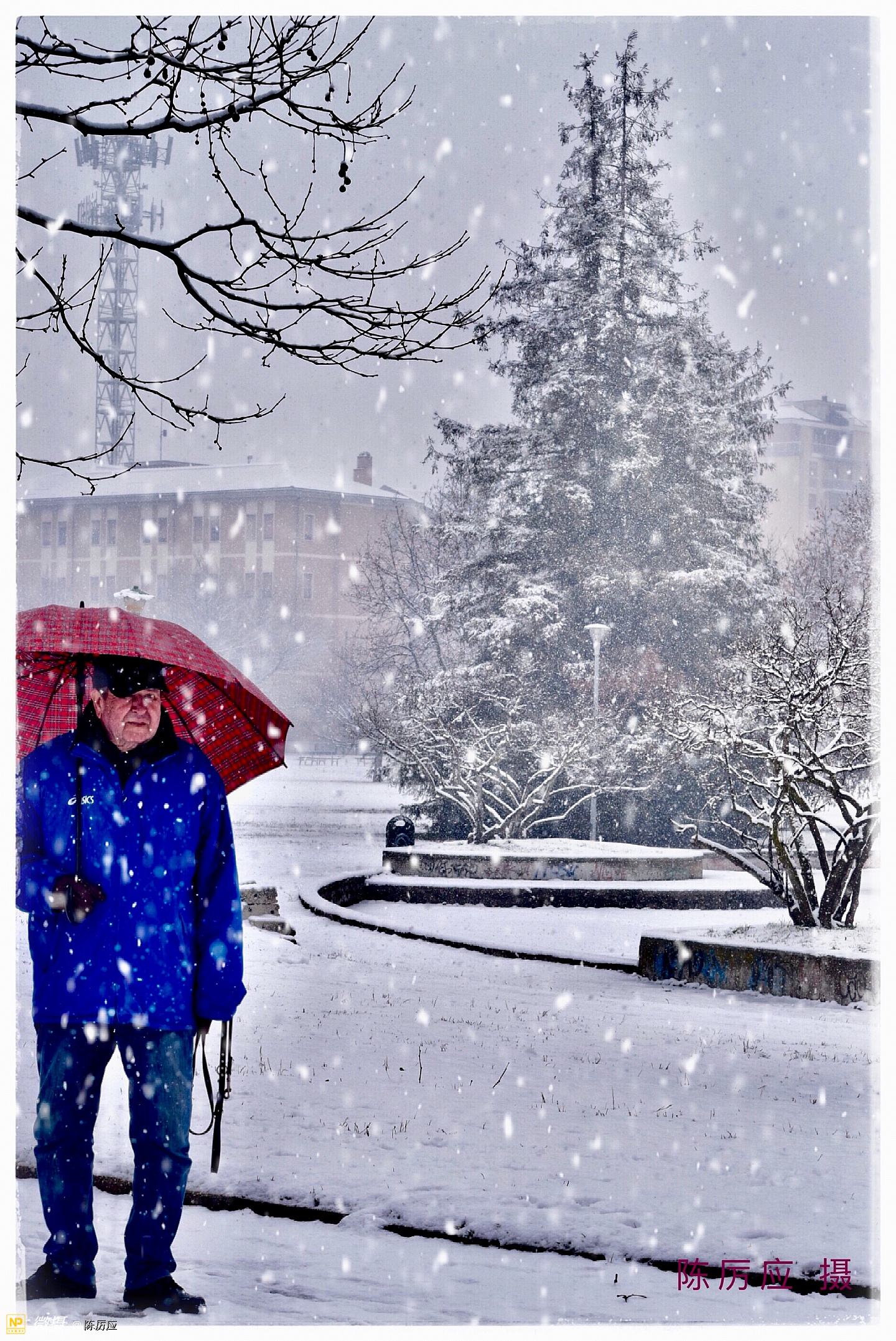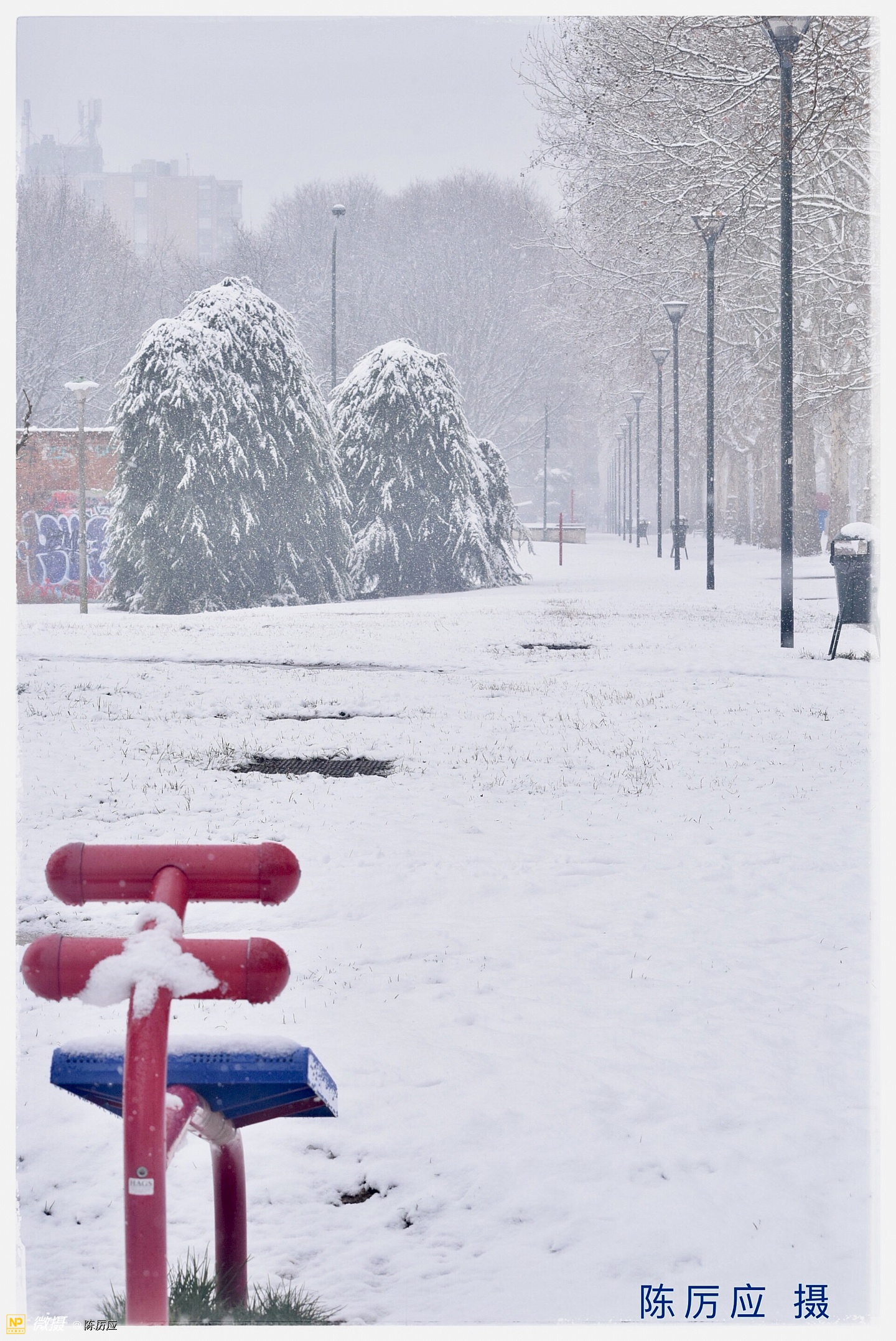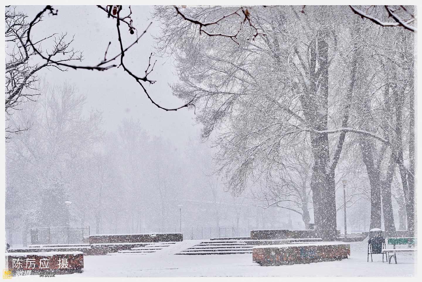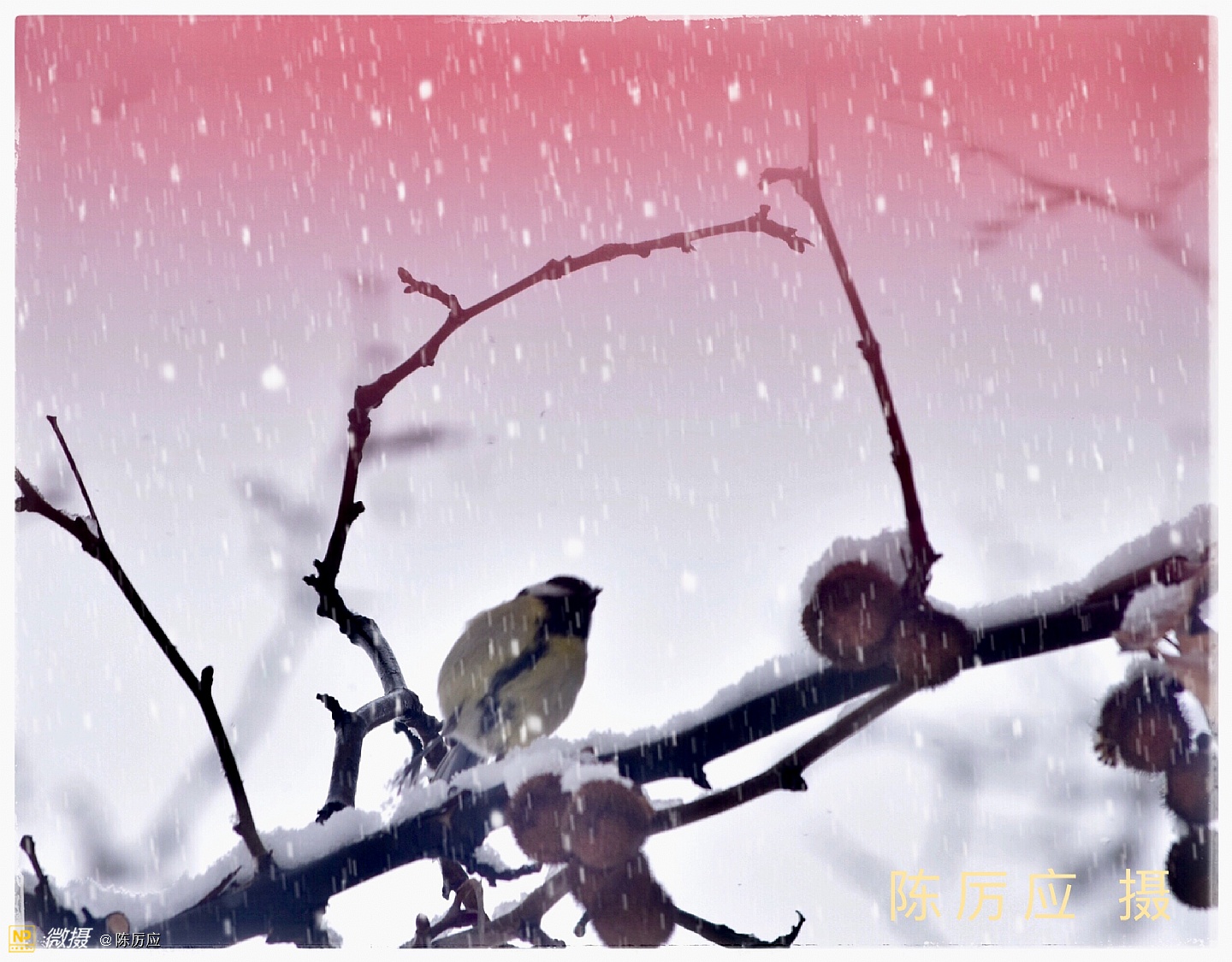 昨天中午在停雪之前,把酒吧门关了,去后公园拍雪景。 雪下下停停快一个多星期了,是乎有点厌烦了!天气太冷了,今天是最后一天了,我还是去看看,一只手拿红伞,一只手拿相机,相机还要包着,进公园一看,哇哦!好漂亮的春雪,似乎被迷住了,只顾着看了,细细的春雪,亲吻着脸颊,仿佛冬天里吃冰激淋似甜甜的,,雪下着最大的时候,白茫茫的一片,朦朦胧胧的,像水墨画一样富有层次和意境,焕然若梦。 这时很少有人走动,只有遛狗的人。地面平平的厚厚一层覆盖着,像是走进一个白色的世界,纯净的,晶莹剔透的,宛如昙花盛开。 春雪它是个浪漫的,幻想的世界。就是一边落一边就化了,美总是在一刹那的时候。雪停了!就像昙花谢了! 我正准备去上班了。树上的黄鹂鸟在叫我了!我就给你也拍个照吧!一会儿太阳就出来了。过一会儿太阳下山了,