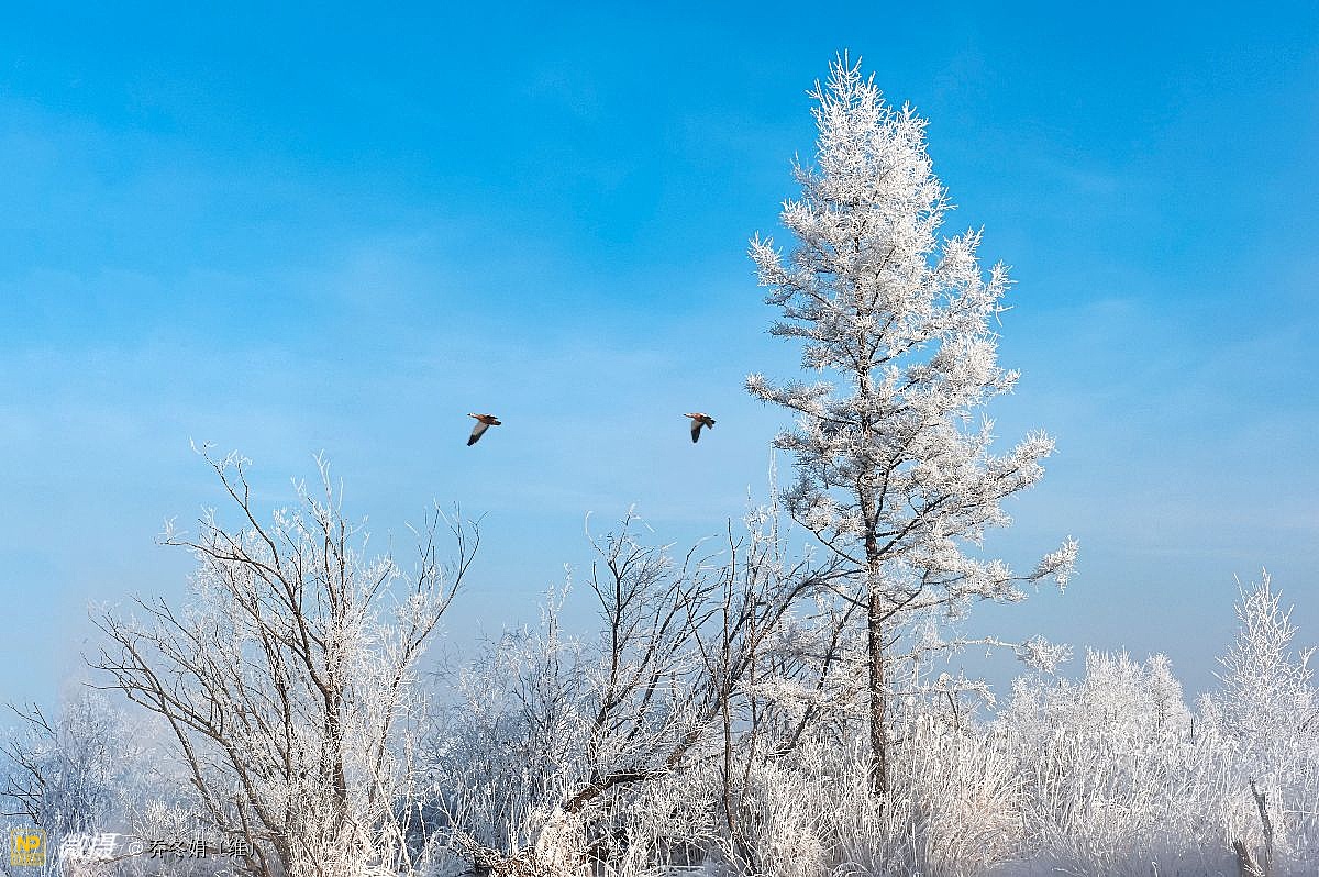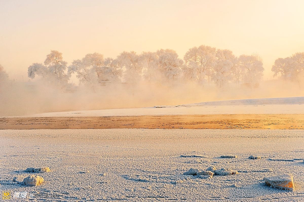 早上雾凇岛,阳光明媚,给大地披上一层光辉。(左成)