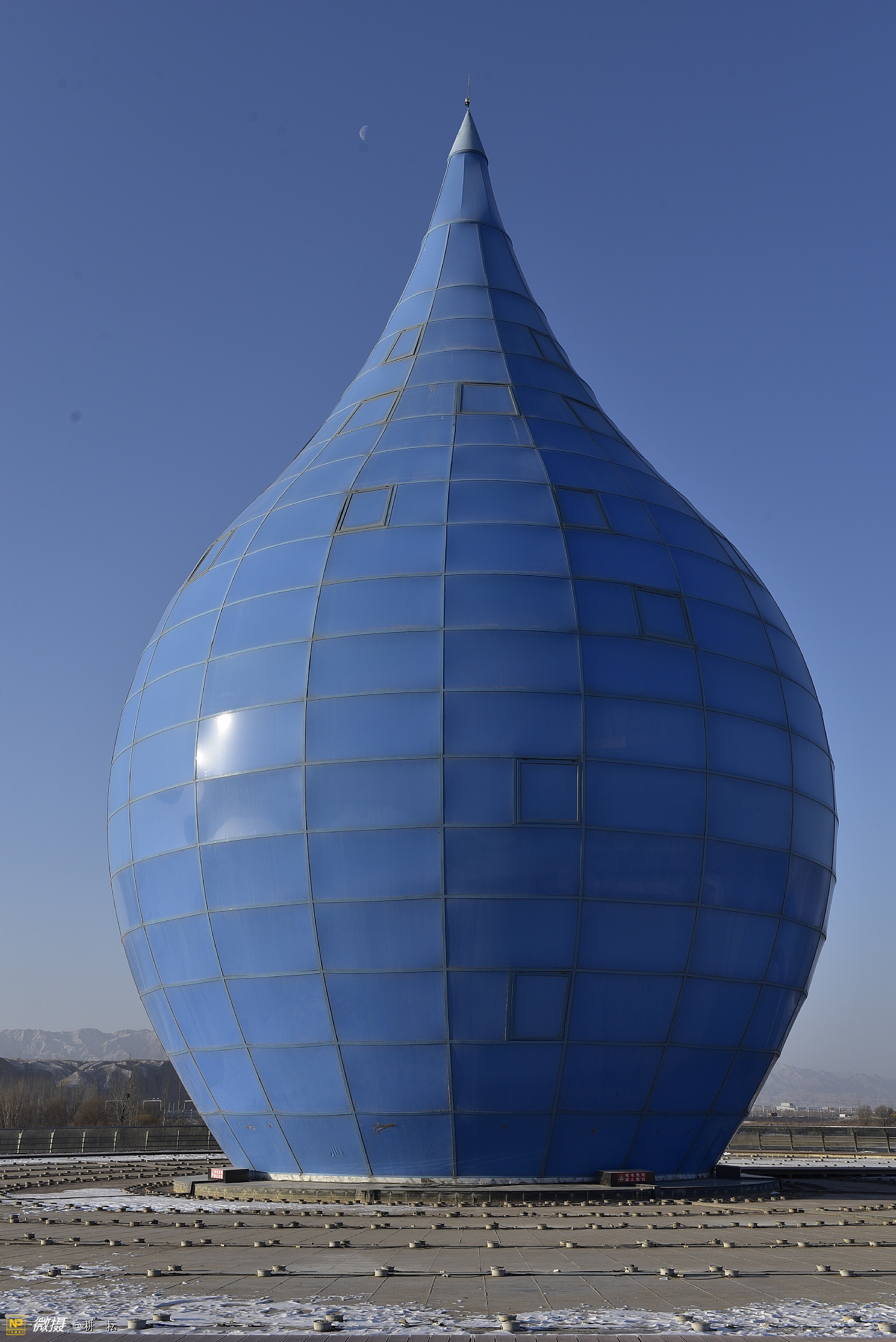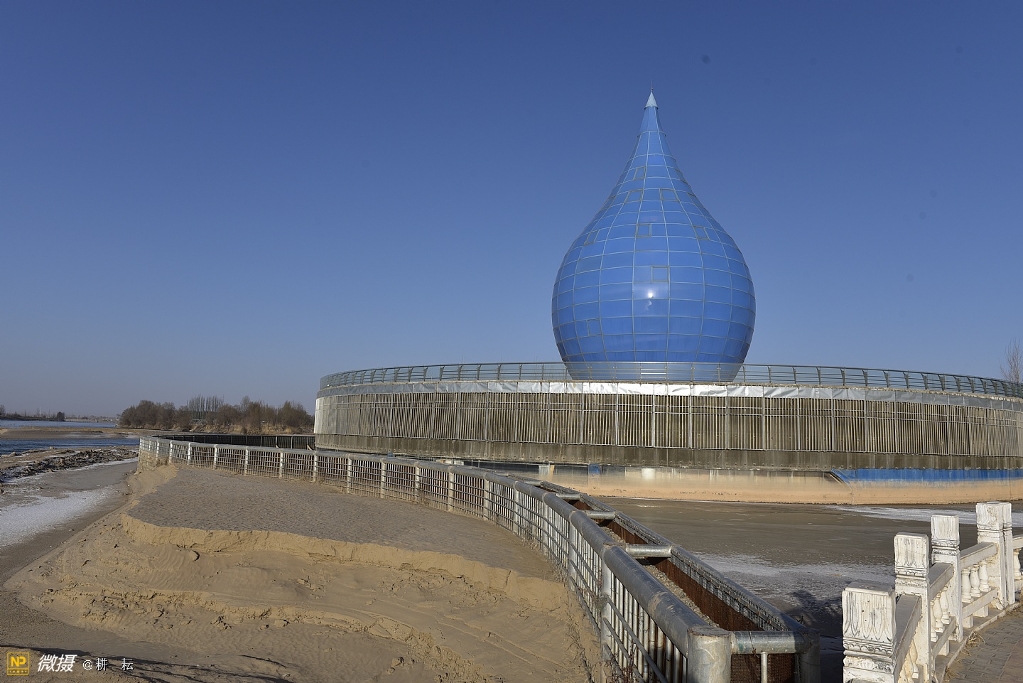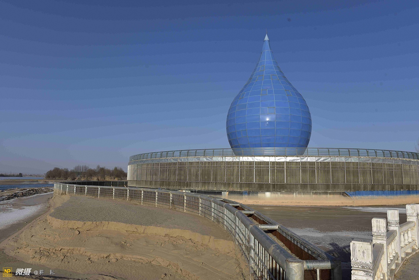 黄河宫位于宁夏西部城市中卫市黄河北岸。抬头远望,九曲滔滔黄河水,似一条金色的彩带,舞动着,自西向东从公园南部缓缓流过。中卫地区自古就有"天下黄河富宁夏,首富中卫"之说,也是宁夏"黄河金岸"城市经济带中的一颗璀璨明珠。黄河宫主体建筑高36.9米,创意采用唐朝诗人李白"黄河之水天上来"的诗词寓意,将黄河之水凝练成水滴建筑形态。建筑里沿内壁有人行观景坡道,中间设电梯和80多平方米的观景台。水滴主体建筑下就是黄河博物馆。????展