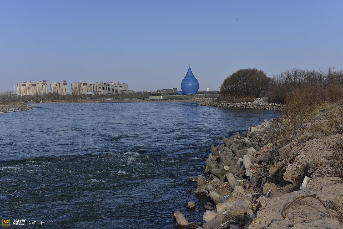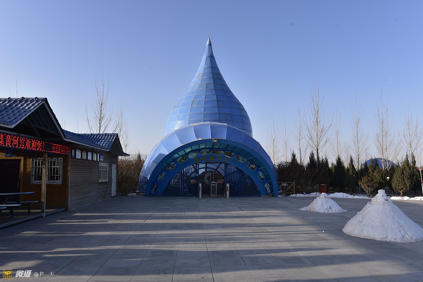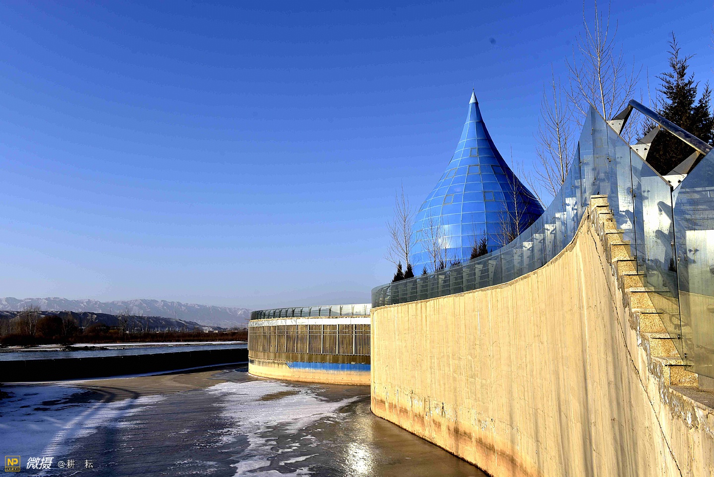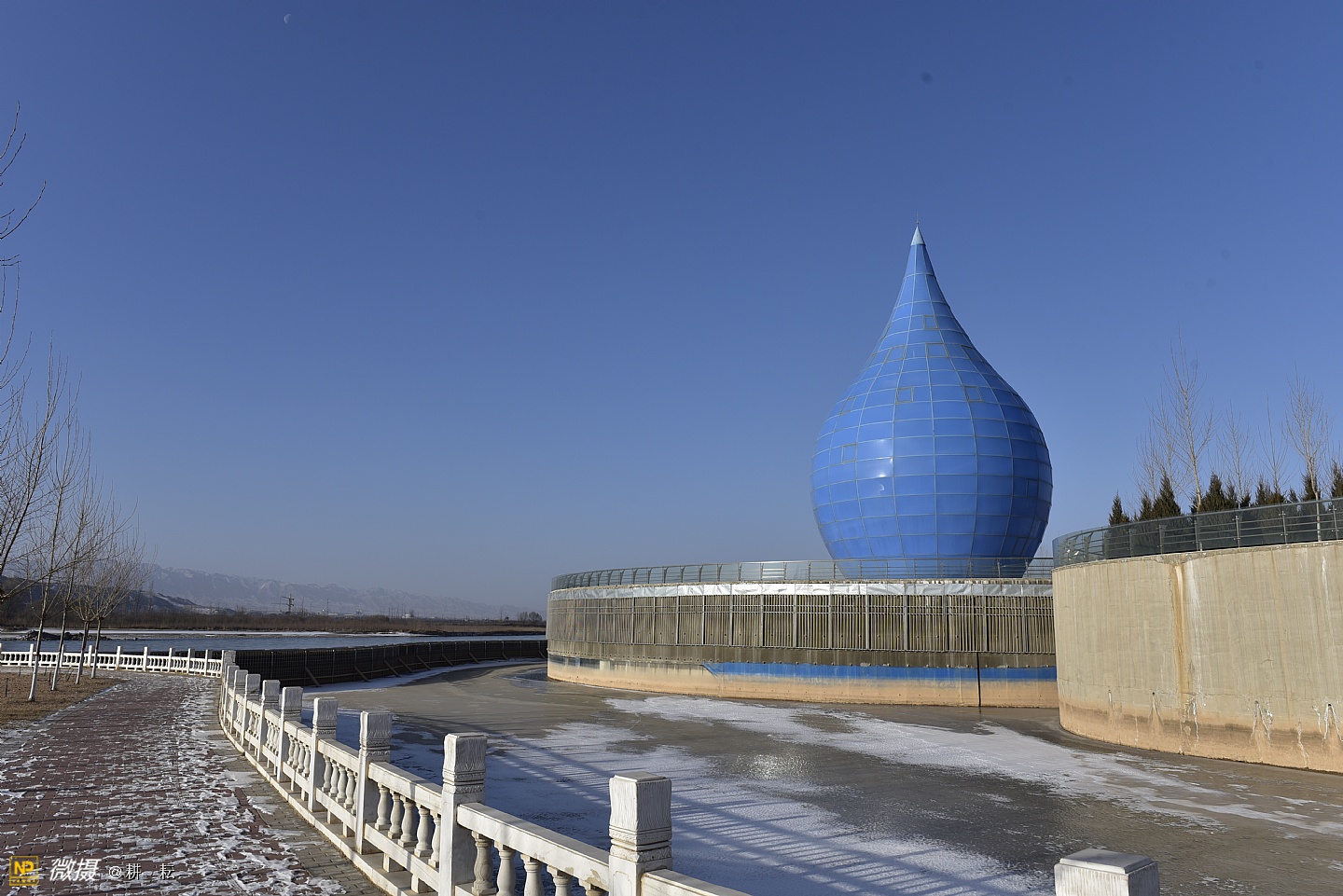 黄河宫位于宁夏西部城市中卫市黄河北岸。抬头远望,九曲滔滔黄河水,似一条金色的彩带,舞动着,自西向东从公园南部缓缓流过。中卫地区自古就有"天下黄河富宁夏,首富中卫"之说,也是宁夏"黄河金岸"城市经济带中的一颗璀璨明珠。黄河宫主体建筑高36.9米,创意采用唐朝诗人李白"黄河之水天上来"的诗词寓意,将黄河之水凝练成水滴建筑形态。建筑里沿内壁有人行观景坡道,中间设电梯和80多平方米的观景台。水滴主体建筑下就是黄河博物馆。????展