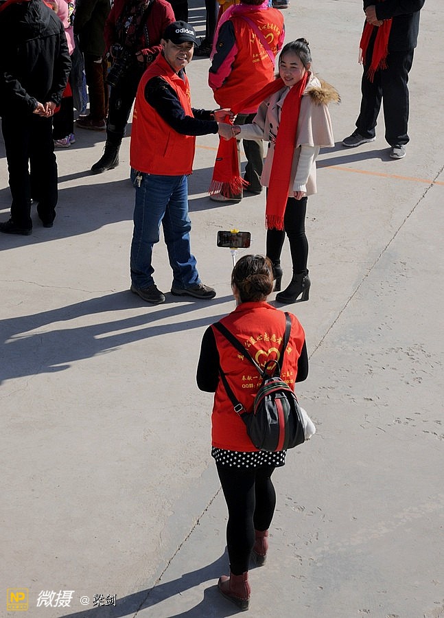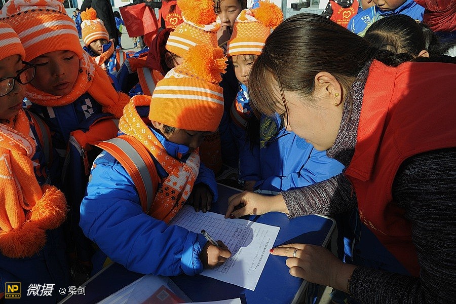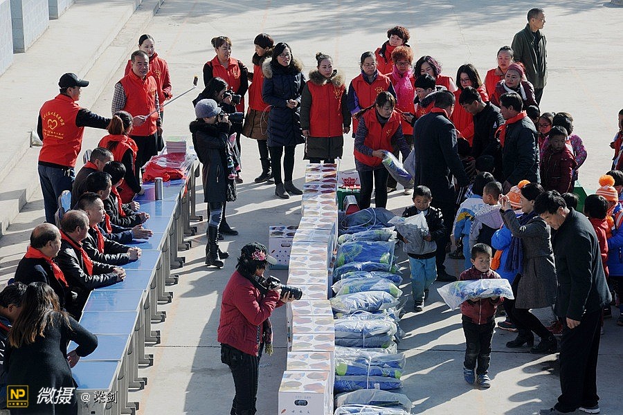 孩子们在高兴中排队,从爱心人士手中接过爱心棉衣