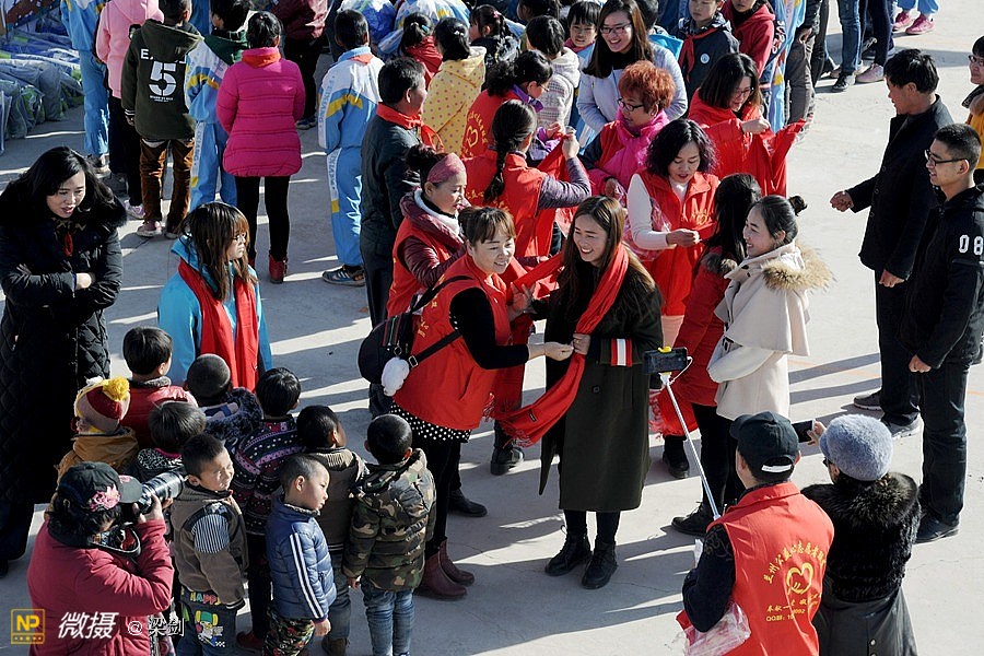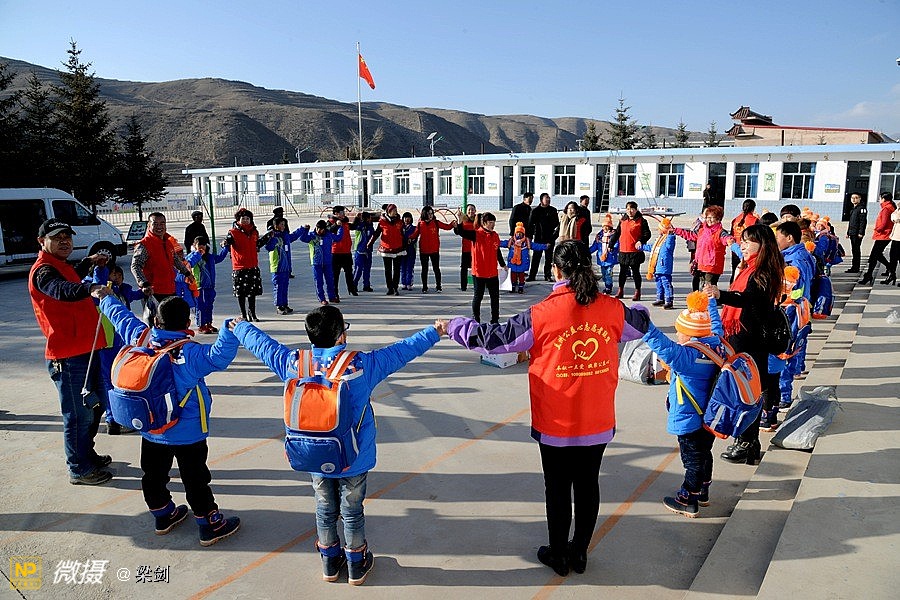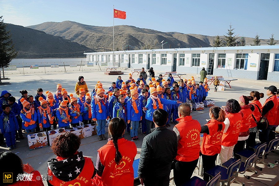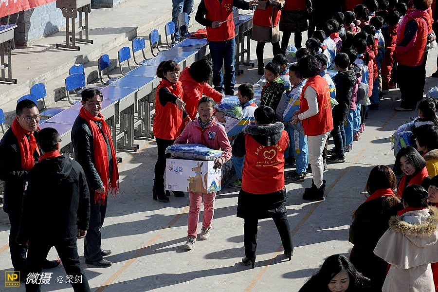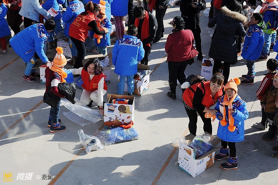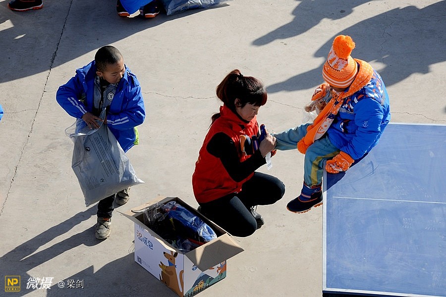 为贫困家庭学生发放壹基金温暖包,由爱心志愿者和老师帮助,为领到温暖包孩子穿戴衣物