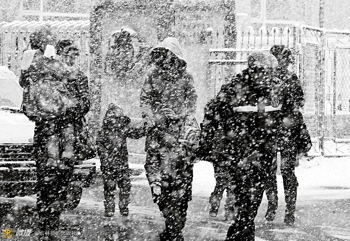 风雪弥漫时,天下父母心。一所幼儿园放学后,家长和孩子们走在回家的路上。