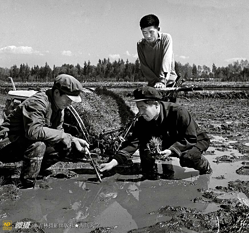 在田间指导——泥里水里讲解分秧插秧,并亲手示范。