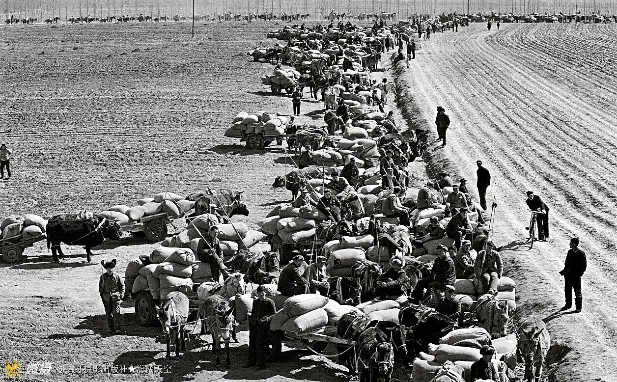 持续数十天,从清晨到夜晚,从粮库门口到空旷野地,来自千家万户、满载公粮余粮的马车牛车,在收购点周围排着络绎不绝的长队喜交公粮。