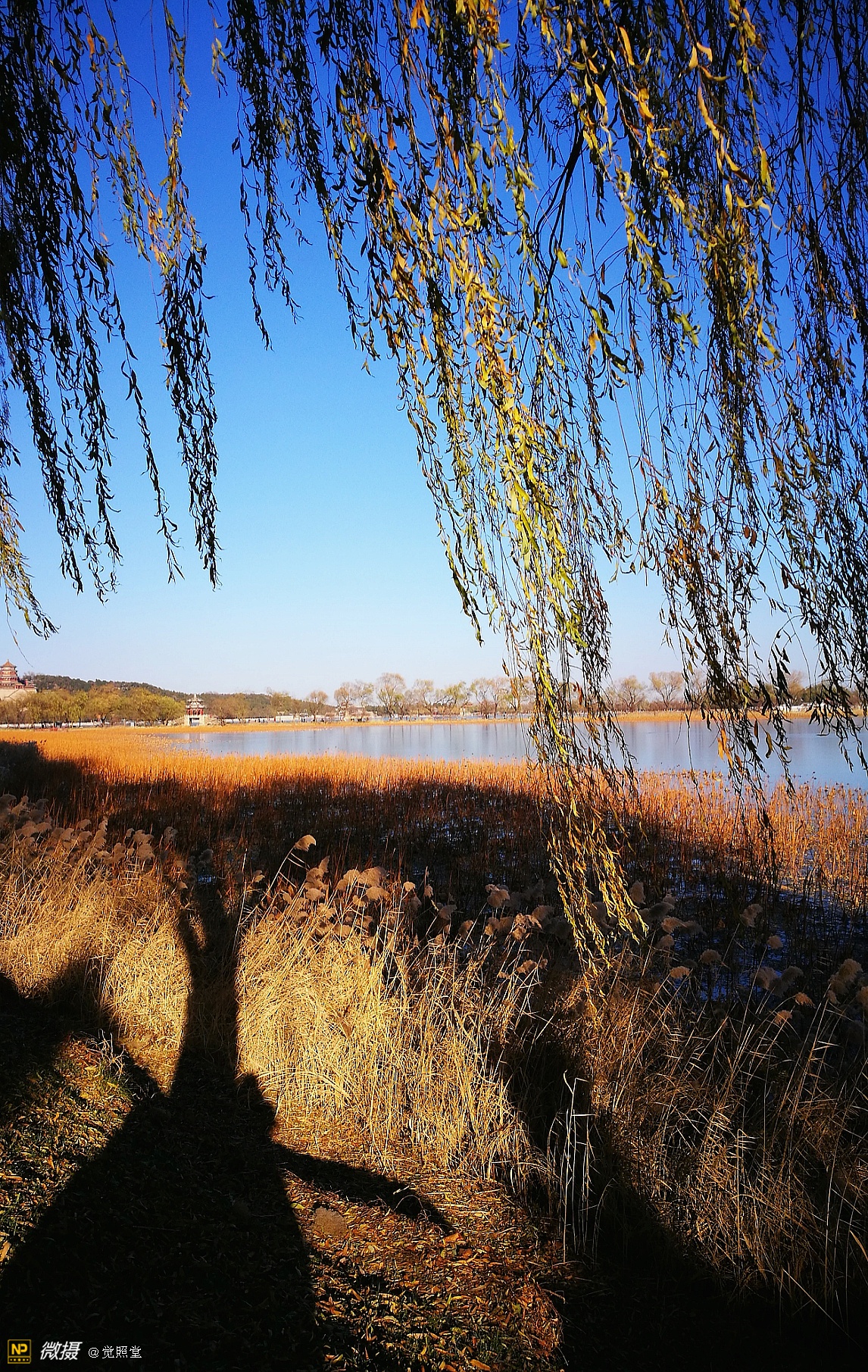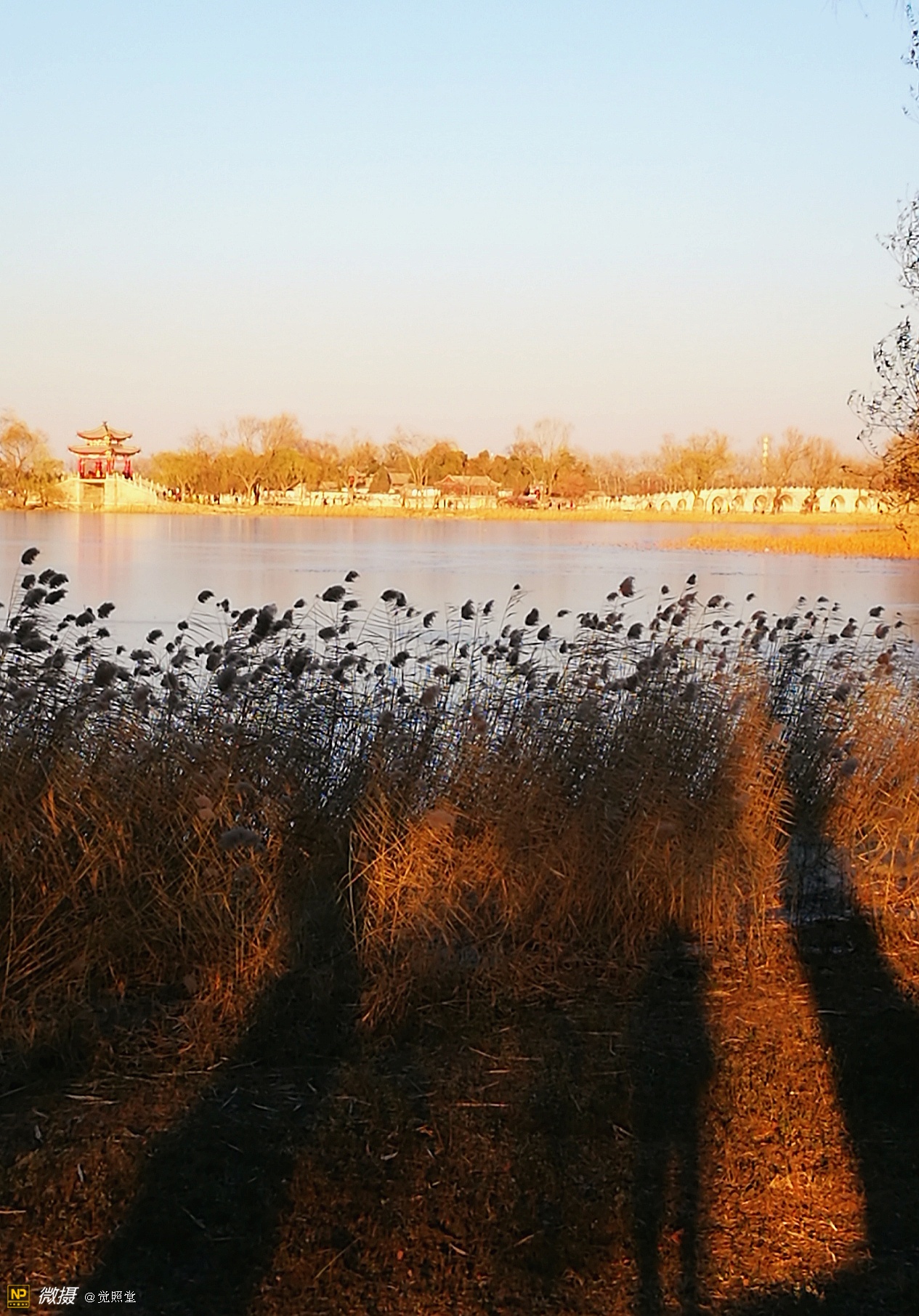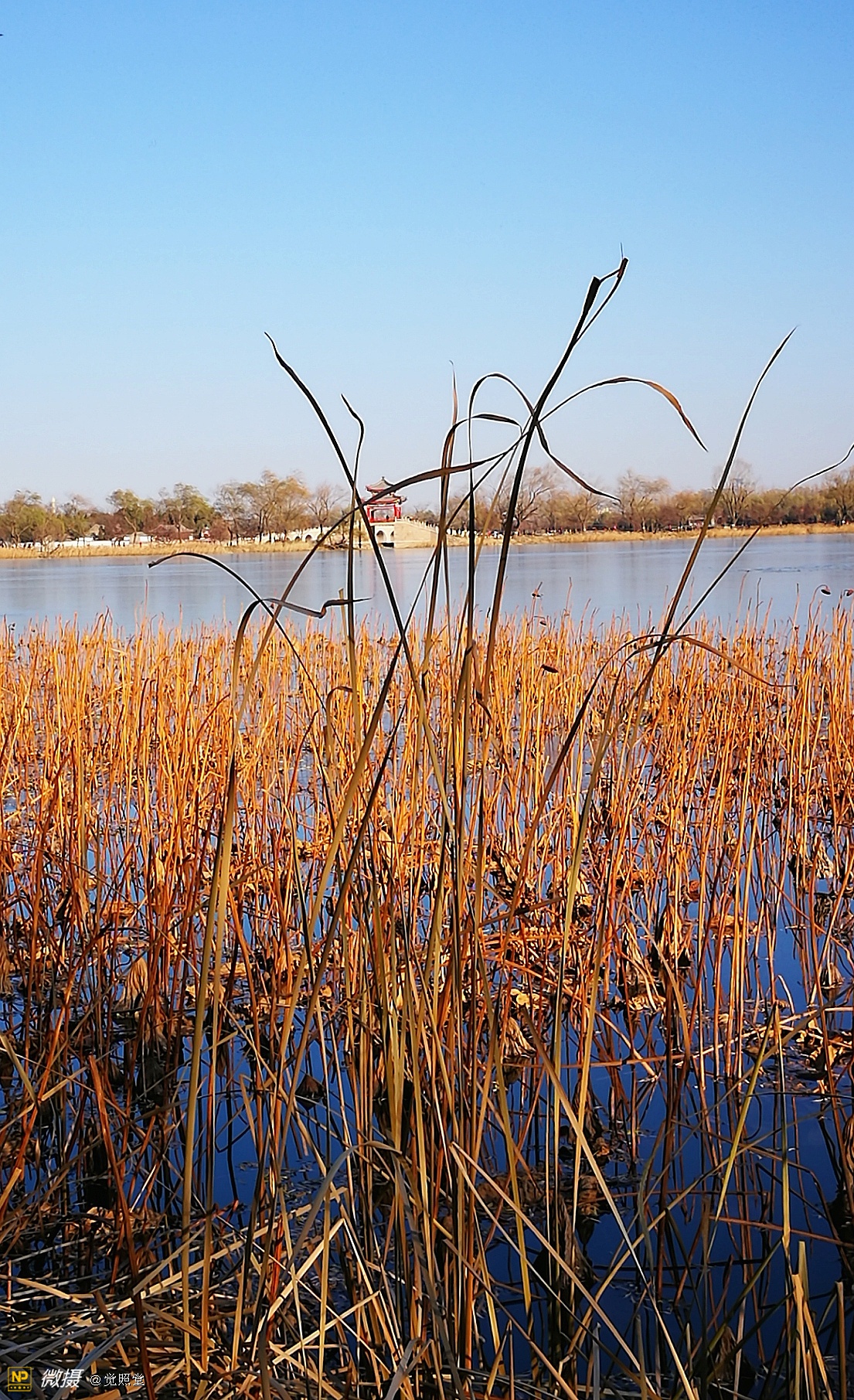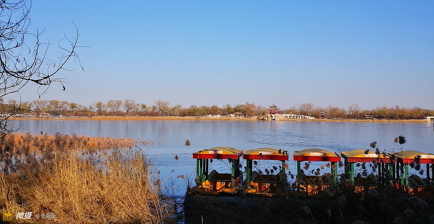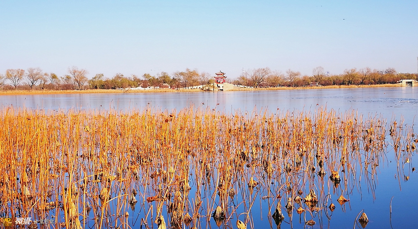 我漫步在这秋日的暖阳里,看头上的天空,看远处的高楼,以及远处依稀可见的山,看湖光塔影、亭台楼榭、看夕阳下的芦苇、残荷。有阳光陪衬,一切如此美好。金色风光惹人醉,更是惹得摄影人沉醉。