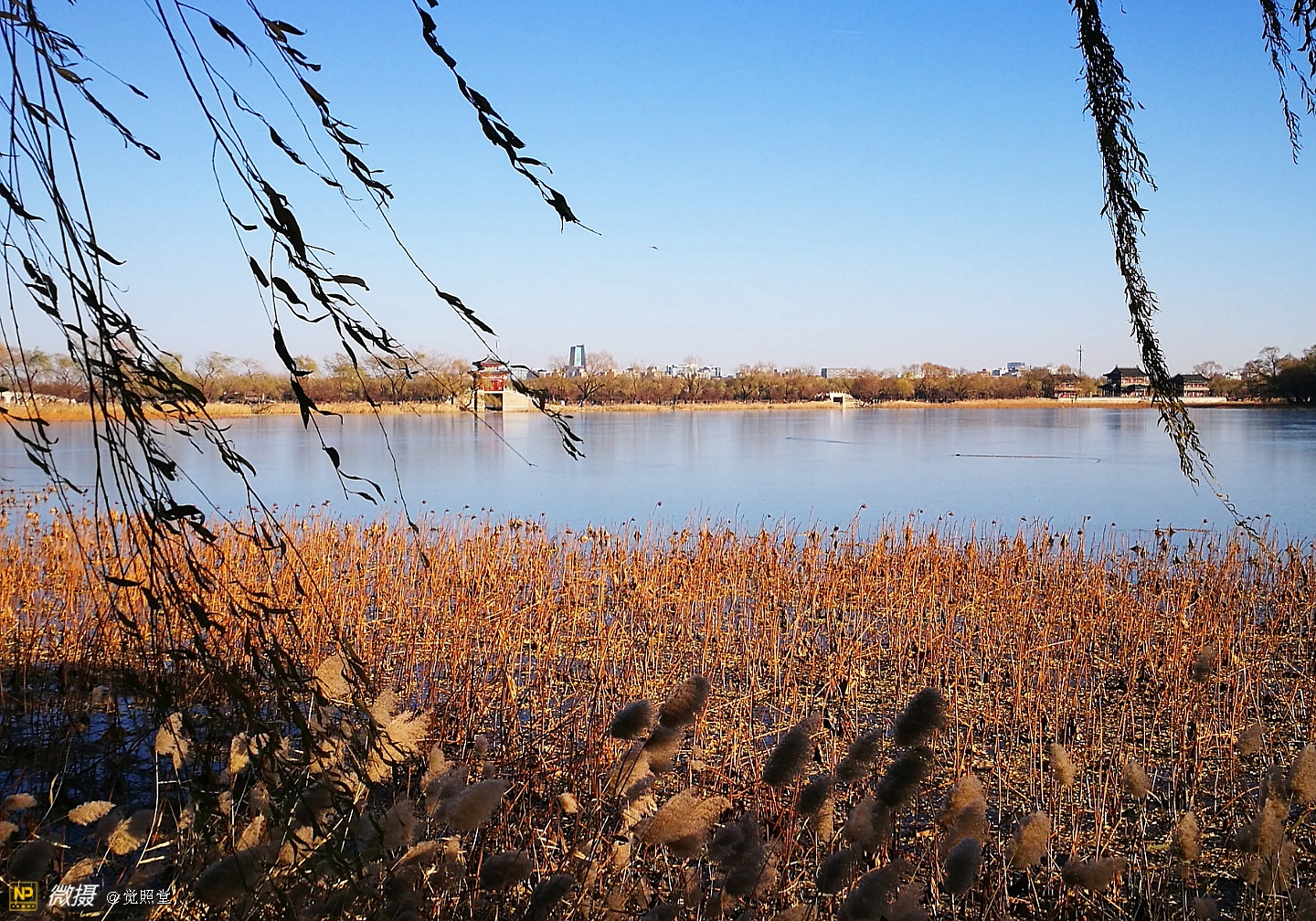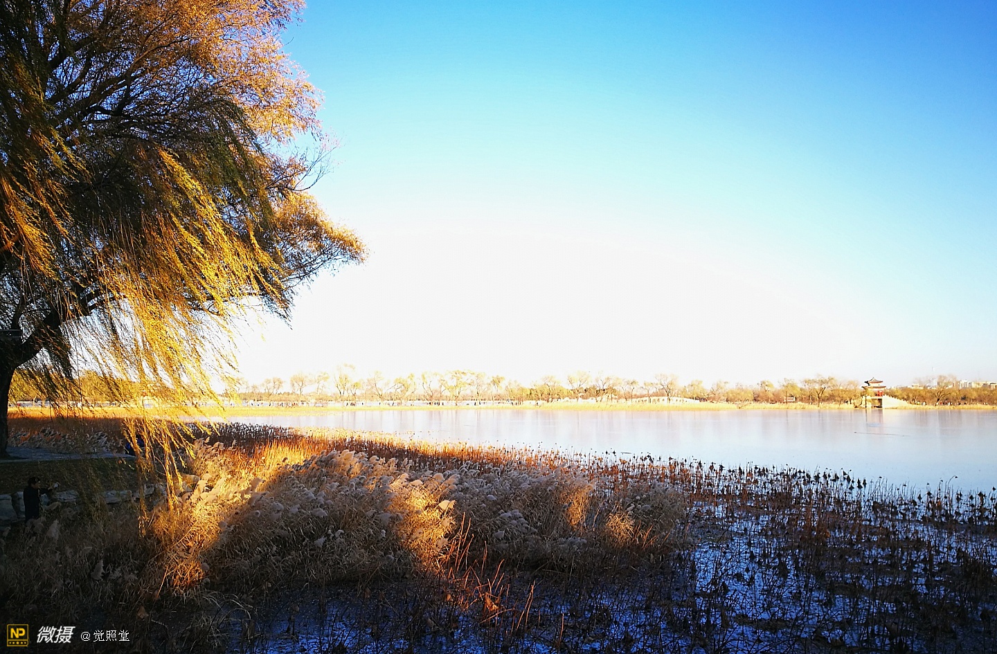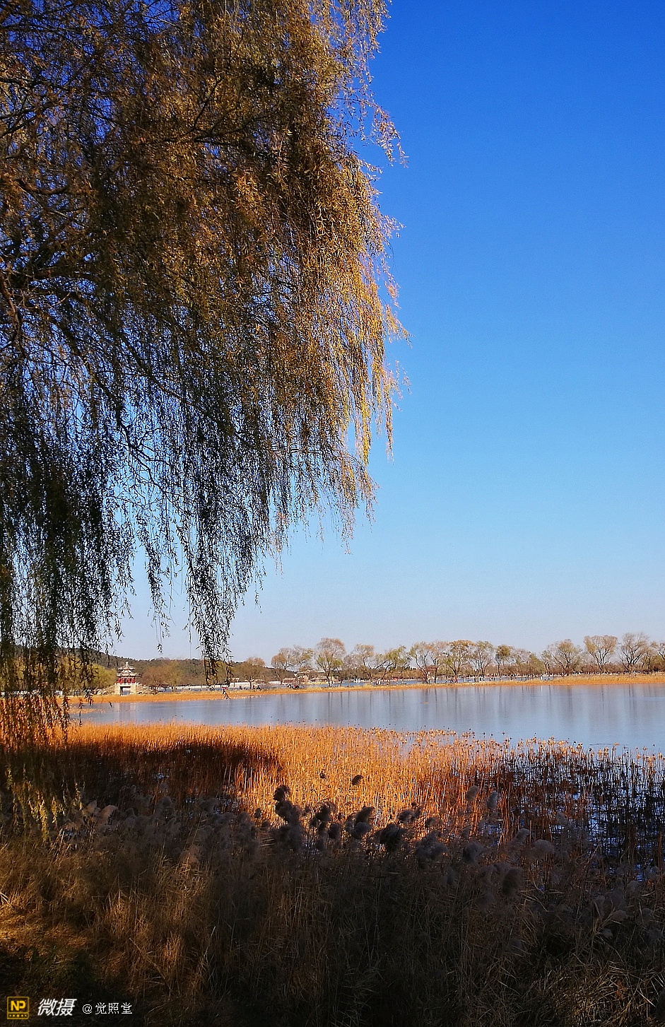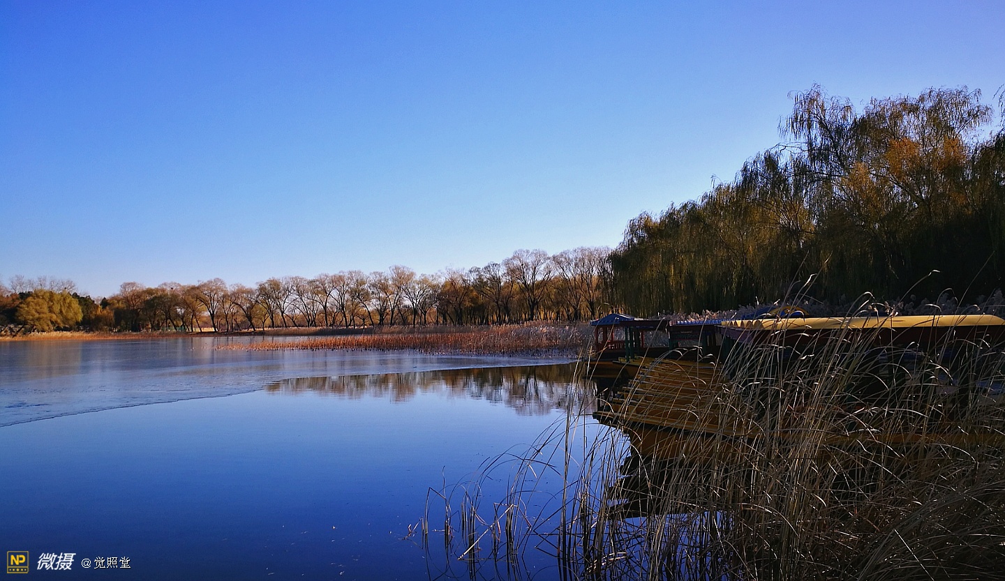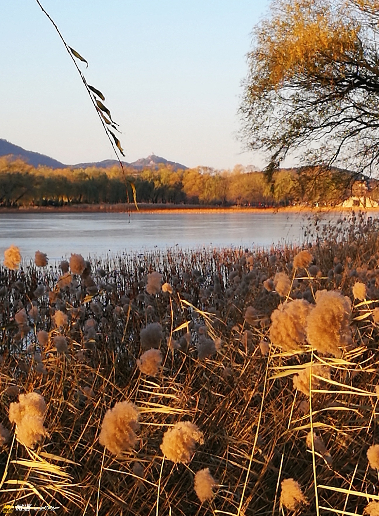 我漫步在这秋日的暖阳里,看头上的天空,看远处的高楼,以及远处依稀可见的山,看湖光塔影、亭台楼榭、看夕阳下的芦苇、残荷。有阳光陪衬,一切如此美好。金色风光惹人醉,更是惹得摄影人沉醉。