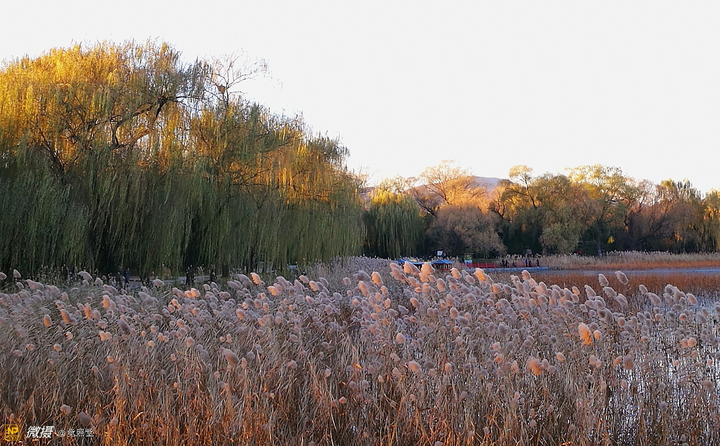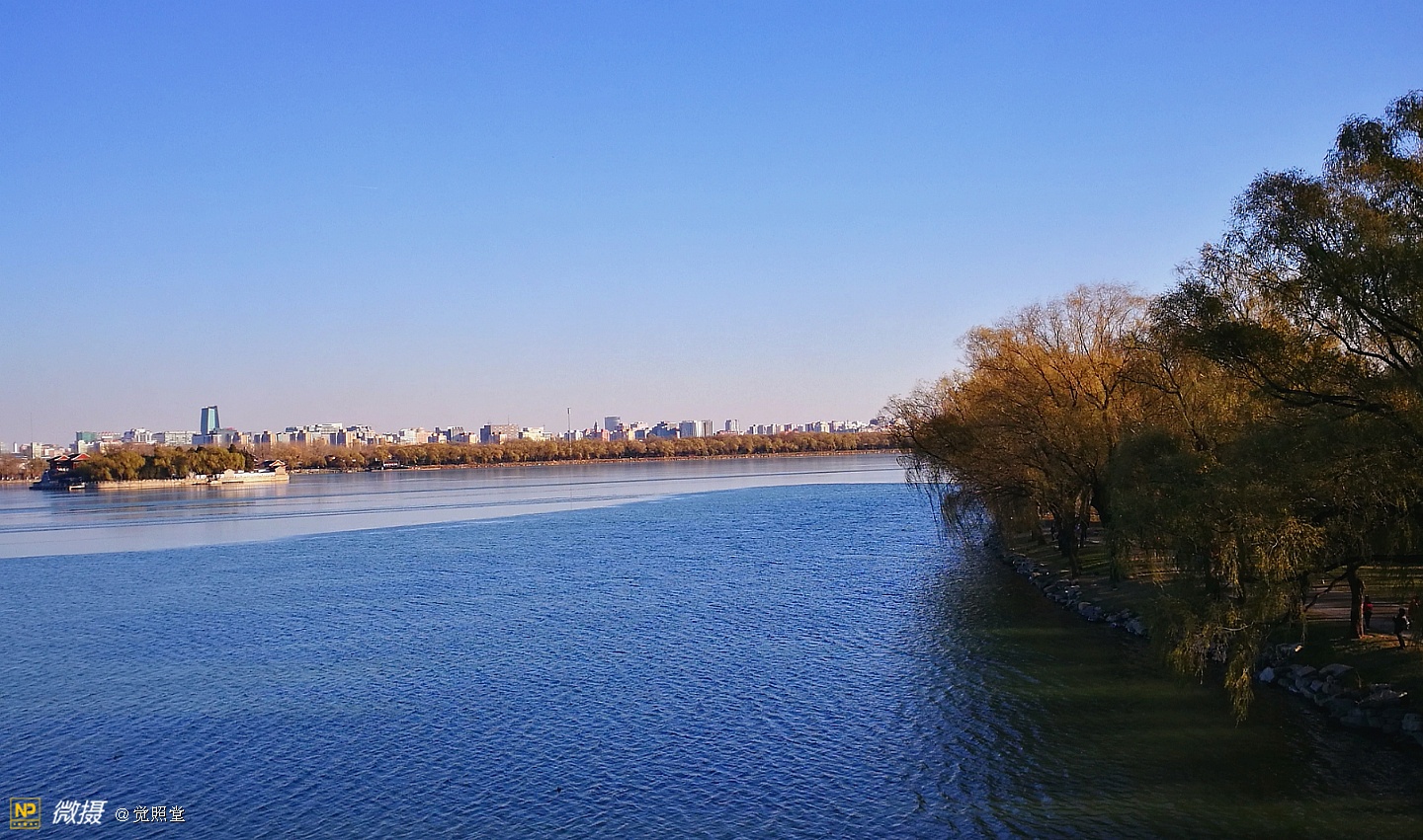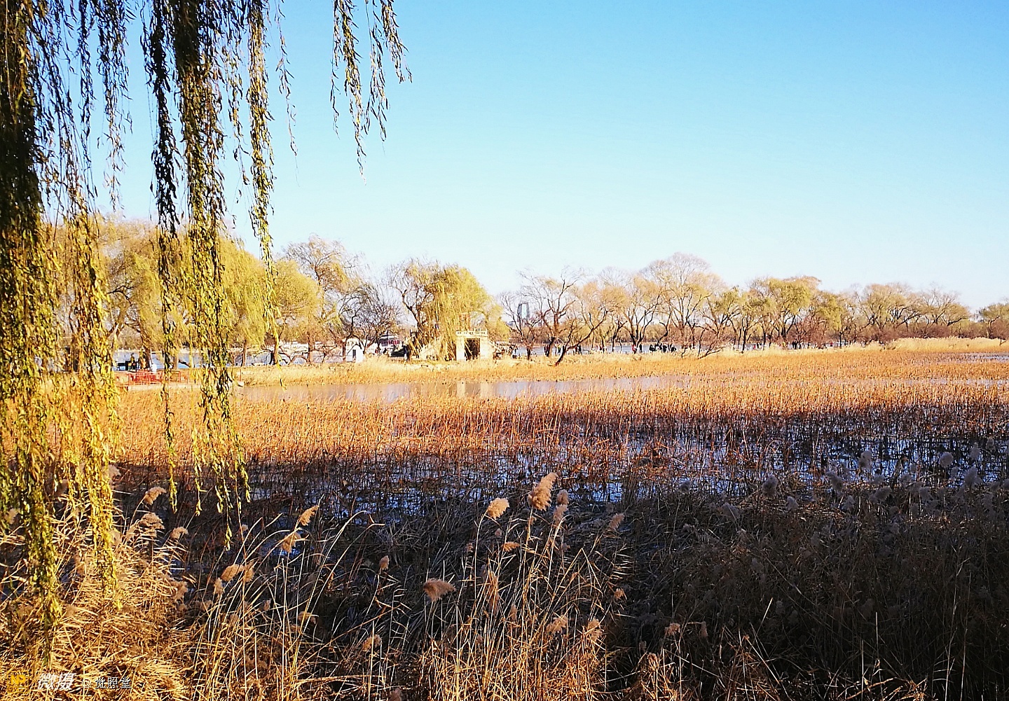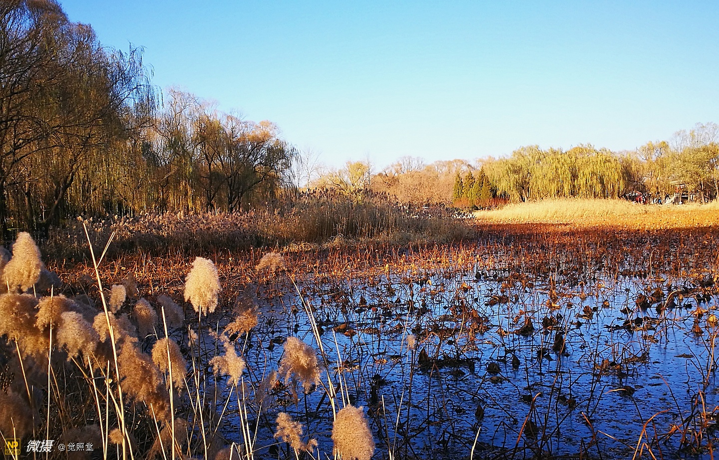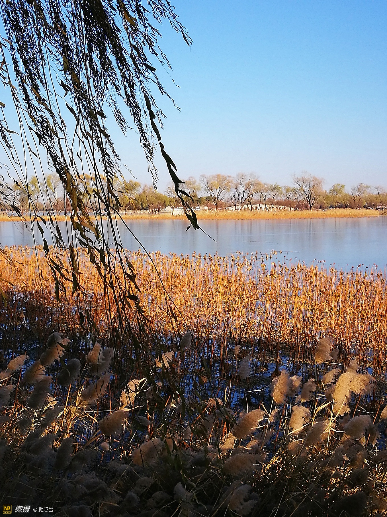 我漫步在这秋日的暖阳里,看头上的天空,看远处的高楼,以及远处依稀可见的山,看湖光塔影、亭台楼榭、看夕阳下的芦苇、残荷。有阳光陪衬,一切如此美好。金色风光惹人醉,更是惹得摄影人沉醉。