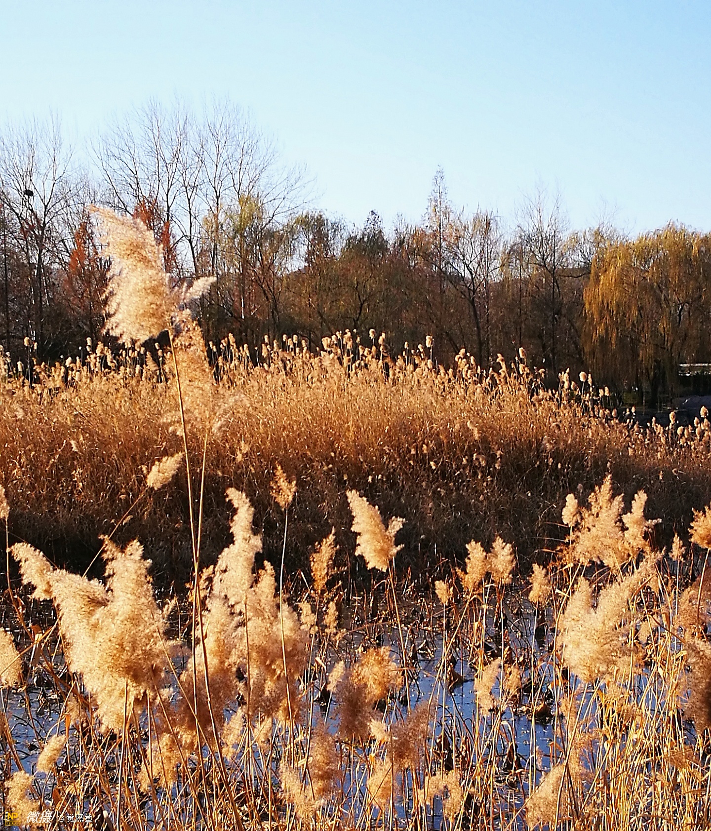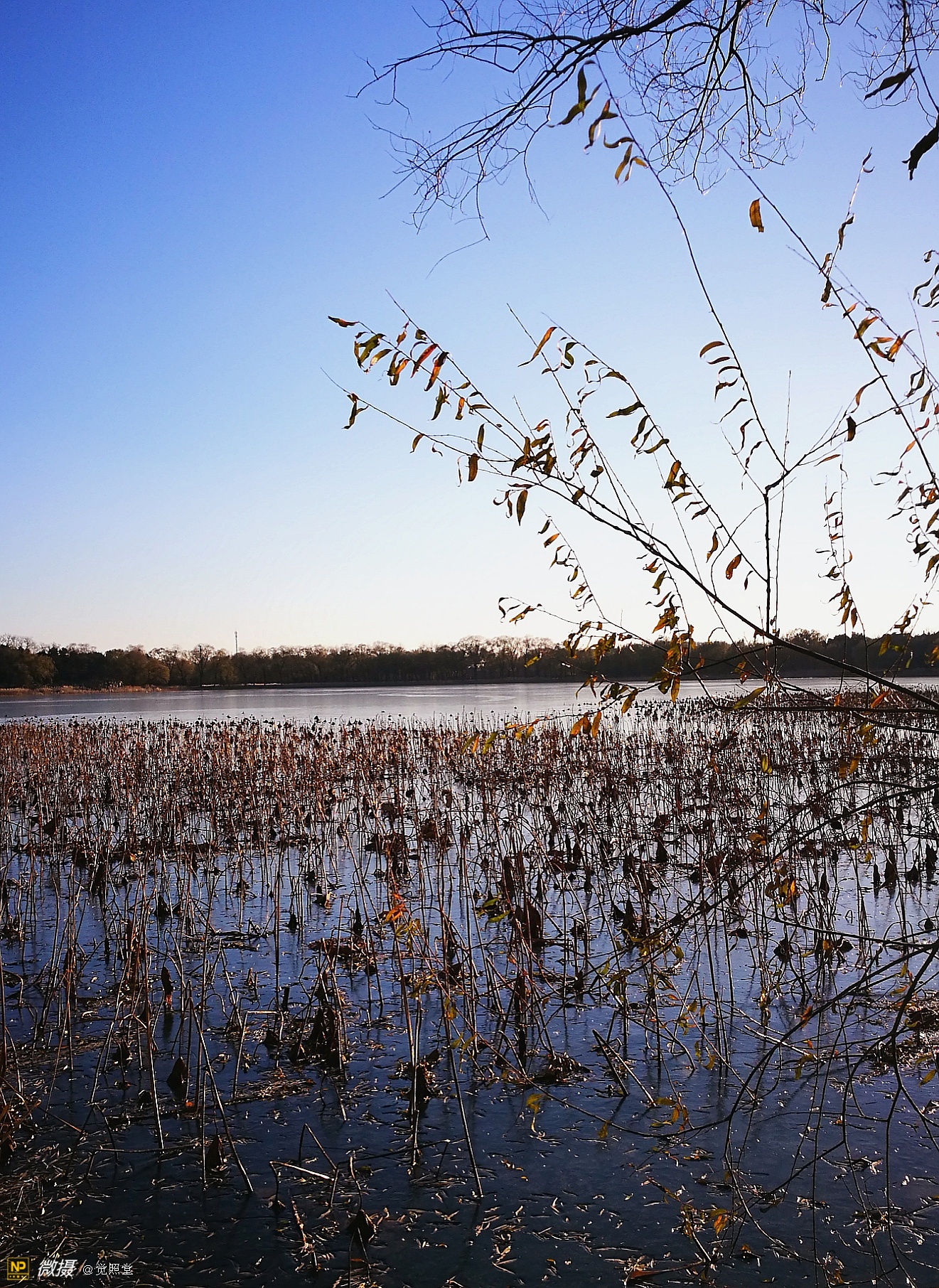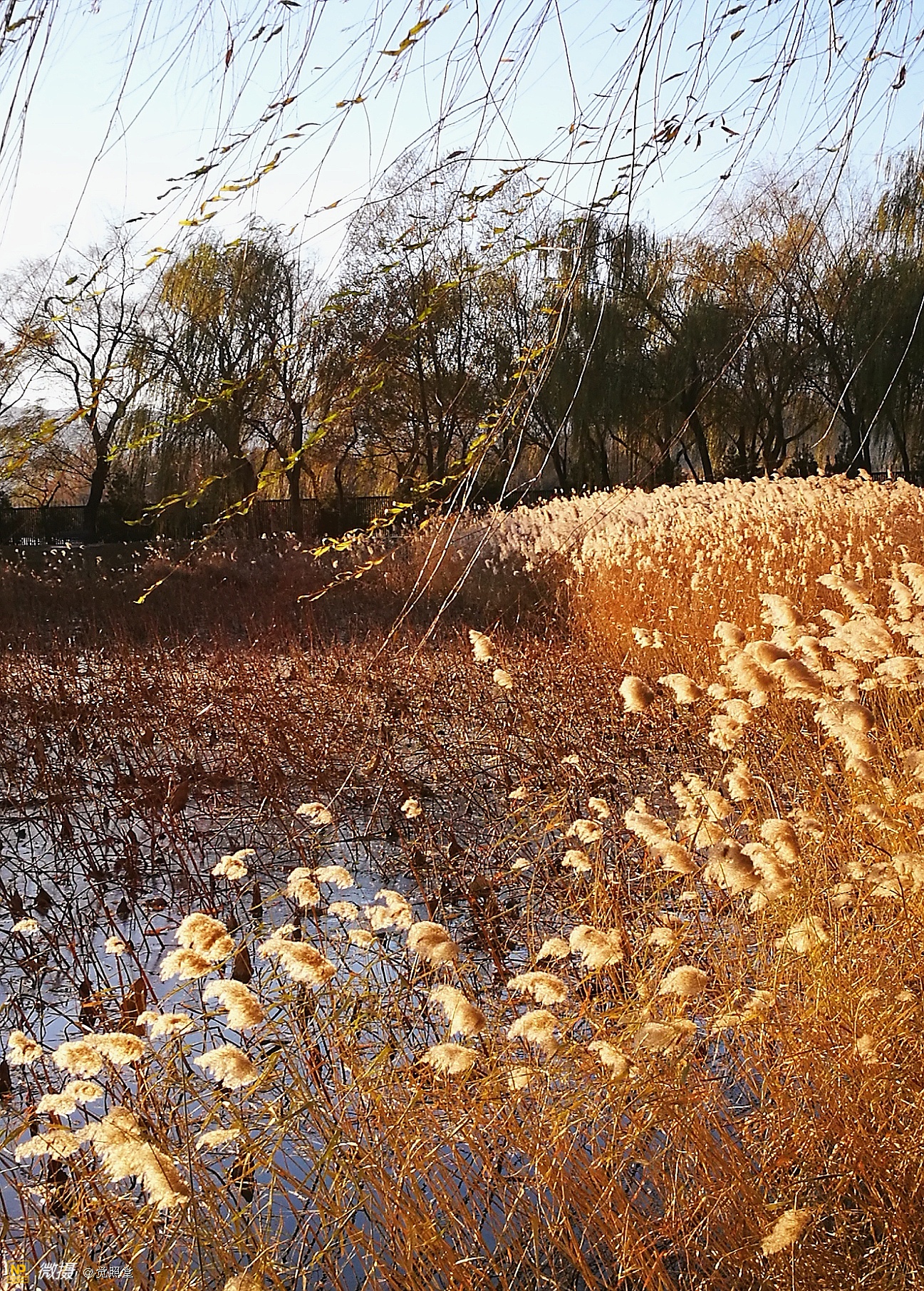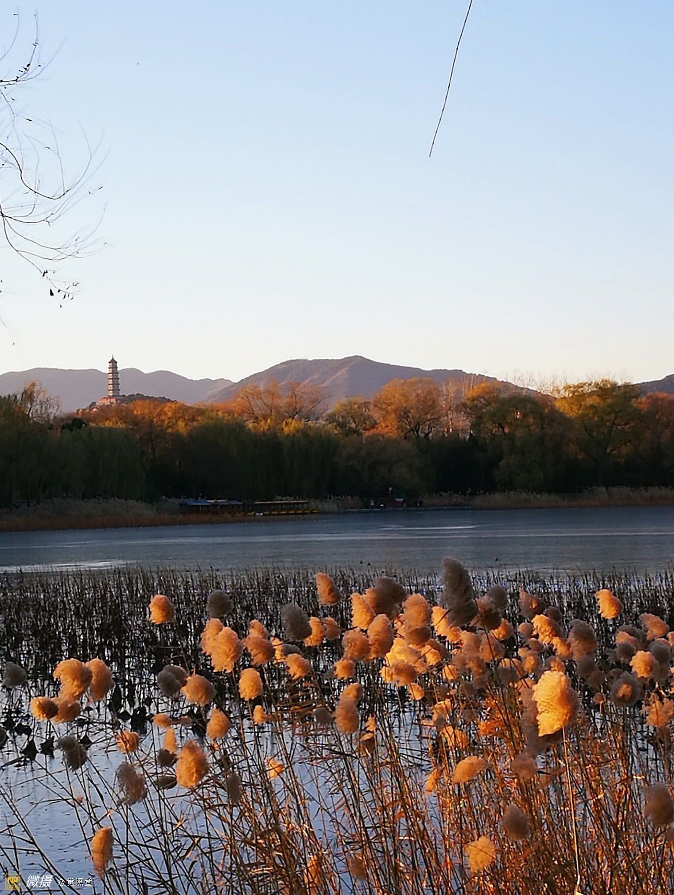我漫步在这秋日的暖阳里,看头上的天空,看远处的高楼,以及远处依稀可见的山,看湖光塔影、亭台楼榭、看夕阳下的芦苇、残荷。有阳光陪衬,一切如此美好。金色风光惹人醉,更是惹得摄影人沉醉。