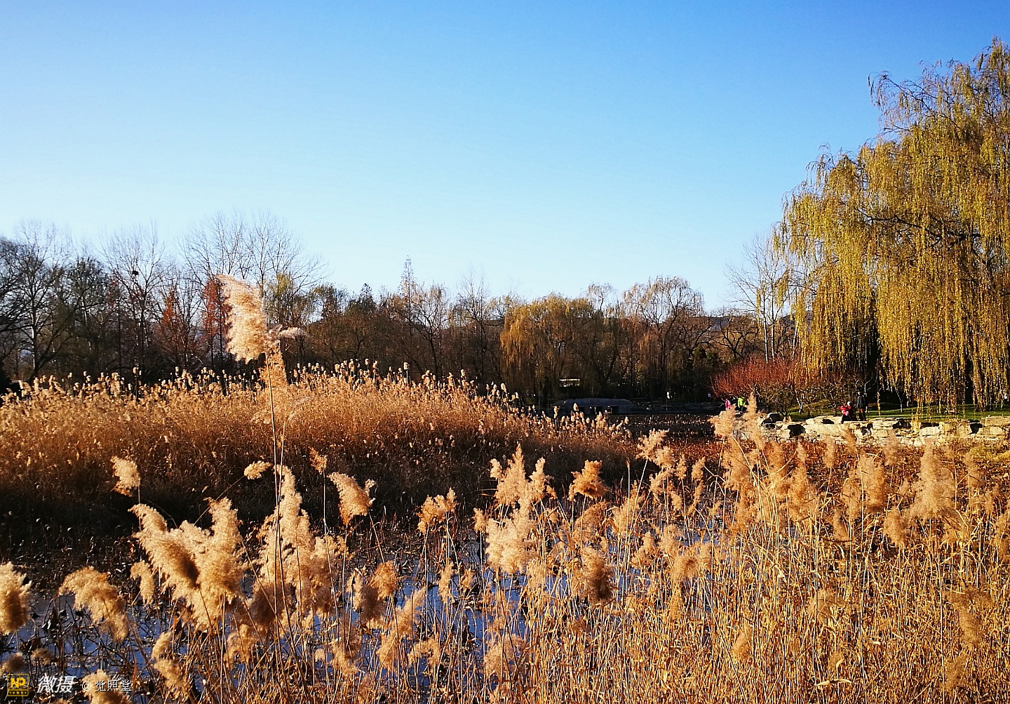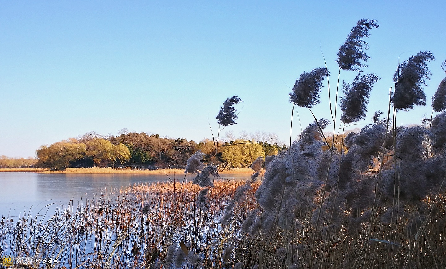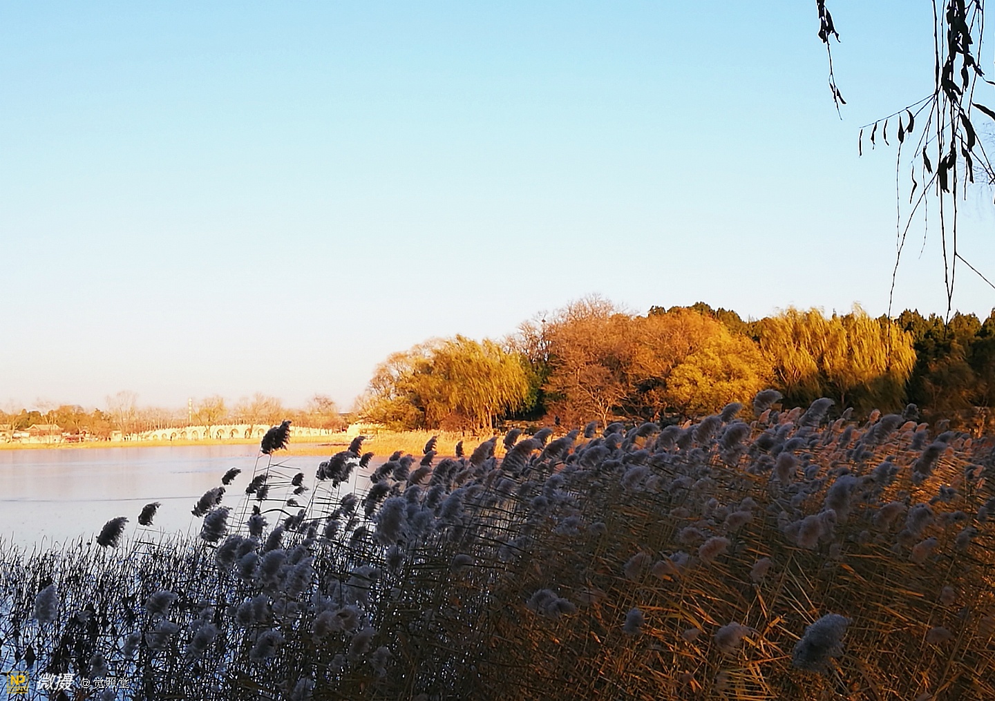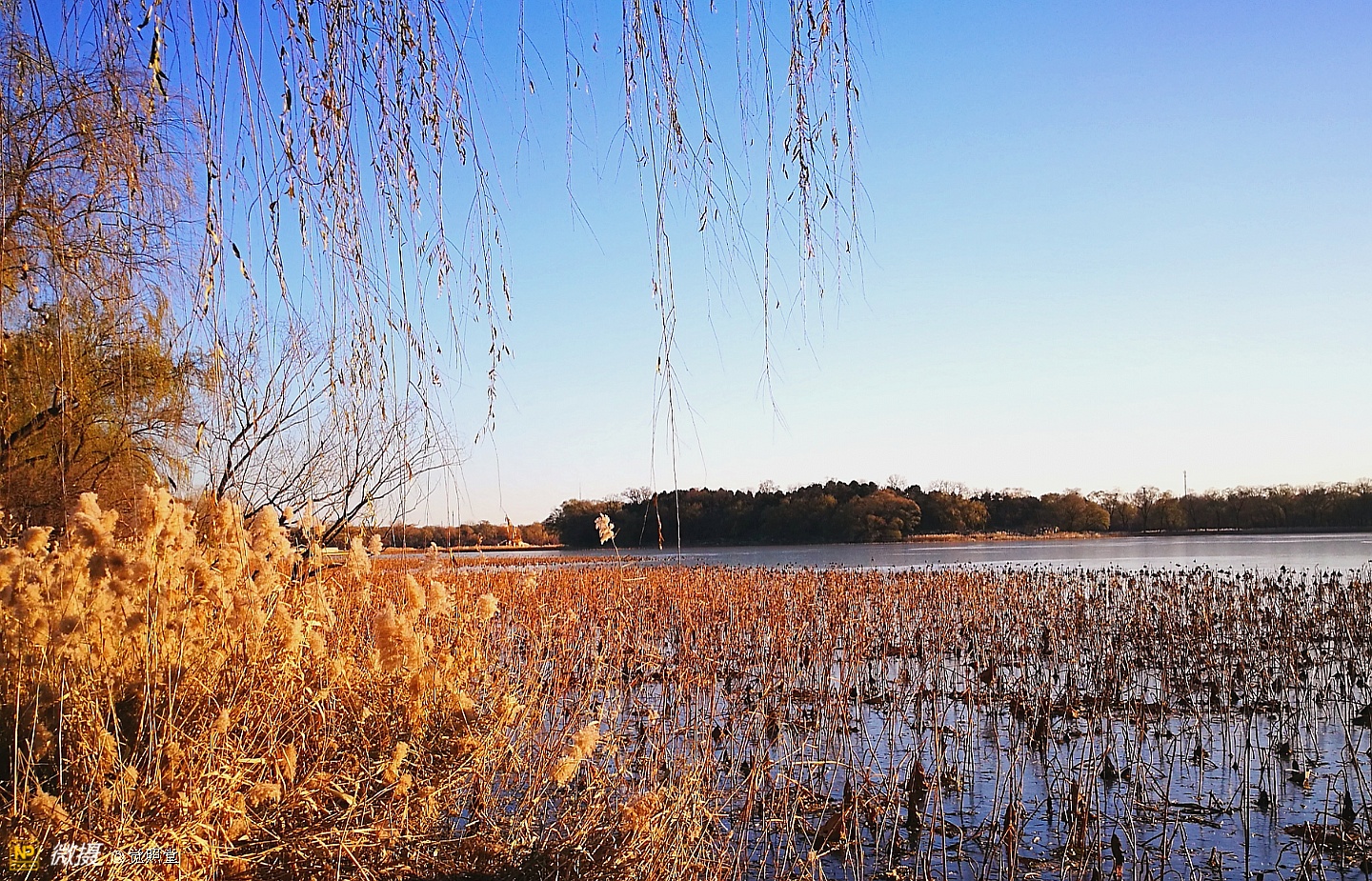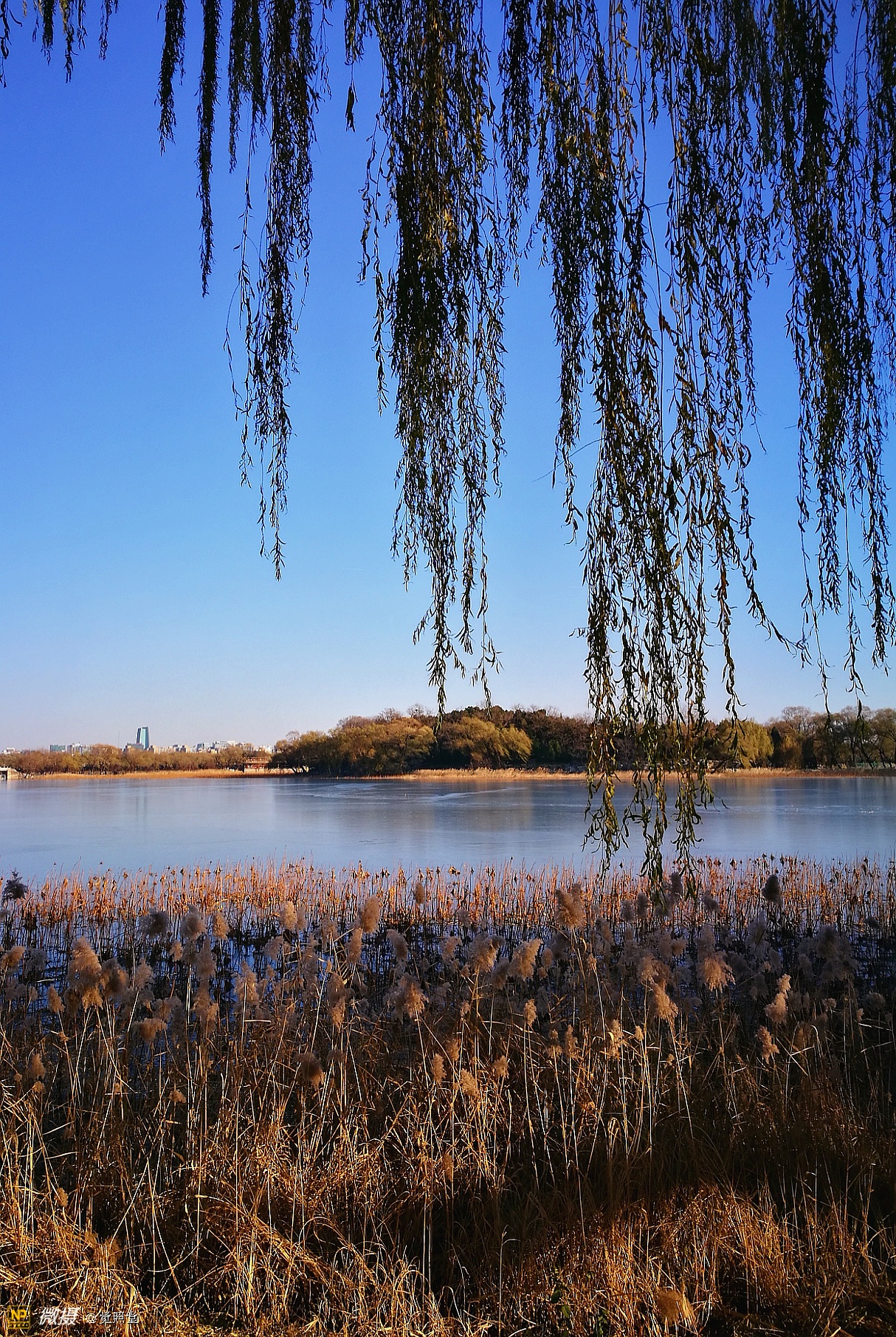 我漫步在这秋日的暖阳里,看头上的天空,看远处的高楼,以及远处依稀可见的山,看湖光塔影、亭台楼榭、看夕阳下的芦苇、残荷。有阳光陪衬,一切如此美好。金色风光惹人醉,更是惹得摄影人沉醉。