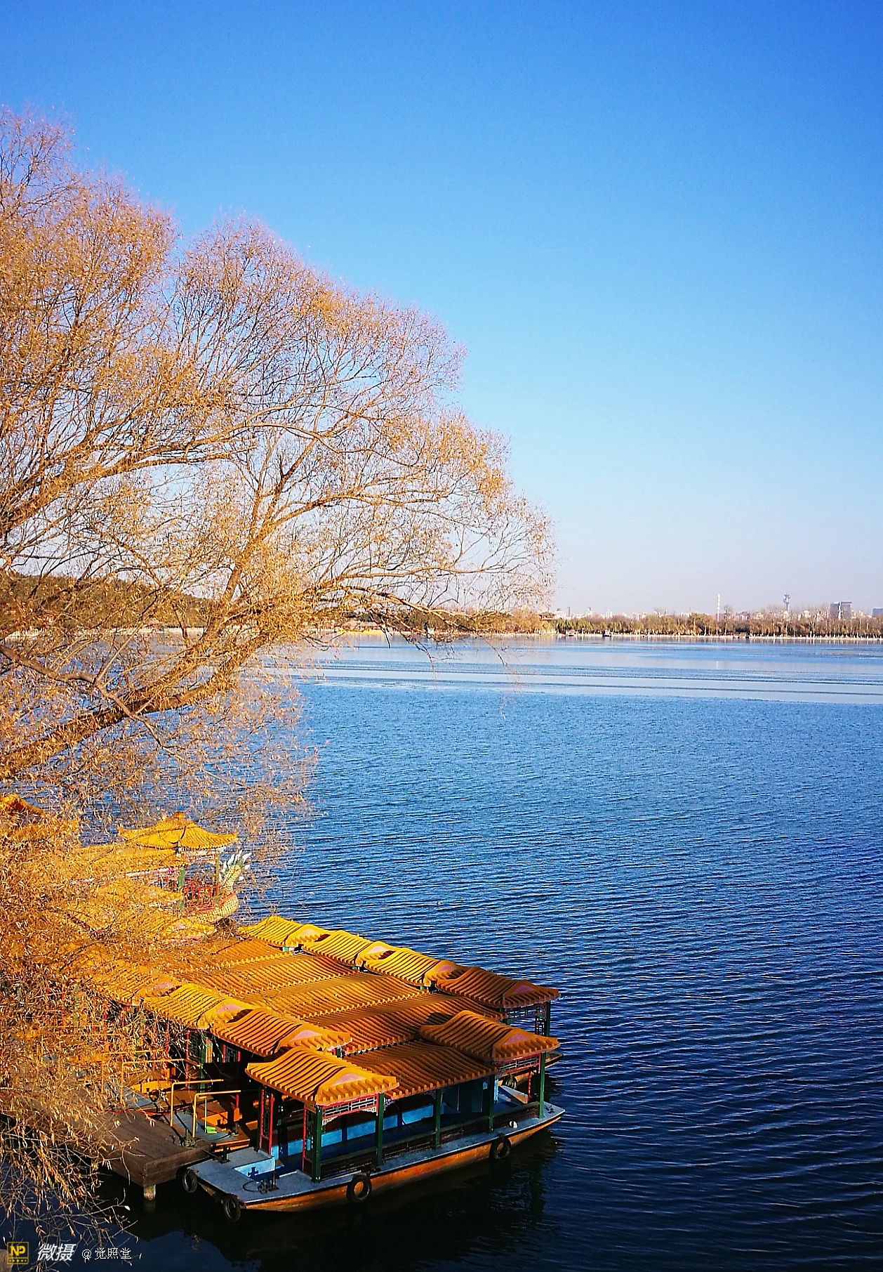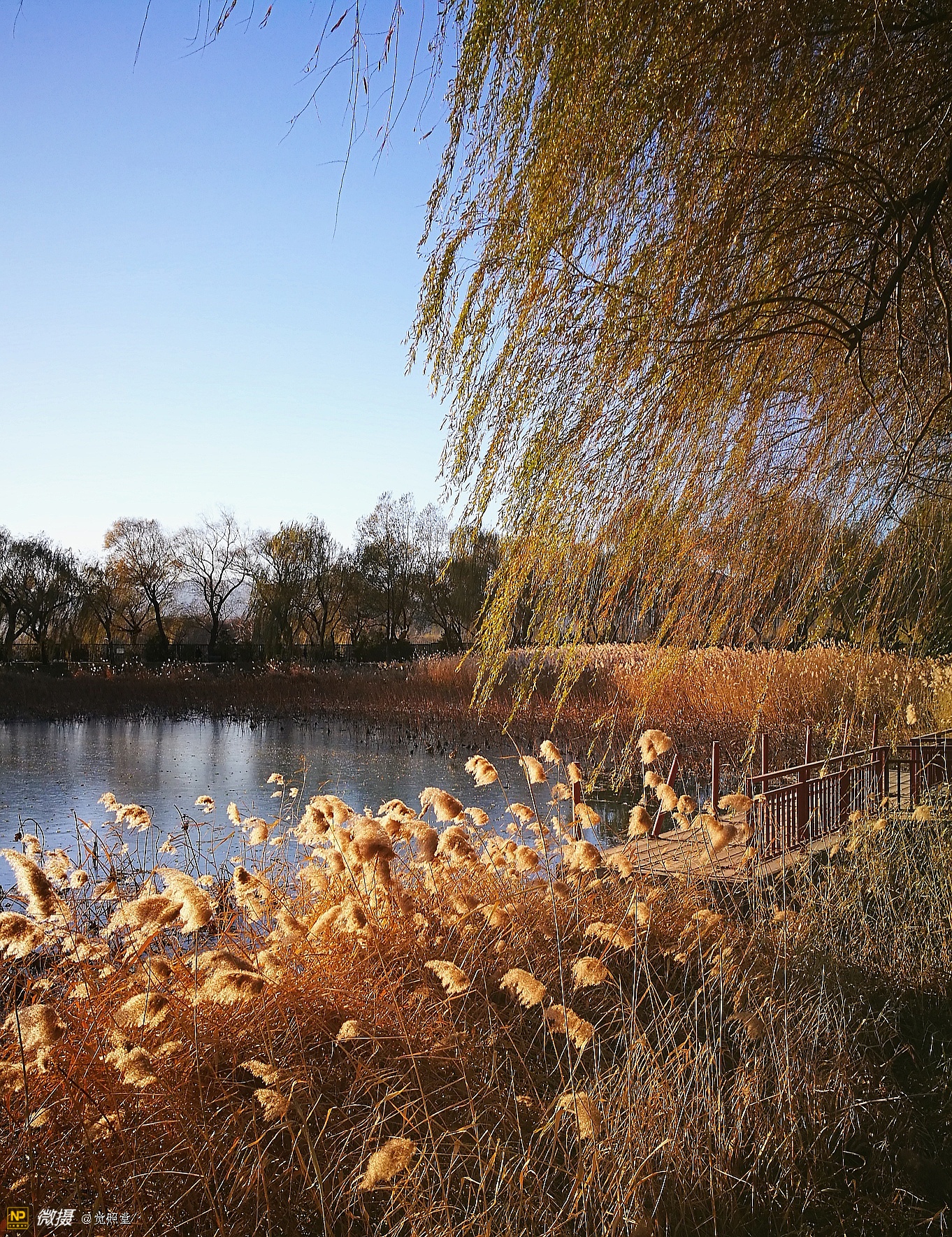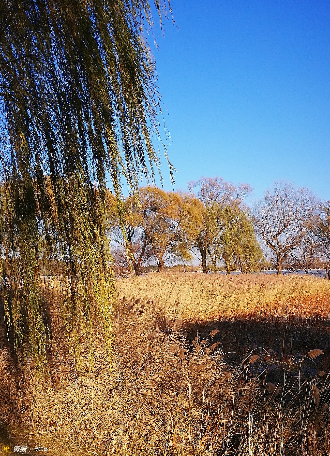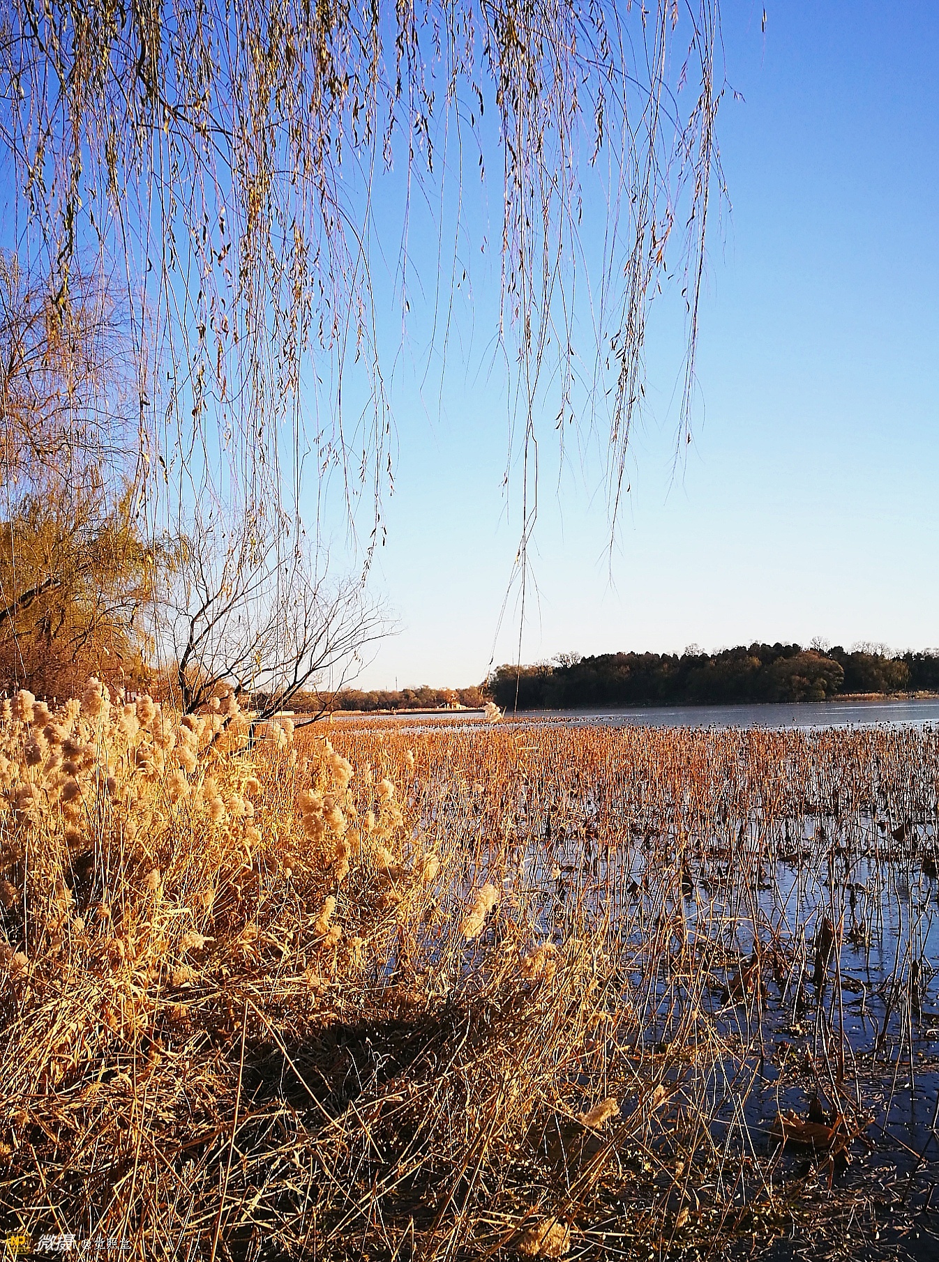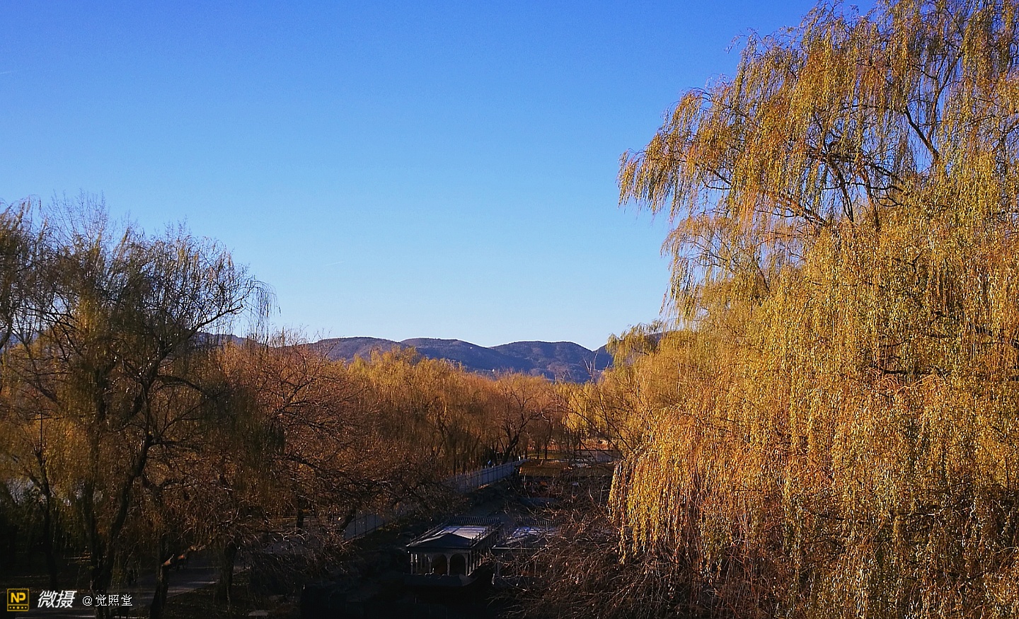 我漫步在这秋日的暖阳里,看头上的天空,看远处的高楼,以及远处依稀可见的山,看湖光塔影、亭台楼榭、看夕阳下的芦苇、残荷。有阳光陪衬,一切如此美好。金色风光惹人醉,更是惹得摄影人沉醉。