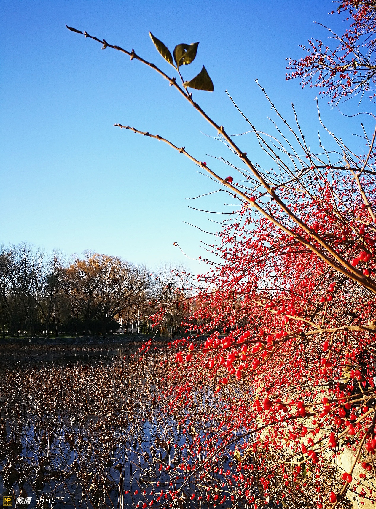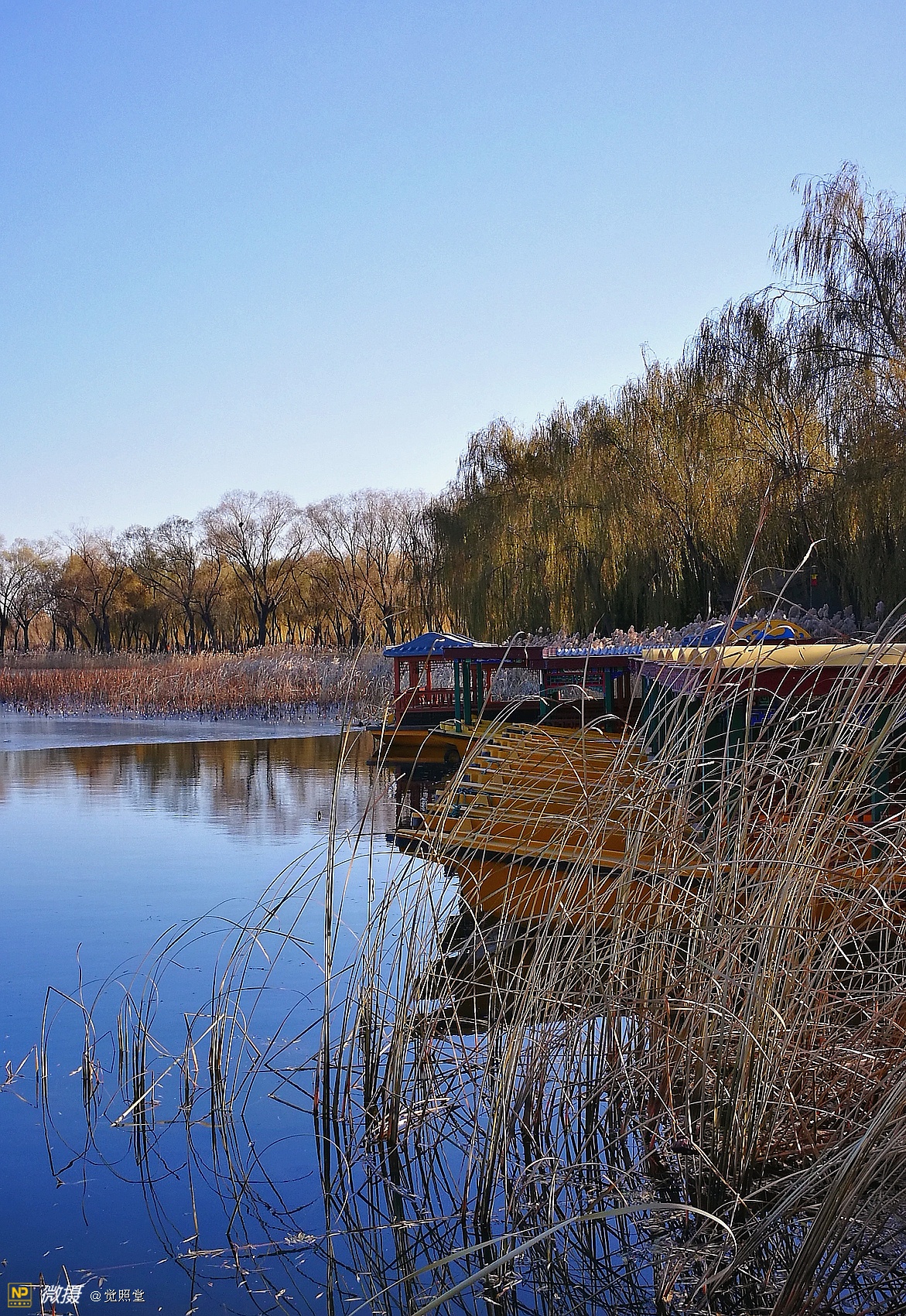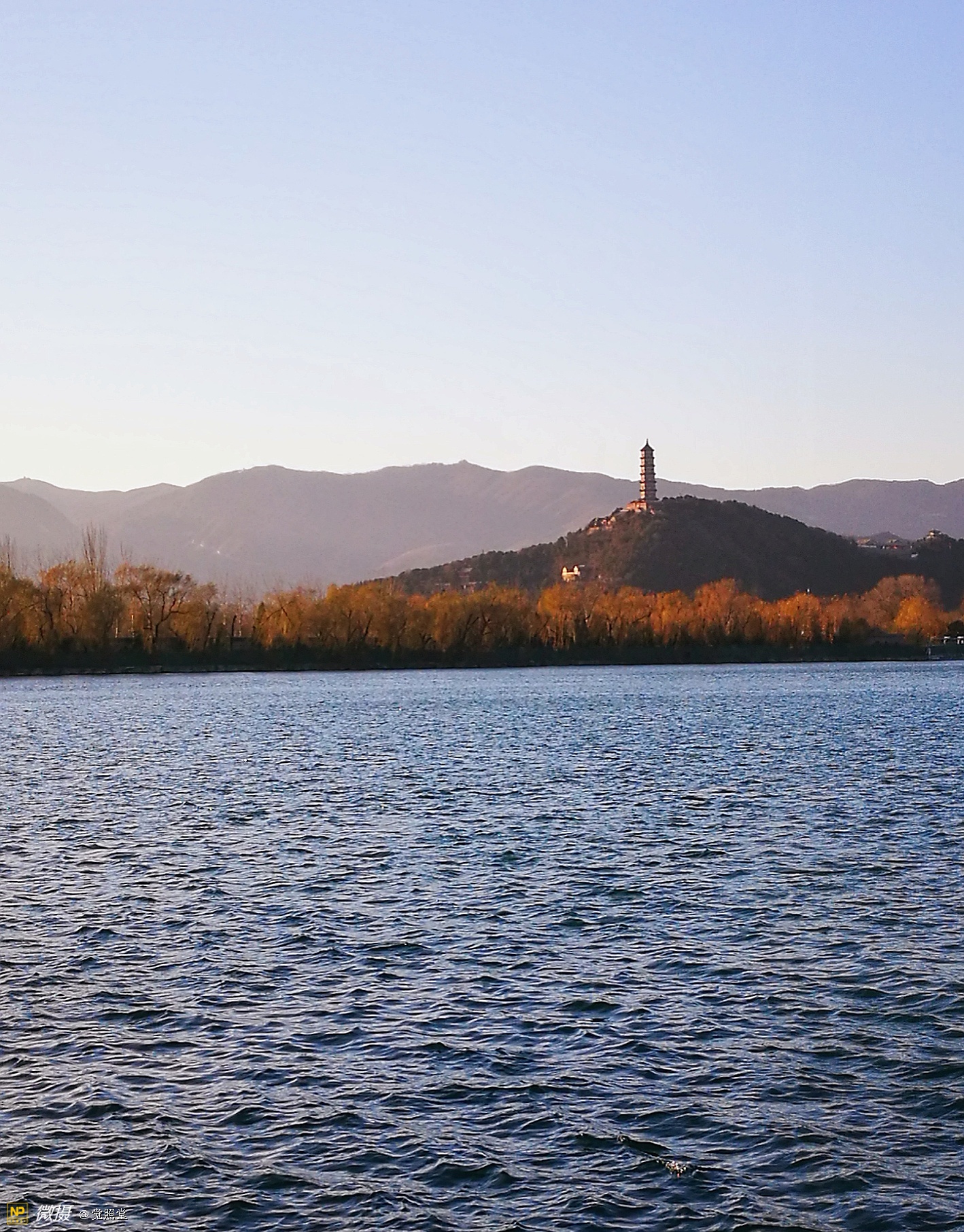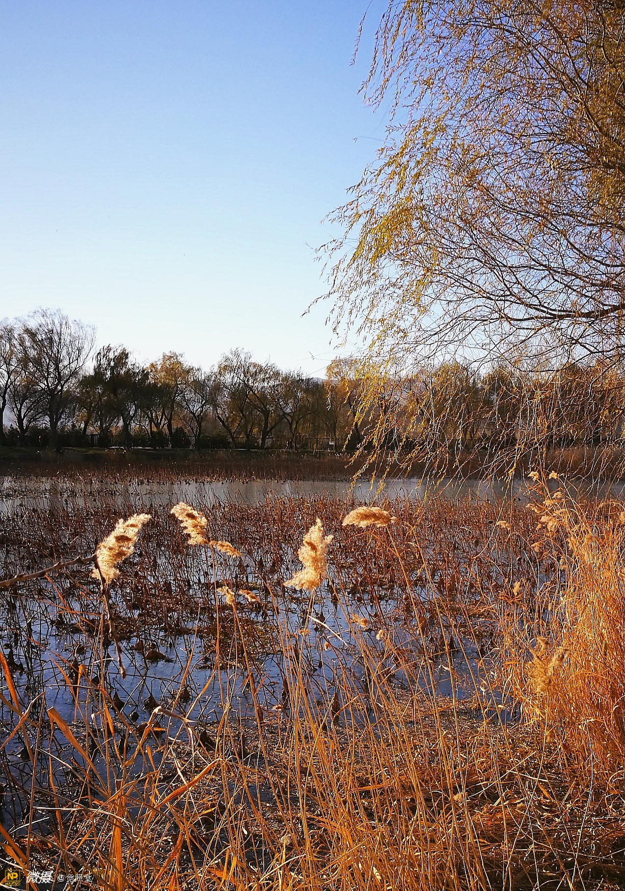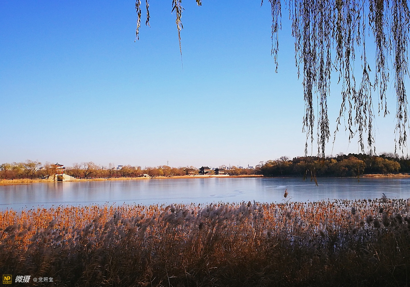 我漫步在这秋日的暖阳里,看头上的天空,看远处的高楼,以及远处依稀可见的山,看湖光塔影、亭台楼榭、看夕阳下的芦苇、残荷。有阳光陪衬,一切如此美好。金色风光惹人醉,更是惹得摄影人沉醉。