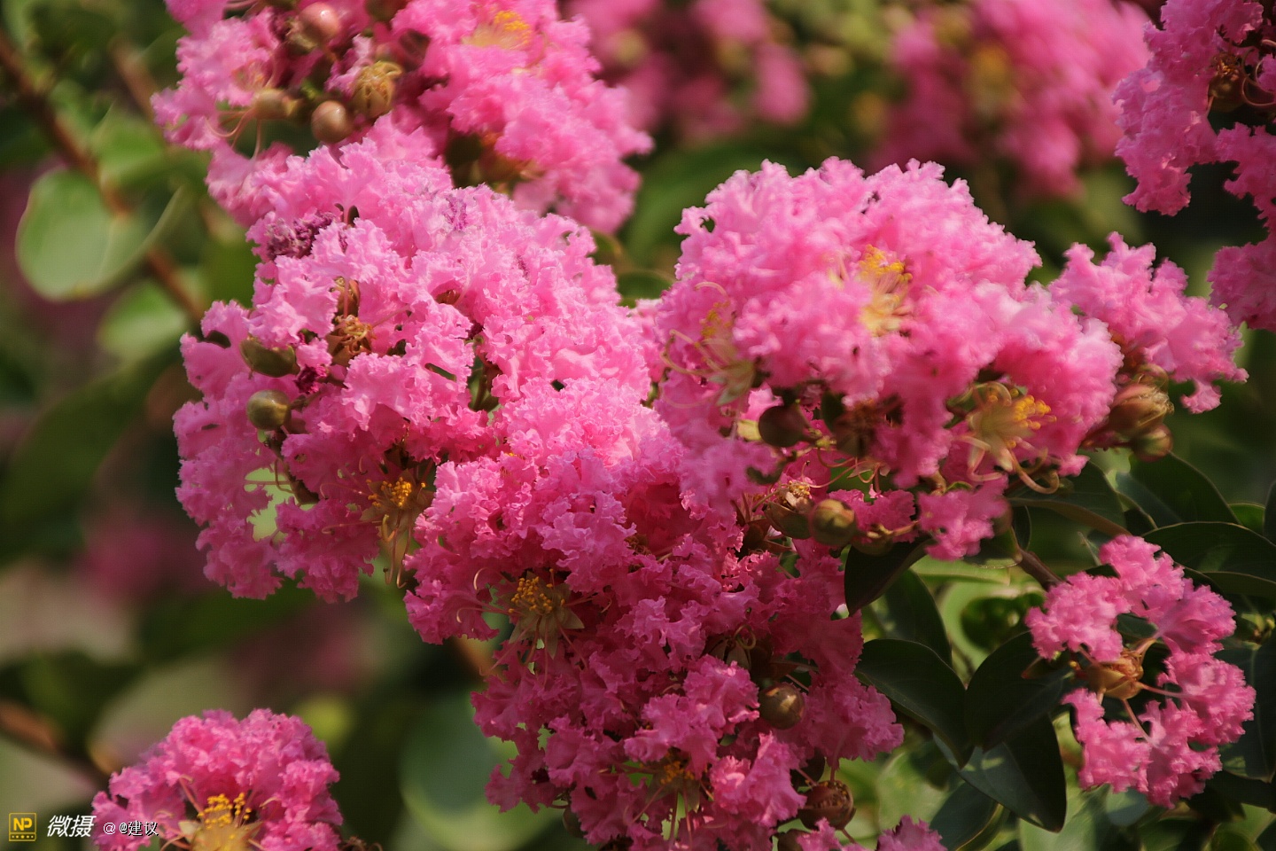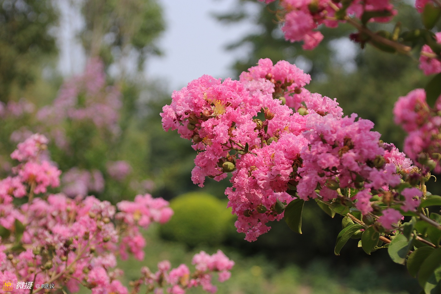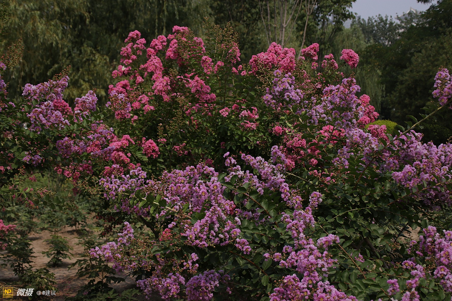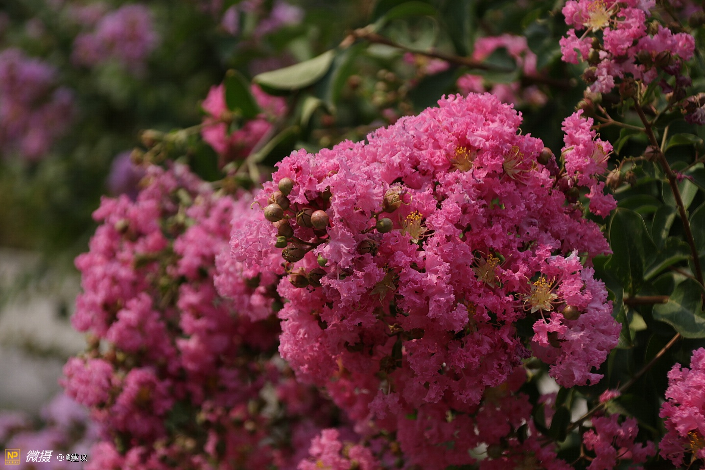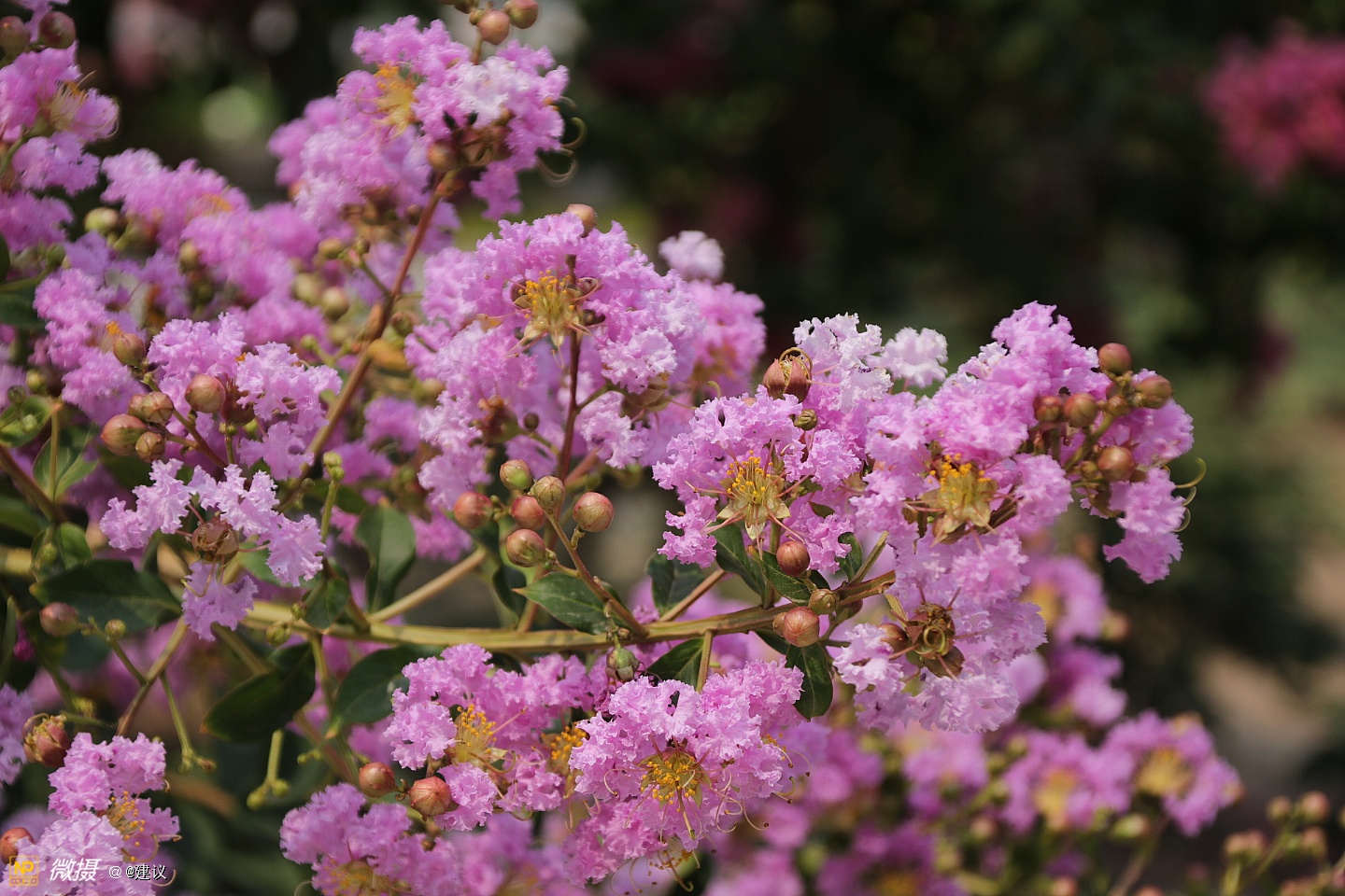 紫薇,别名:痒痒花、痒痒树、紫金花、紫兰花、蚊子花、西洋水杨梅、百日红、无皮树,拉丁文名:Lagerstroemia indica L. 千屈菜科、紫薇属落叶灌木或小乔木,高可达7米;树皮平滑,灰色或灰褐色;枝干多扭曲,小枝纤细,叶互生或有时对生,纸质,椭圆形、阔矩圆形或倒卵形,幼时绿色至黄色,成熟时或干燥时呈紫黑色,室背开裂;种子有翅,长约8毫米。花期6-9月,果期9-12月。紫薇树姿优美,树干光滑洁净,花色艳丽;开花时正当夏秋少花季节,花期长,故有“百日红”之称,又有“盛夏绿遮眼,此花红满堂”的赞语,是观花、观干、观根的盆景良材;根、皮、叶、花皆可入药。