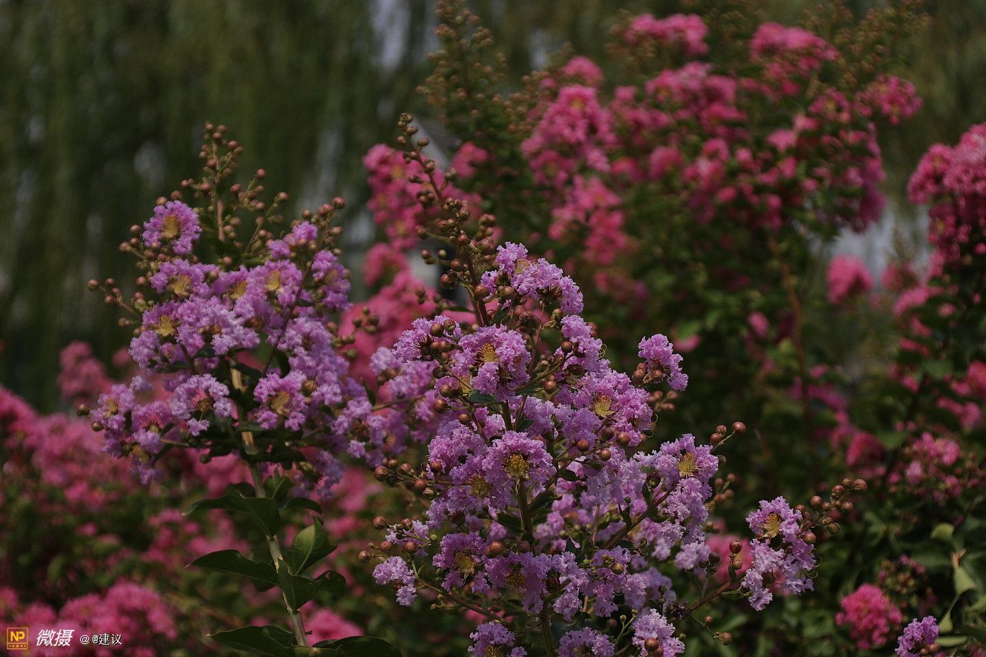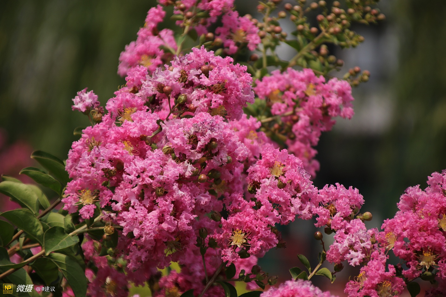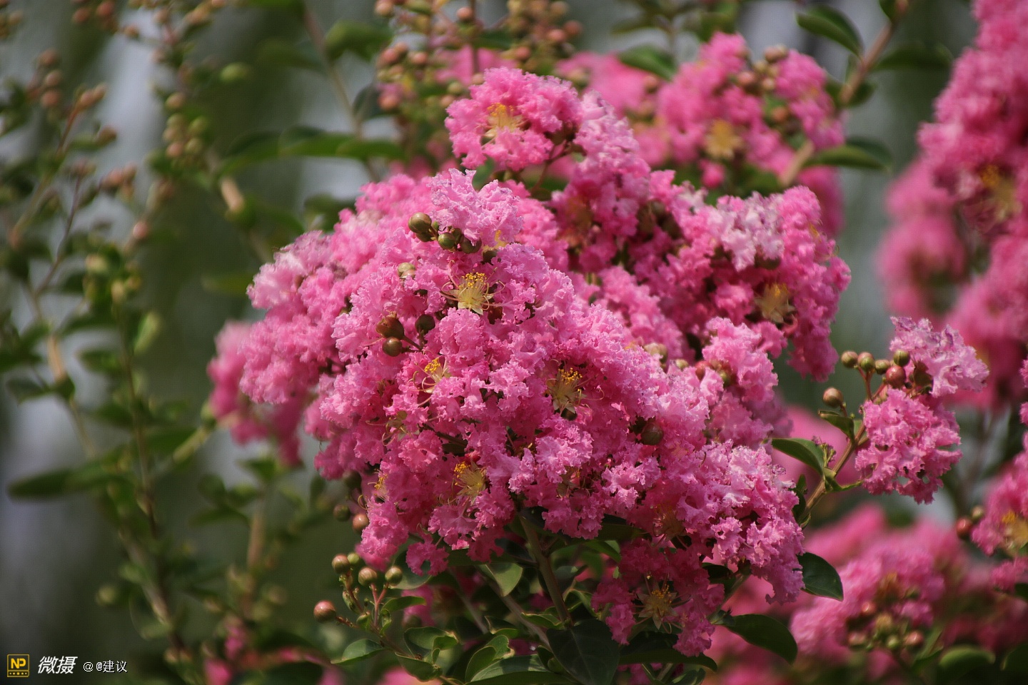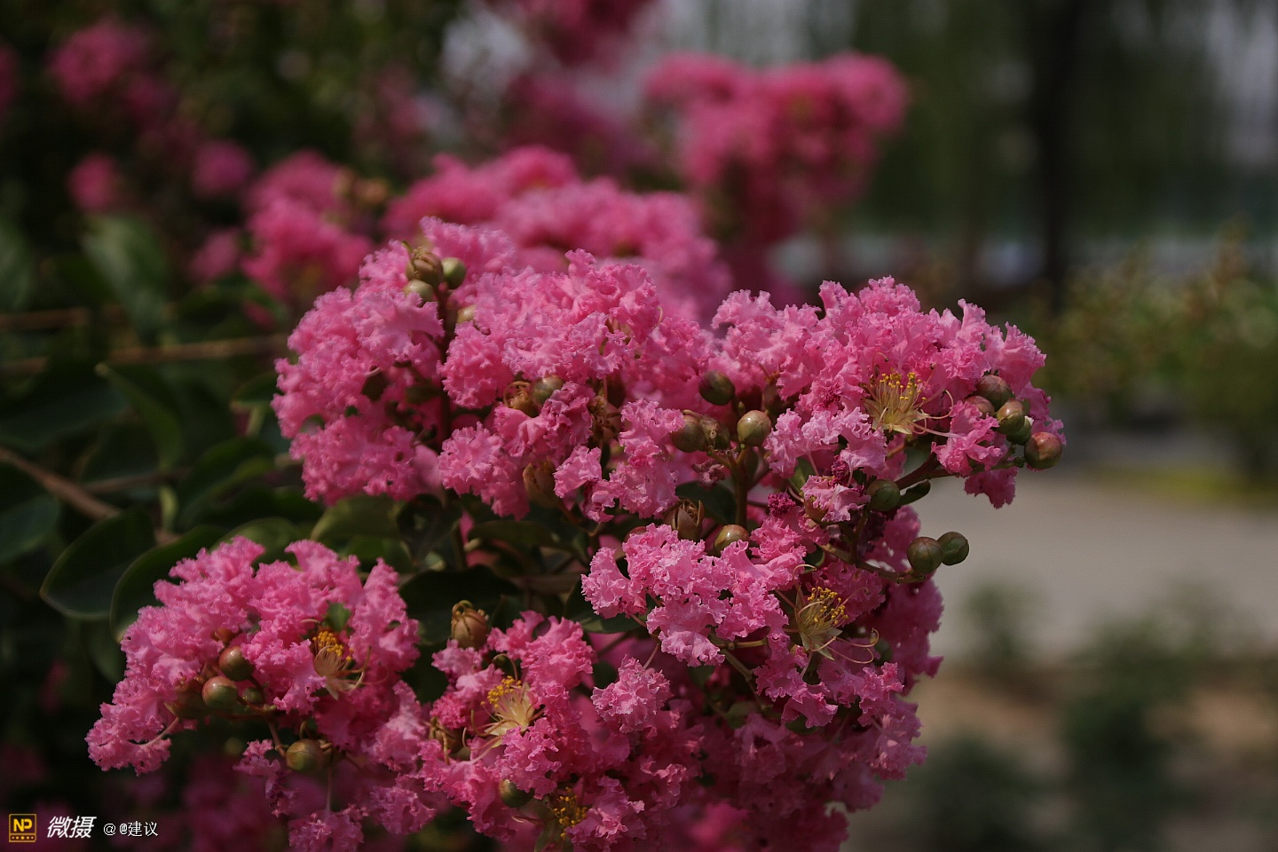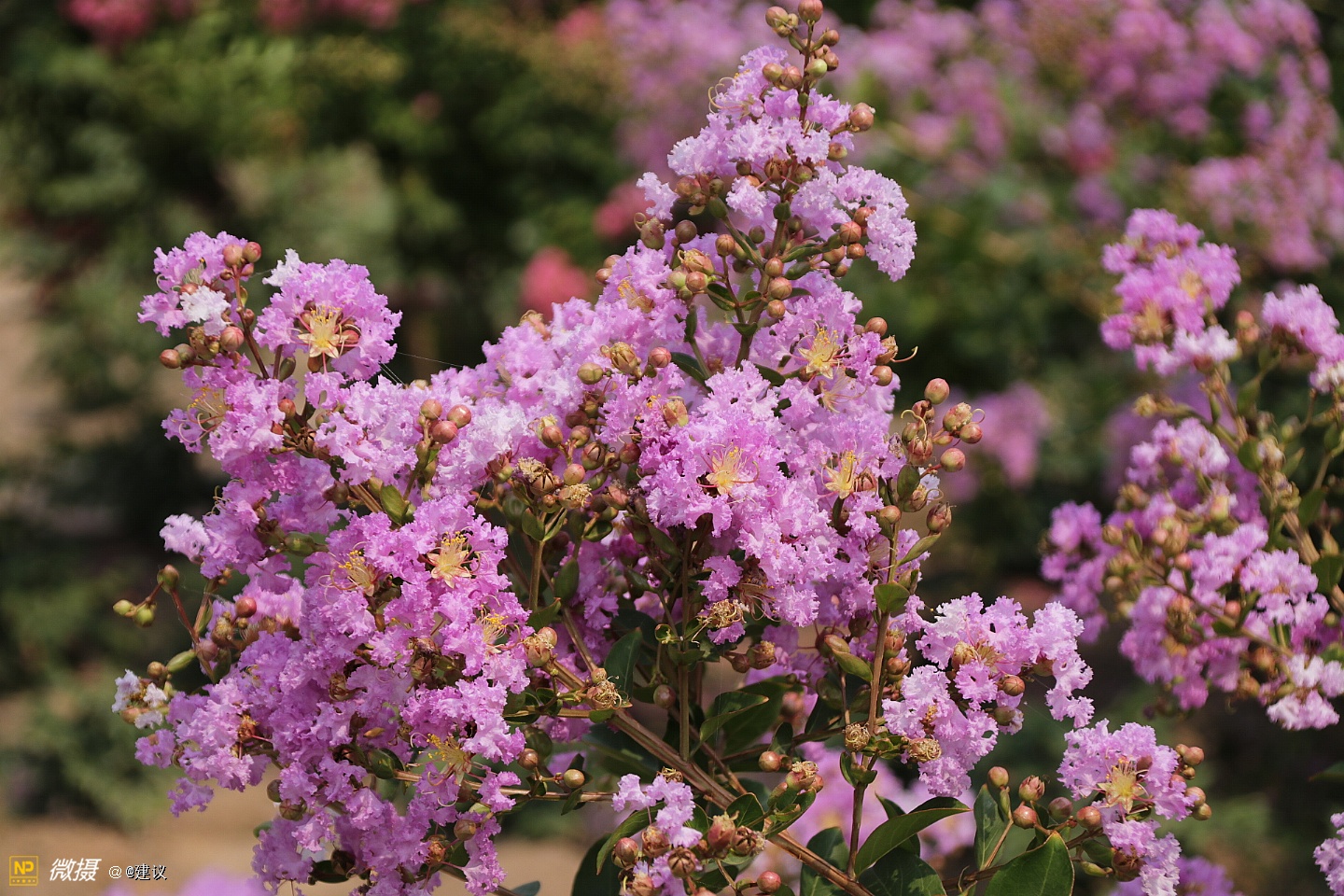 紫薇,别名:痒痒花、痒痒树、紫金花、紫兰花、蚊子花、西洋水杨梅、百日红、无皮树,拉丁文名:Lagerstroemia indica L. 千屈菜科、紫薇属落叶灌木或小乔木,高可达7米;树皮平滑,灰色或灰褐色;枝干多扭曲,小枝纤细,叶互生或有时对生,纸质,椭圆形、阔矩圆形或倒卵形,幼时绿色至黄色,成熟时或干燥时呈紫黑色,室背开裂;种子有翅,长约8毫米。花期6-9月,果期9-12月。紫薇树姿优美,树干光滑洁净,花色艳丽;开花时正当夏秋少花季节,花期长,故有“百日红”之称,又有“盛夏绿遮眼,此花红满堂”的赞语,是观花、观干、观根的盆景良材;根、皮、叶、花皆可入药。