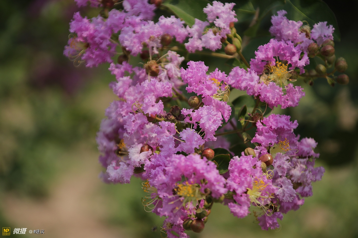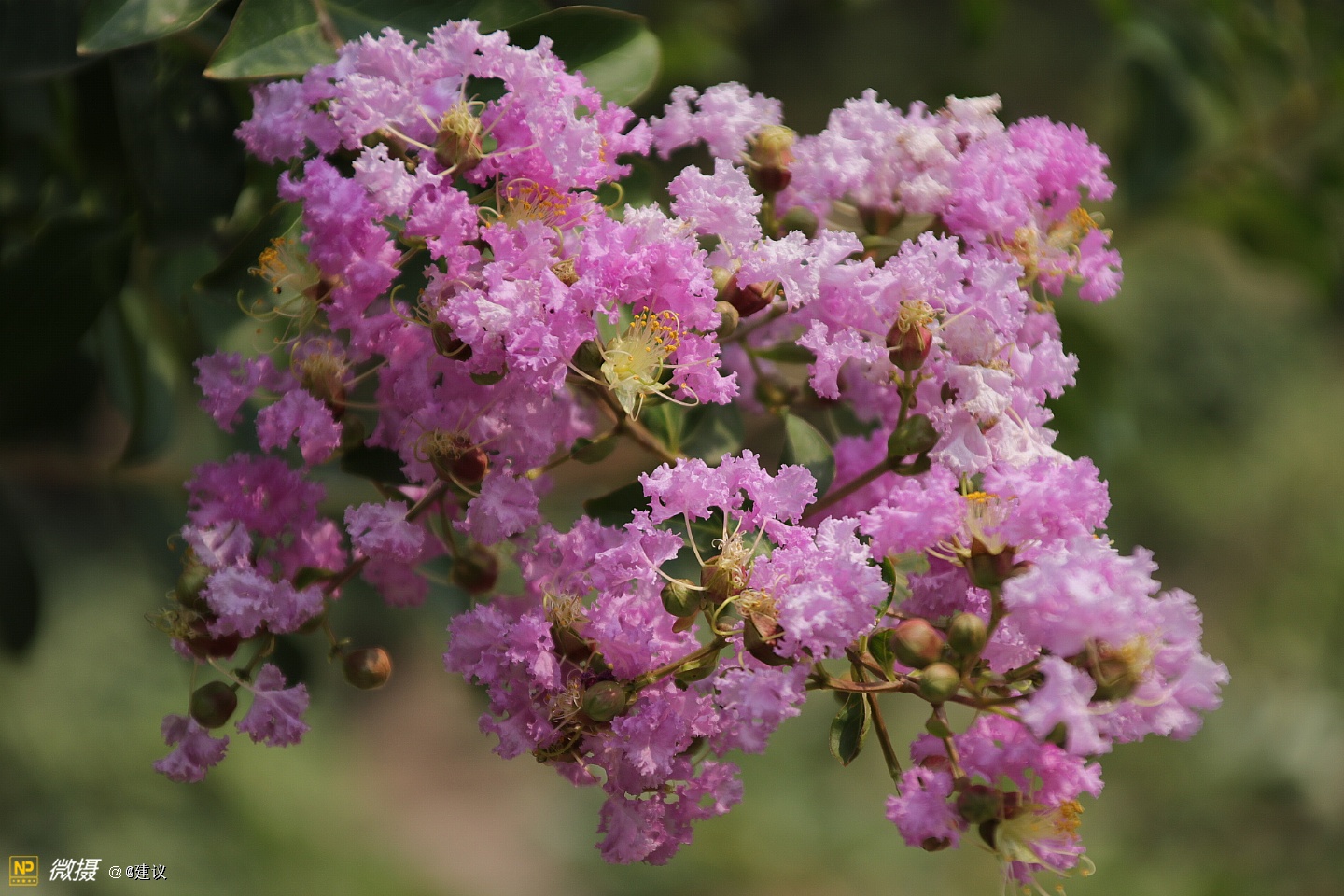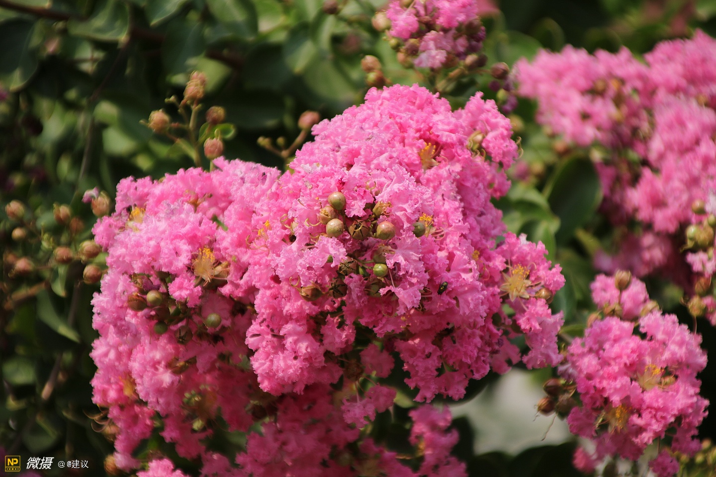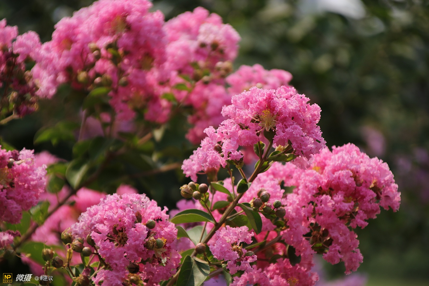 紫薇,别名:痒痒花、痒痒树、紫金花、紫兰花、蚊子花、西洋水杨梅、百日红、无皮树,拉丁文名:Lagerstroemia indica L. 千屈菜科、紫薇属落叶灌木或小乔木,高可达7米;树皮平滑,灰色或灰褐色;枝干多扭曲,小枝纤细,叶互生或有时对生,纸质,椭圆形、阔矩圆形或倒卵形,幼时绿色至黄色,成熟时或干燥时呈紫黑色,室背开裂;种子有翅,长约8毫米。花期6-9月,果期9-12月。紫薇树姿优美,树干光滑洁净,花色艳丽;开花时正当夏秋少花季节,花期长,故有“百日红”之称,又有“盛夏绿遮眼,此花红满堂”的赞语,是观花、观干、观根的盆景良材;根、皮、叶、花皆可入药。