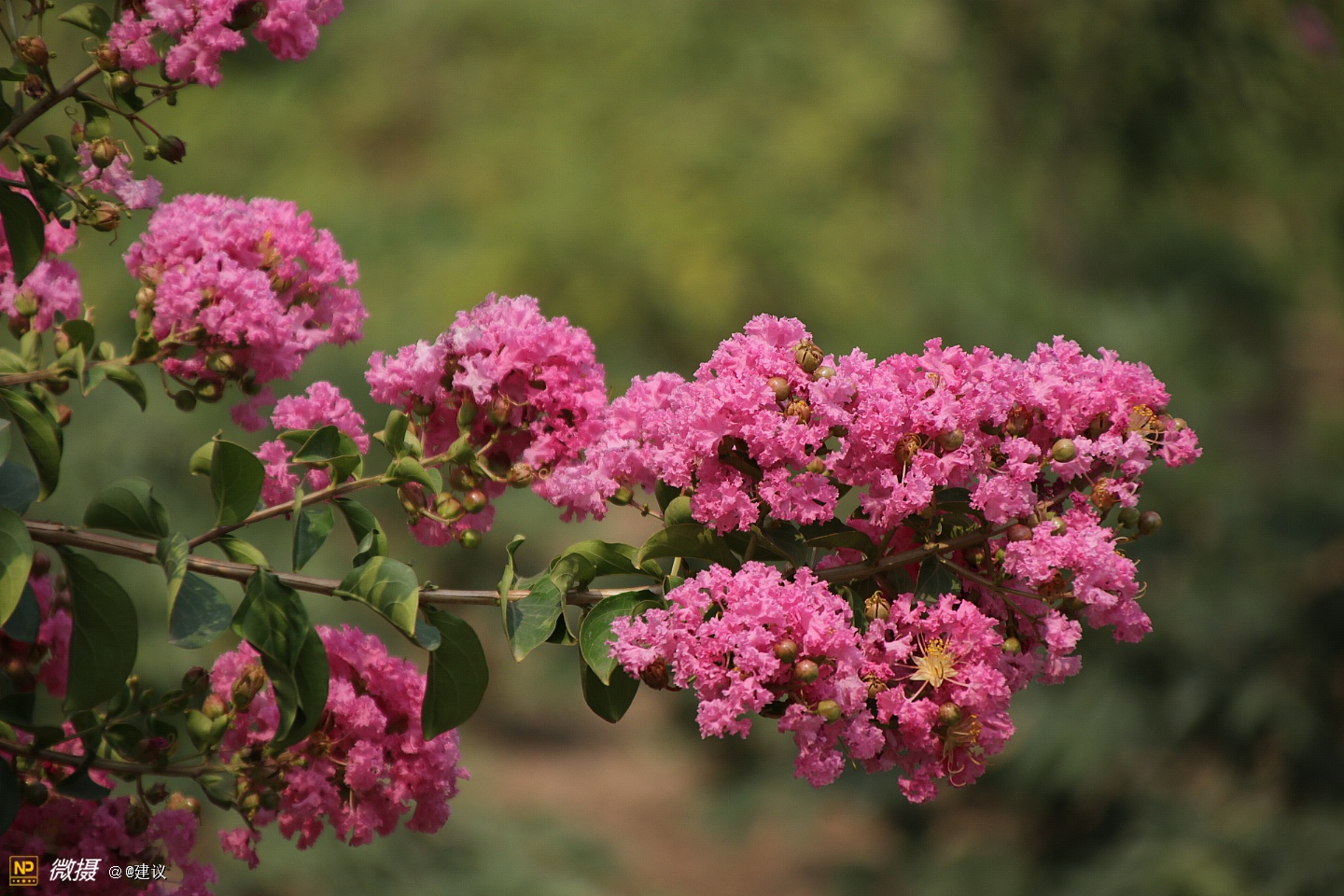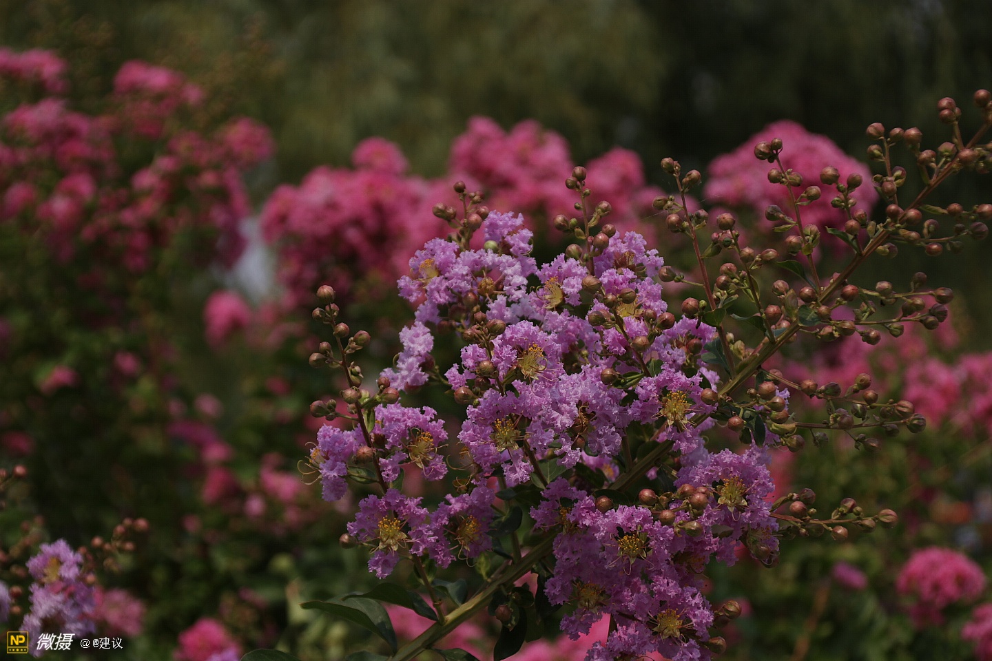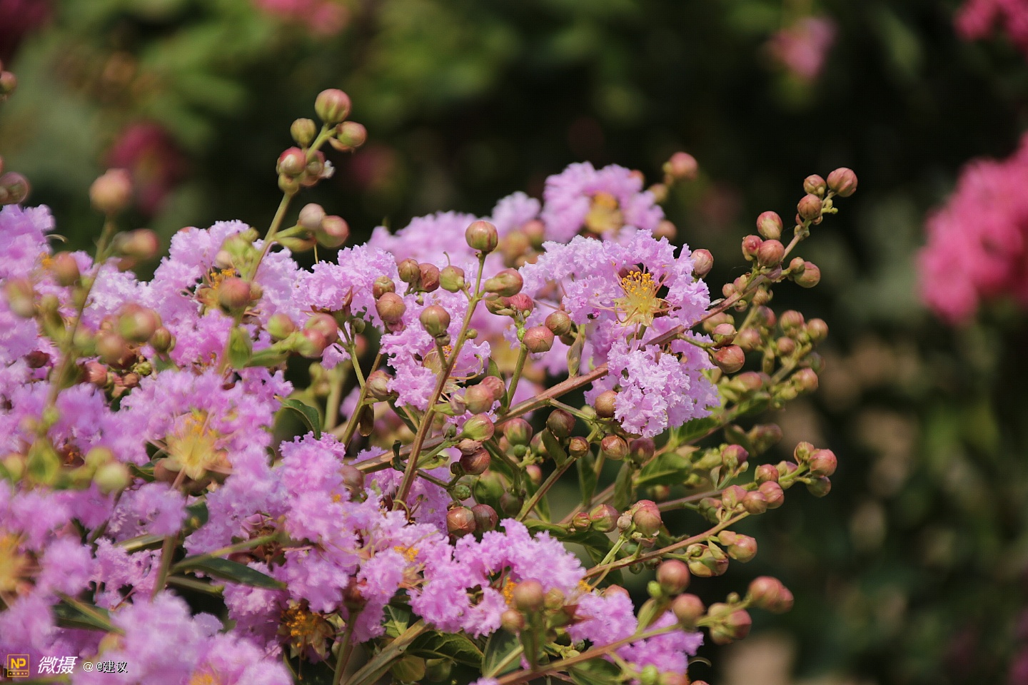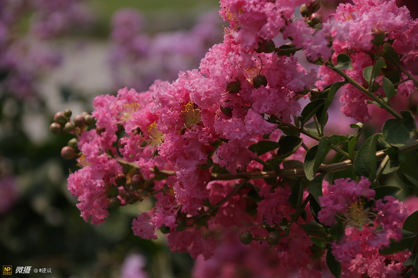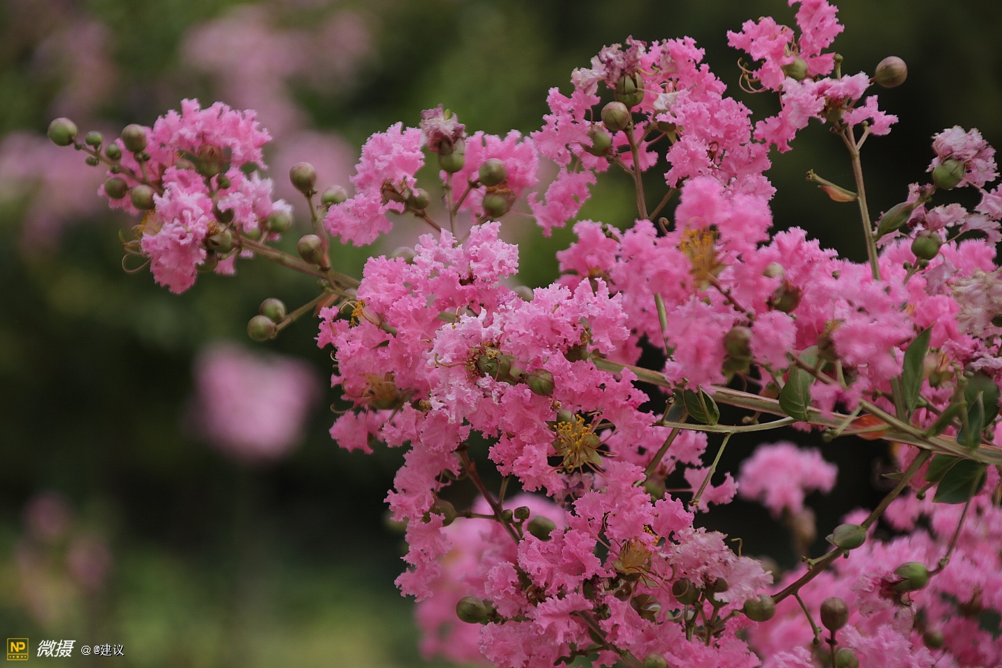 紫薇,别名:痒痒花、痒痒树、紫金花、紫兰花、蚊子花、西洋水杨梅、百日红、无皮树,拉丁文名:Lagerstroemia indica L. 千屈菜科、紫薇属落叶灌木或小乔木,高可达7米;树皮平滑,灰色或灰褐色;枝干多扭曲,小枝纤细,叶互生或有时对生,纸质,椭圆形、阔矩圆形或倒卵形,幼时绿色至黄色,成熟时或干燥时呈紫黑色,室背开裂;种子有翅,长约8毫米。花期6-9月,果期9-12月。紫薇树姿优美,树干光滑洁净,花色艳丽;开花时正当夏秋少花季节,花期长,故有“百日红”之称,又有“盛夏绿遮眼,此花红满堂”的赞语,是观花、观干、观根的盆景良材;根、皮、叶、花皆可入药。