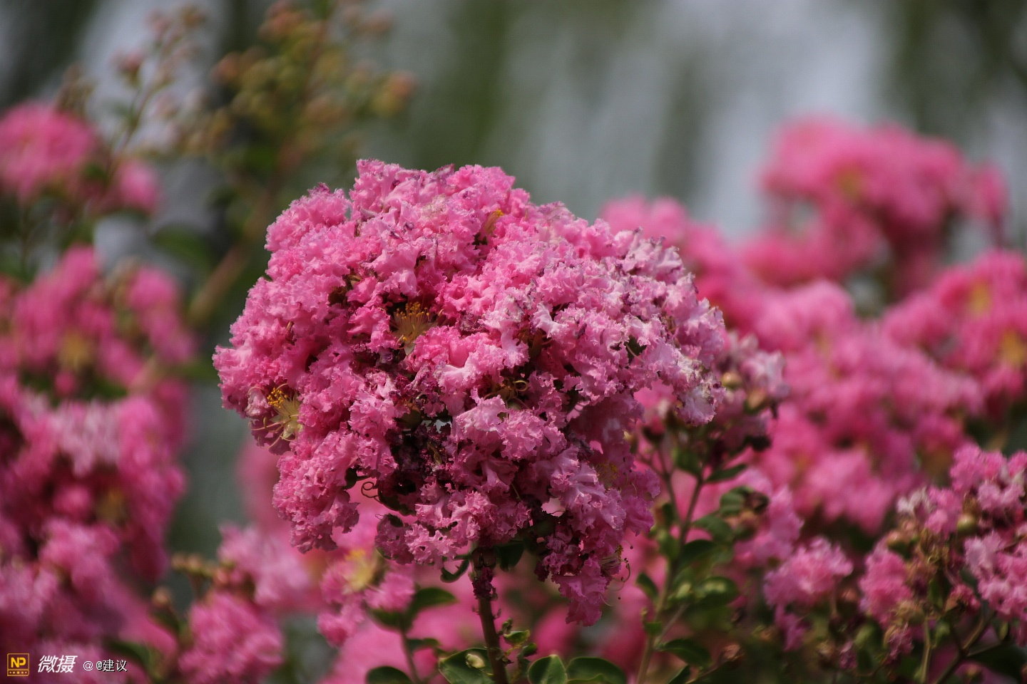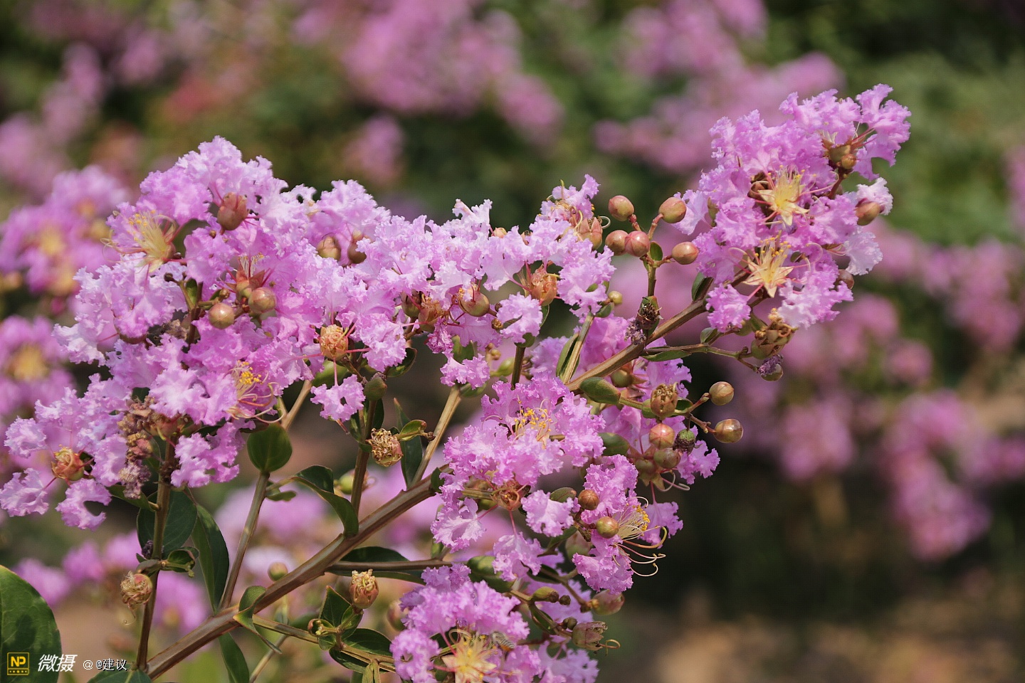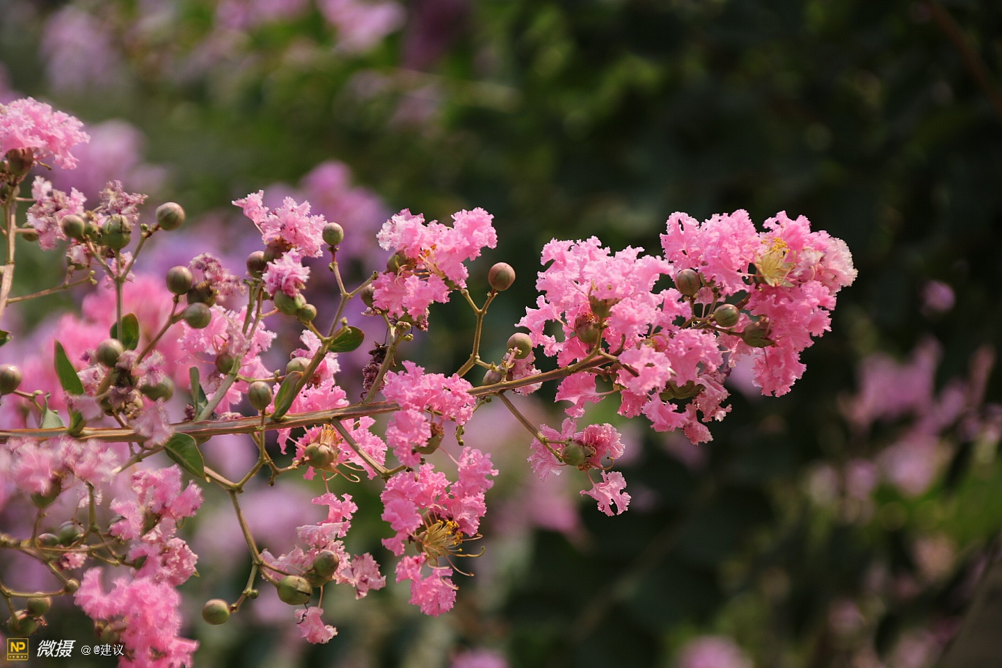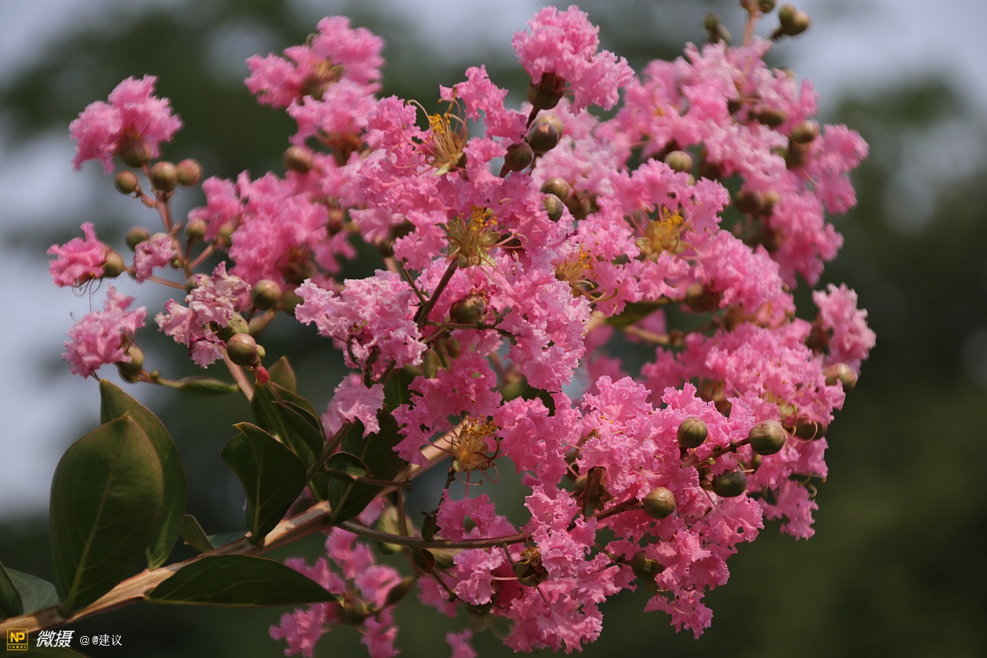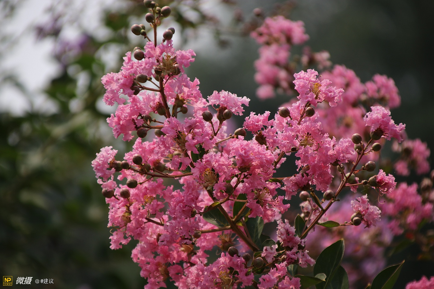 紫薇,别名:痒痒花、痒痒树、紫金花、紫兰花、蚊子花、西洋水杨梅、百日红、无皮树,拉丁文名:Lagerstroemia indica L. 千屈菜科、紫薇属落叶灌木或小乔木,高可达7米;树皮平滑,灰色或灰褐色;枝干多扭曲,小枝纤细,叶互生或有时对生,纸质,椭圆形、阔矩圆形或倒卵形,幼时绿色至黄色,成熟时或干燥时呈紫黑色,室背开裂;种子有翅,长约8毫米。花期6-9月,果期9-12月。紫薇树姿优美,树干光滑洁净,花色艳丽;开花时正当夏秋少花季节,花期长,故有“百日红”之称,又有“盛夏绿遮眼,此花红满堂”的赞语,是观花、观干、观根的盆景良材;根、皮、叶、花皆可入药。