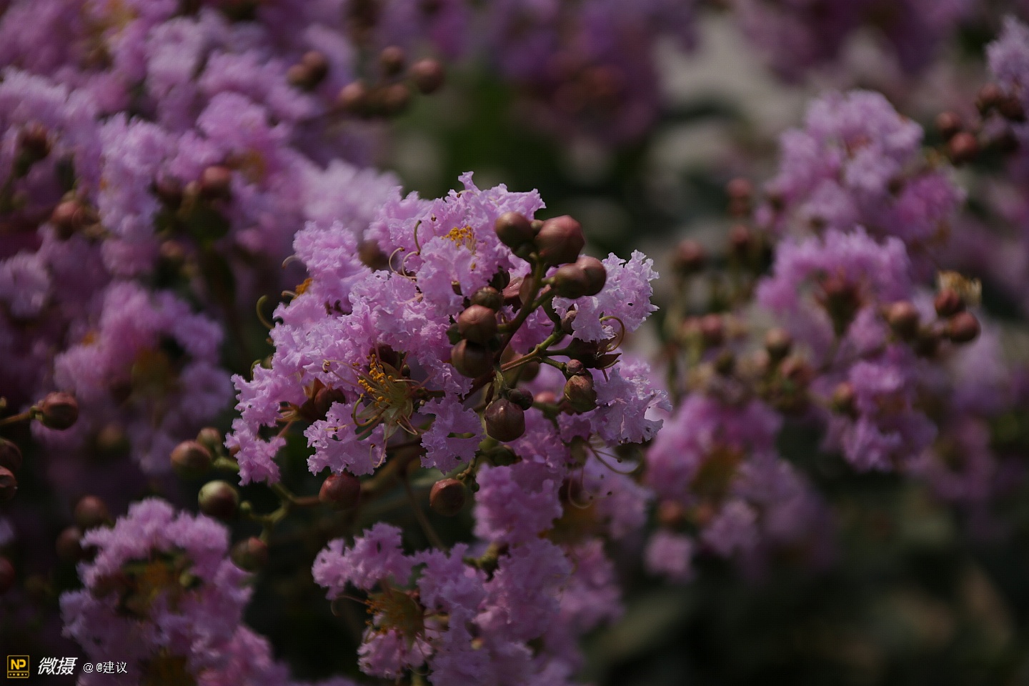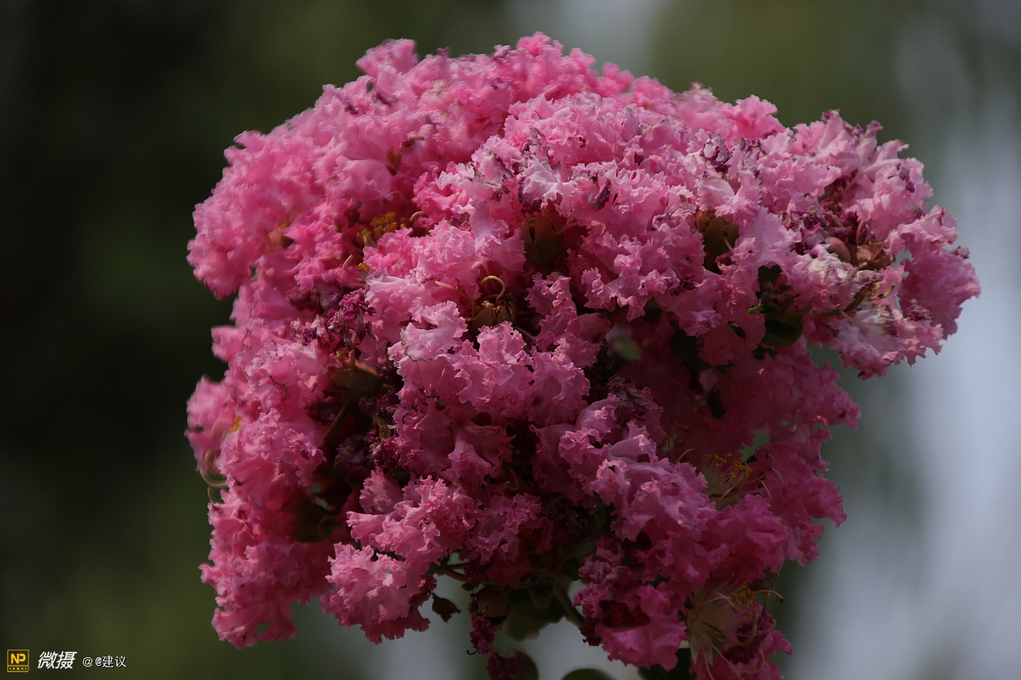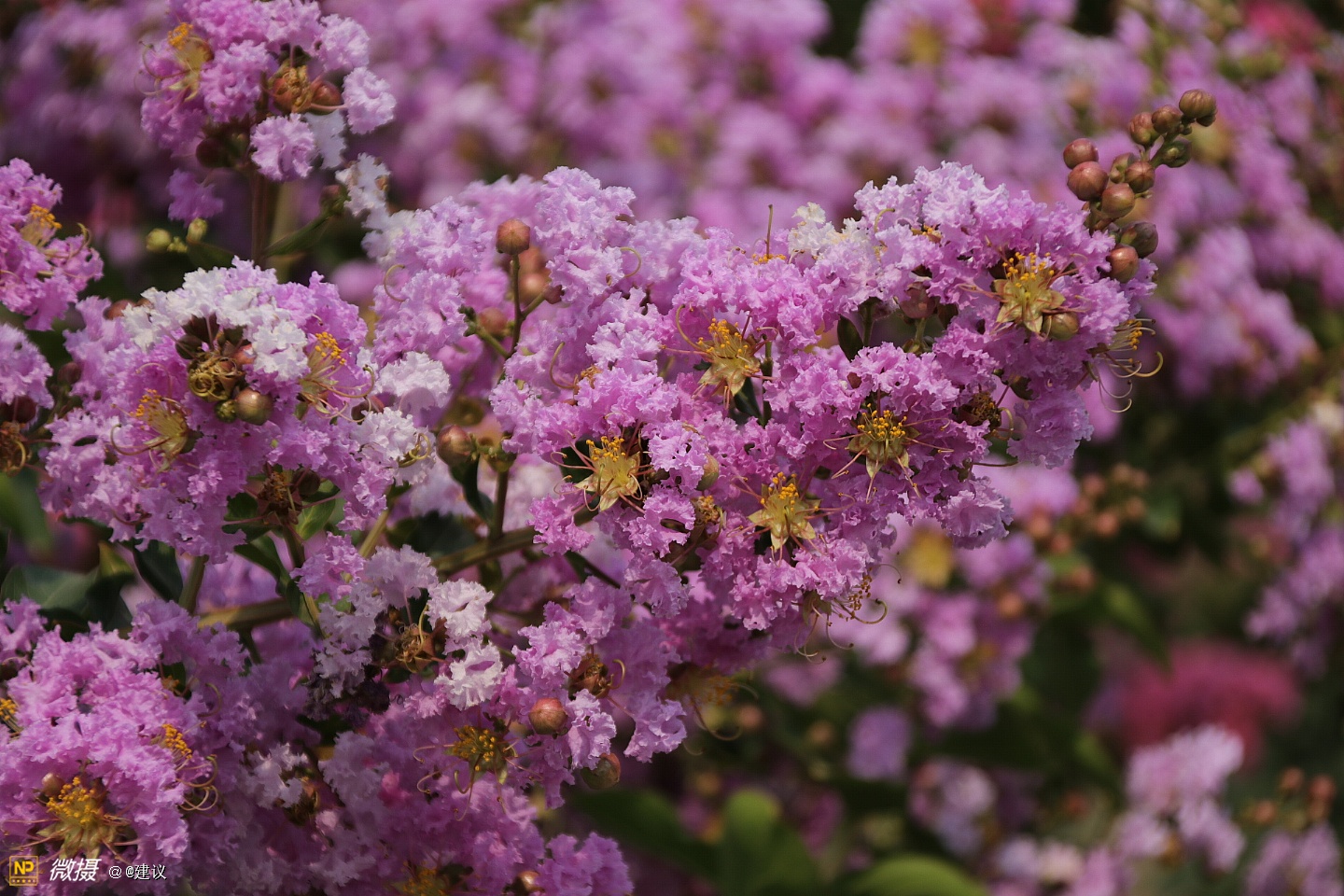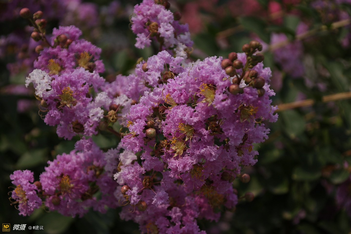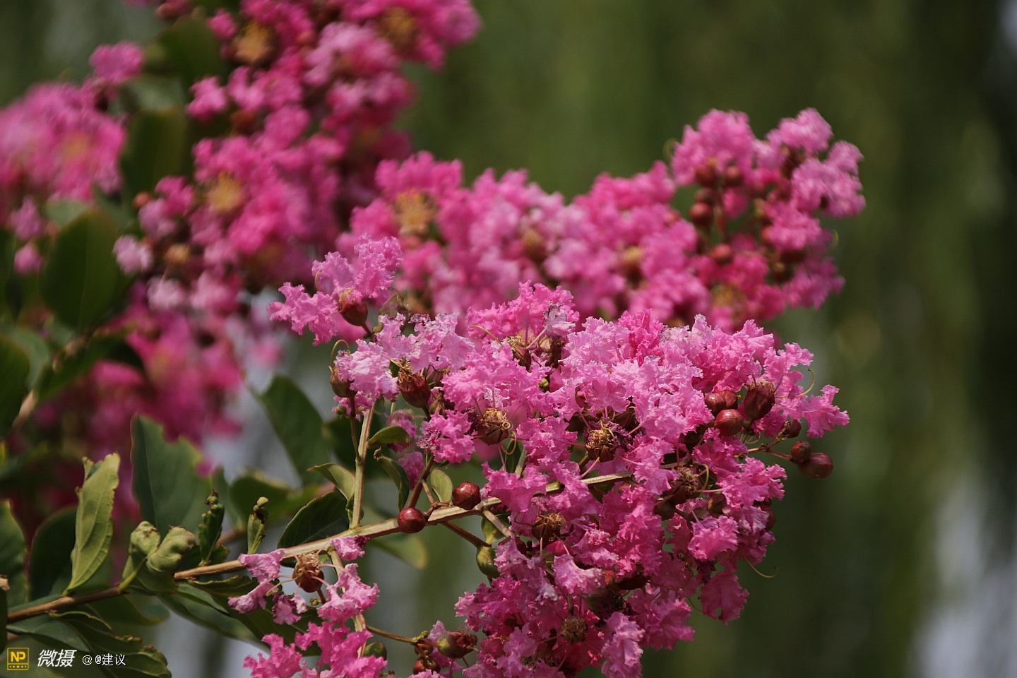 紫薇,别名:痒痒花、痒痒树、紫金花、紫兰花、蚊子花、西洋水杨梅、百日红、无皮树,拉丁文名:Lagerstroemia indica L. 千屈菜科、紫薇属落叶灌木或小乔木,高可达7米;树皮平滑,灰色或灰褐色;枝干多扭曲,小枝纤细,叶互生或有时对生,纸质,椭圆形、阔矩圆形或倒卵形,幼时绿色至黄色,成熟时或干燥时呈紫黑色,室背开裂;种子有翅,长约8毫米。花期6-9月,果期9-12月。紫薇树姿优美,树干光滑洁净,花色艳丽;开花时正当夏秋少花季节,花期长,故有“百日红”之称,又有“盛夏绿遮眼,此花红满堂”的赞语,是观花、观干、观根的盆景良材;根、皮、叶、花皆可入药。